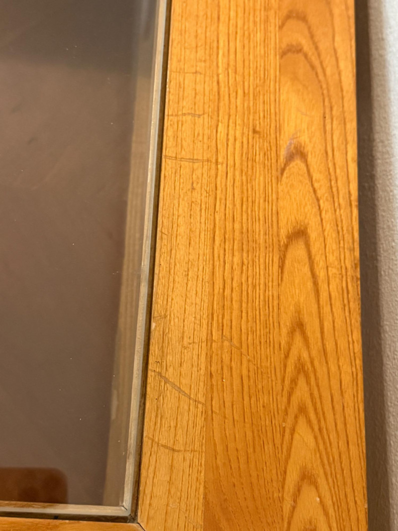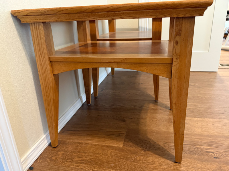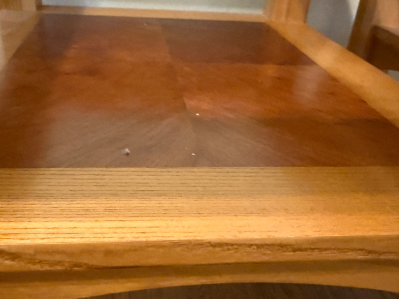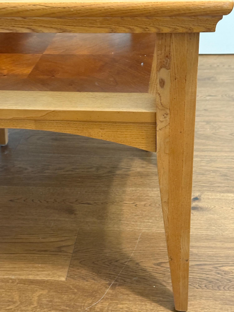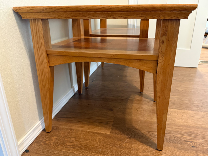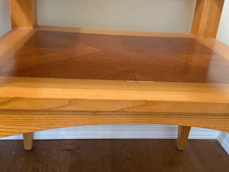 (2) Matching Glass Top Inlay Wood Light Oak Night Stand or Side Tables. Each measures 22”x26”x25.5” tall with 13.5”x17.5” glass insert over inlay wood shelf. One has 5-6 scratches to the top. See pics. Otherwise nice tables!