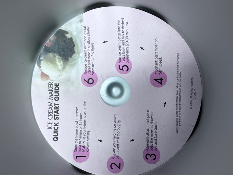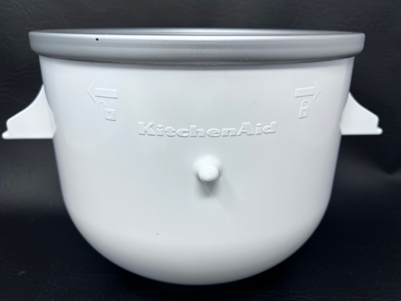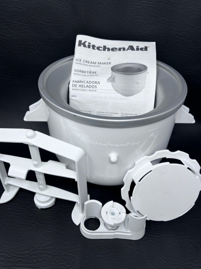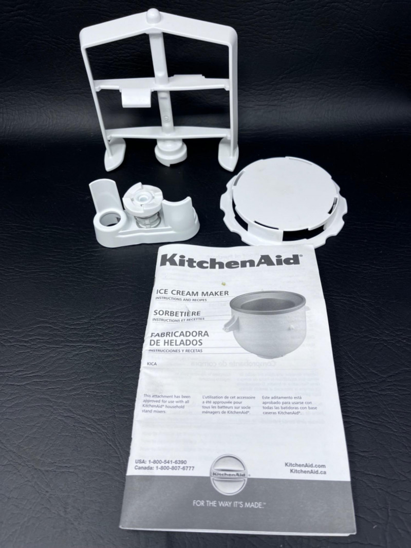 White KitchenAid Ice Cream Maker Attachment Includes the freeze bowl, dasher, and drive assembly. Manual included.