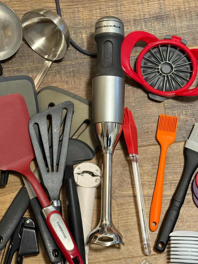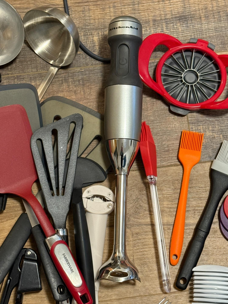 KitchenAid Immersion Blender & Misc Kitchen Collection KitchenAid Immersion blender stainless model KHB1231CU Multiples of some. A lot of quality cooking items.
