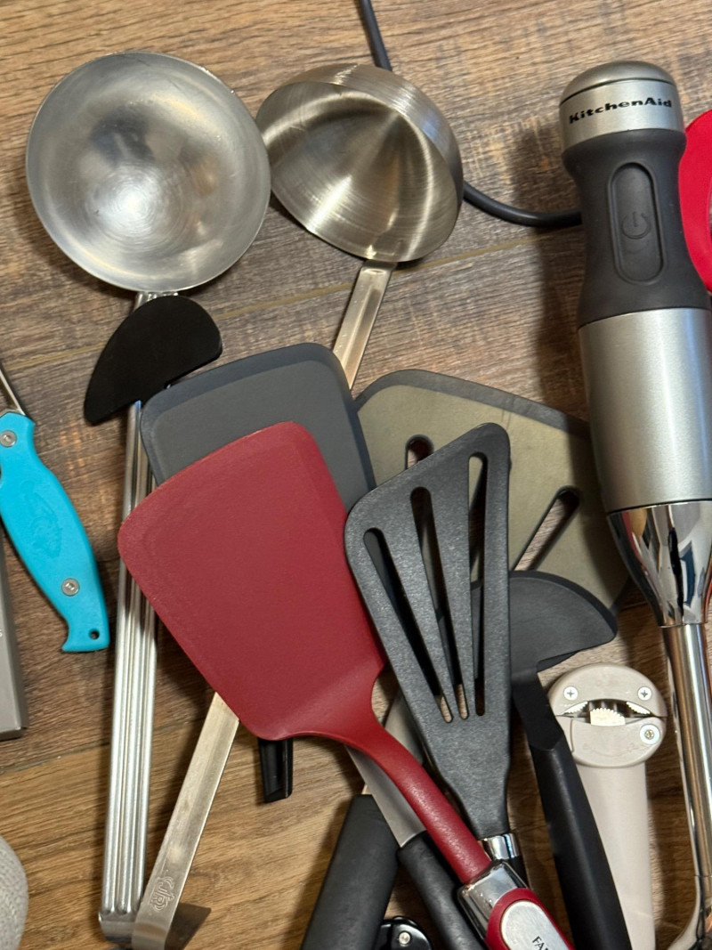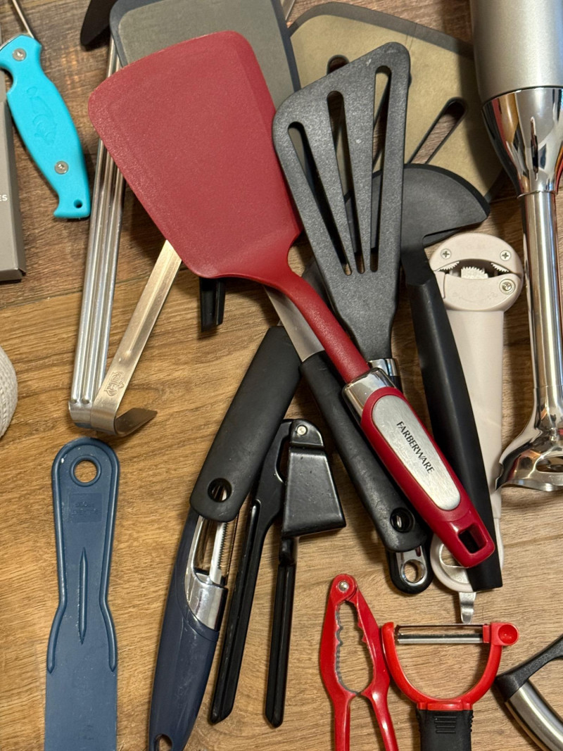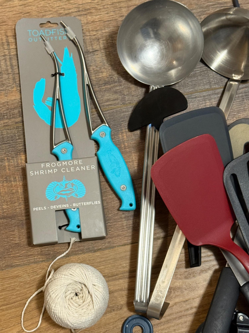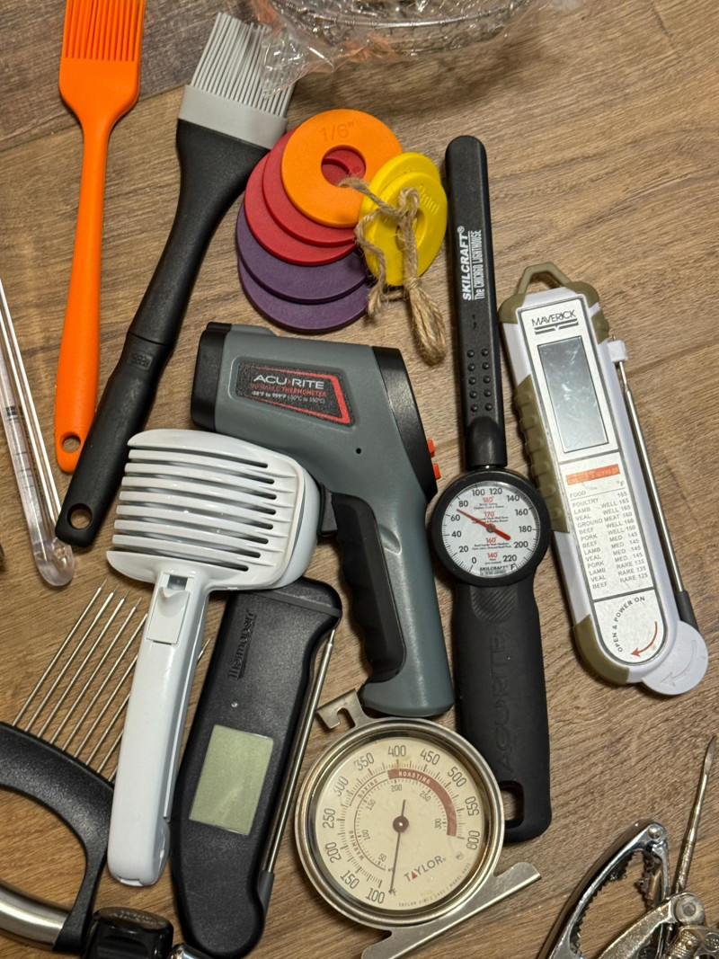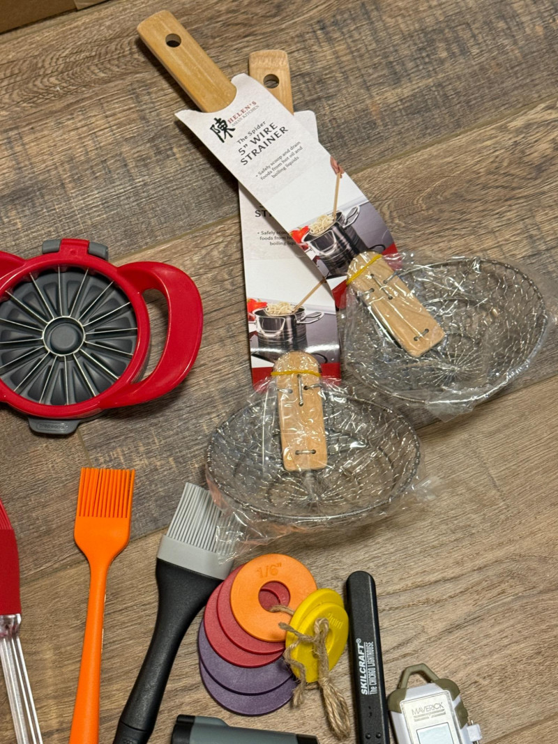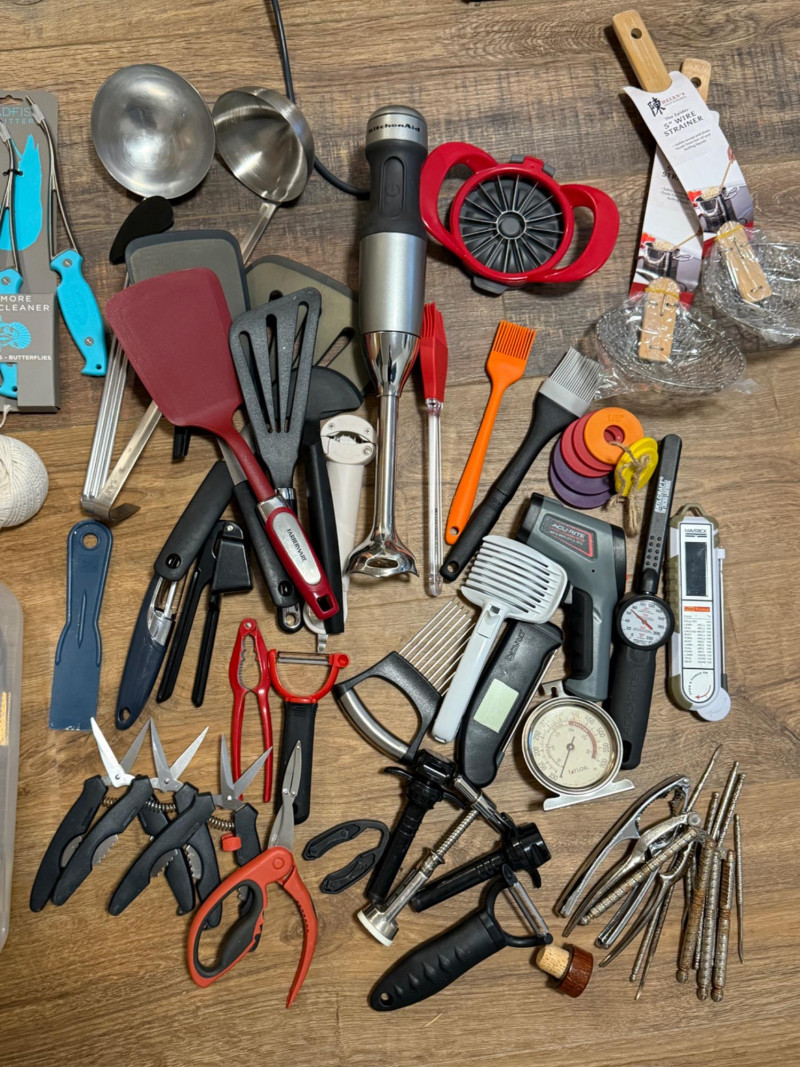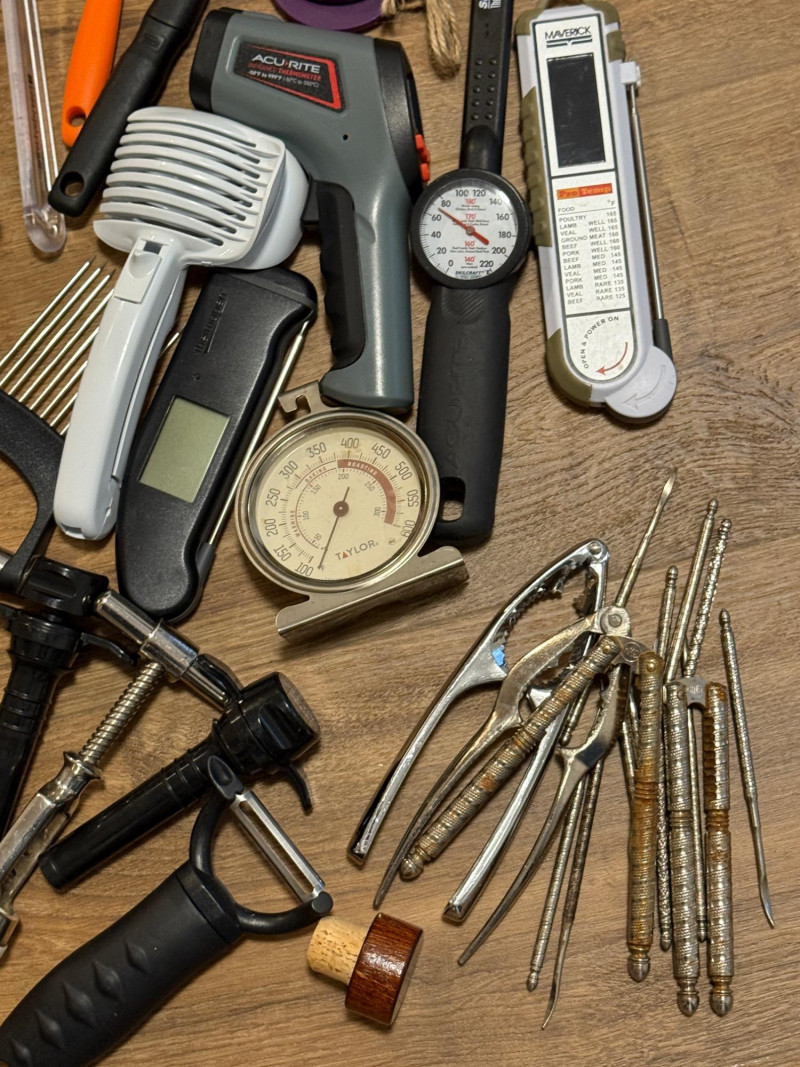 thermometers, nut and crab, crackers, peelers, wine openers, spatulas, ladles, shrimp cleaners, pastry brushes, strainers, fondue forks, scissors, garlic press, and more.