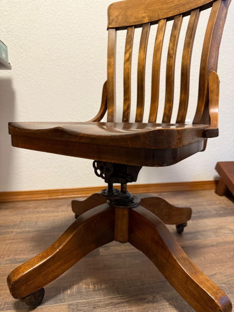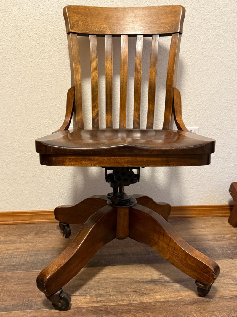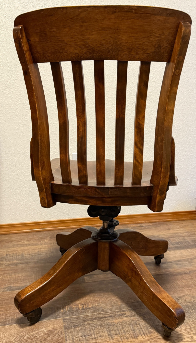 Taylor Chair Company antique wooden swivel office chair, likely made of oak. These chairs, often referred to as "banker's chairs," typically date to the early 20th century, specifically the 1910s to 1940s. Caster wheel base is 28”x28” chair seat is 18”x18” at current adjustment the back is 35” tall.