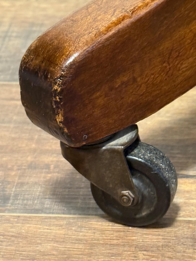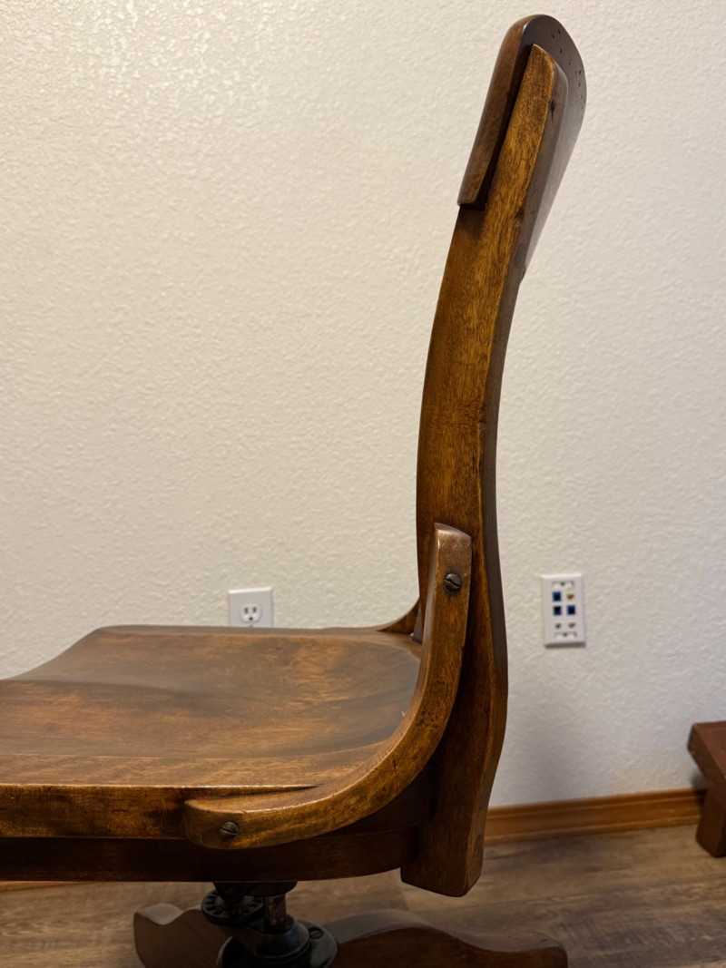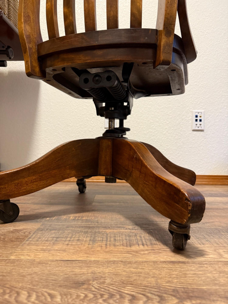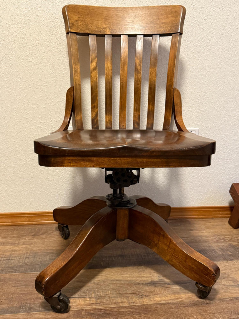 Taylor Chair Company antique wooden swivel office chair, likely made of oak. These chairs, often referred to as "banker's chairs," typically date to the early 20th century, specifically the 1910s to 1940s. Caster wheel base is 28”x28” chair seat is 18”x18” at current adjustment the back is 35” tall.