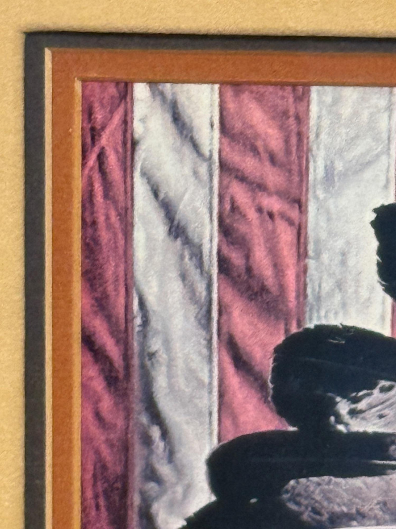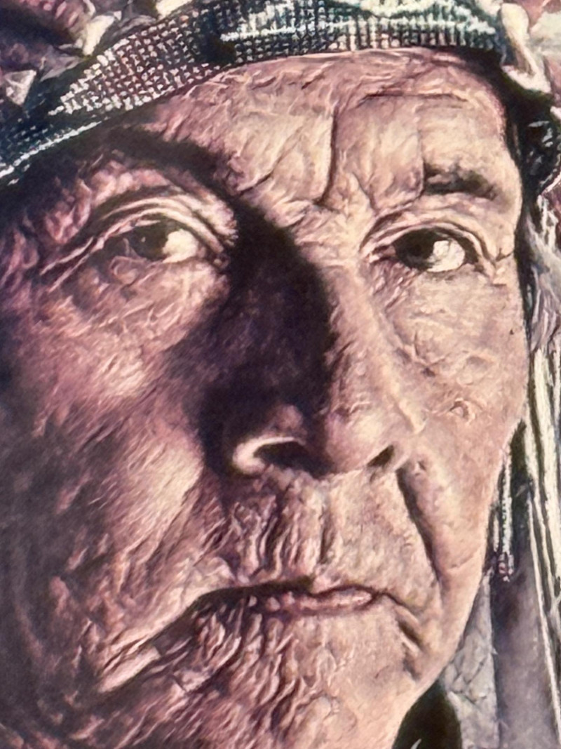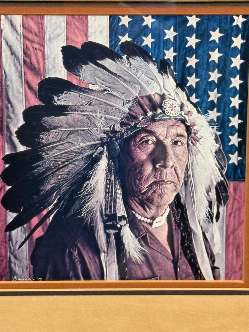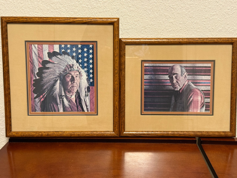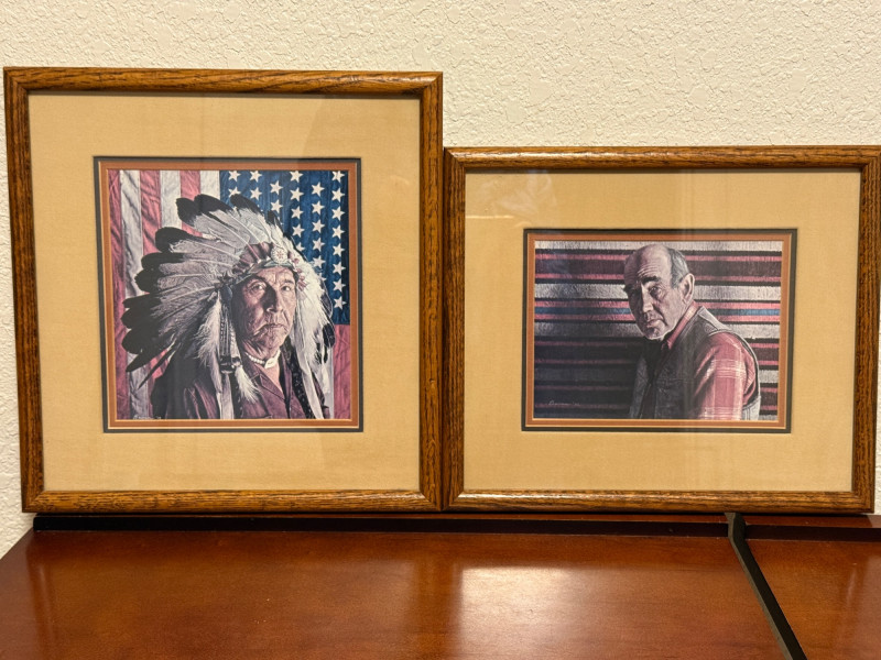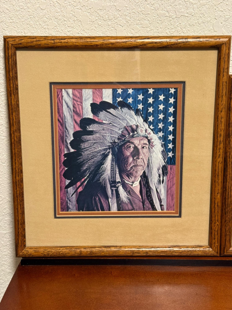 (2) 1970’s Offset Lithographs By American Artist James Bama “Dean Moore - Cowboy, Half Indian, Descendant of Red Cloud” Created in 1973 by the American artist James Bama. It is an oil on Masonite piece. James Bama is known for his realistic depictions of Western American culture, and this portrait is a notable example of his work. Bama frequently focused on capturing the authentic faces and details of people living in the contemporary American West, such as cowboys and Native American individuals, often using models from the Wind River Reservation in Wyoming. The work captures a powerful, intimate moment, emphasizing the subject's character and the rich textures of his clothing and the striped background. 12.75”x11” matted under glass in a oak wood frame. Chester Medicine Crow, the son of a prominent 19th-century Crow chief. The portrait was painted by James Bama in 1972, making Chester the first male Indian the artist ever painted. The flag in the background is his father's 46-star American flag, which dates back to around 1900. The print is a limited edition lithograph, signed and numbered by the artist. James Bama noted the irony of Native Americans using the American flag motif, despite historical injustices, and that Chester was proud of his heritage and accomplishments. 12.5”x12.5” matted under glass in a oak wood frame.