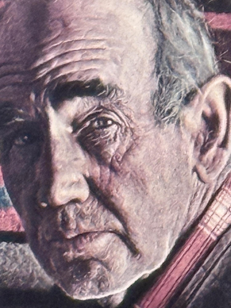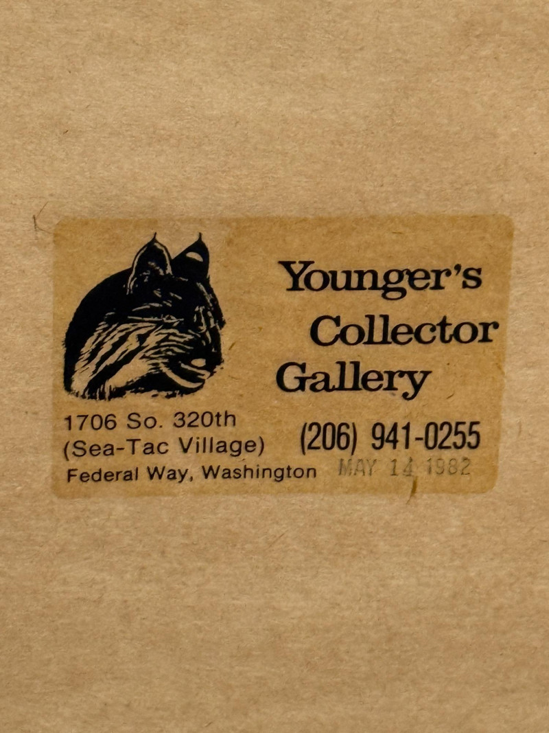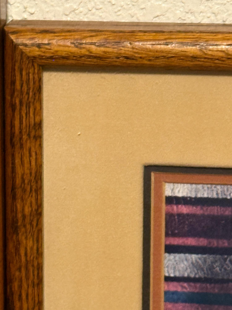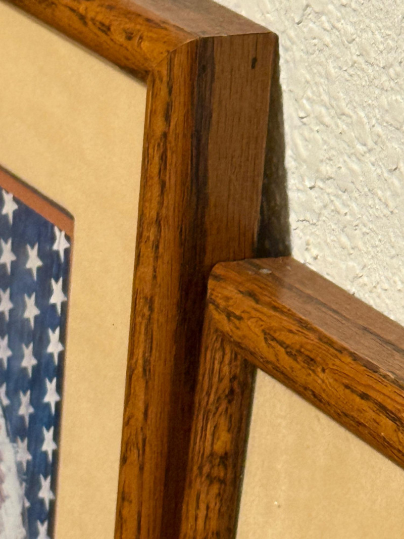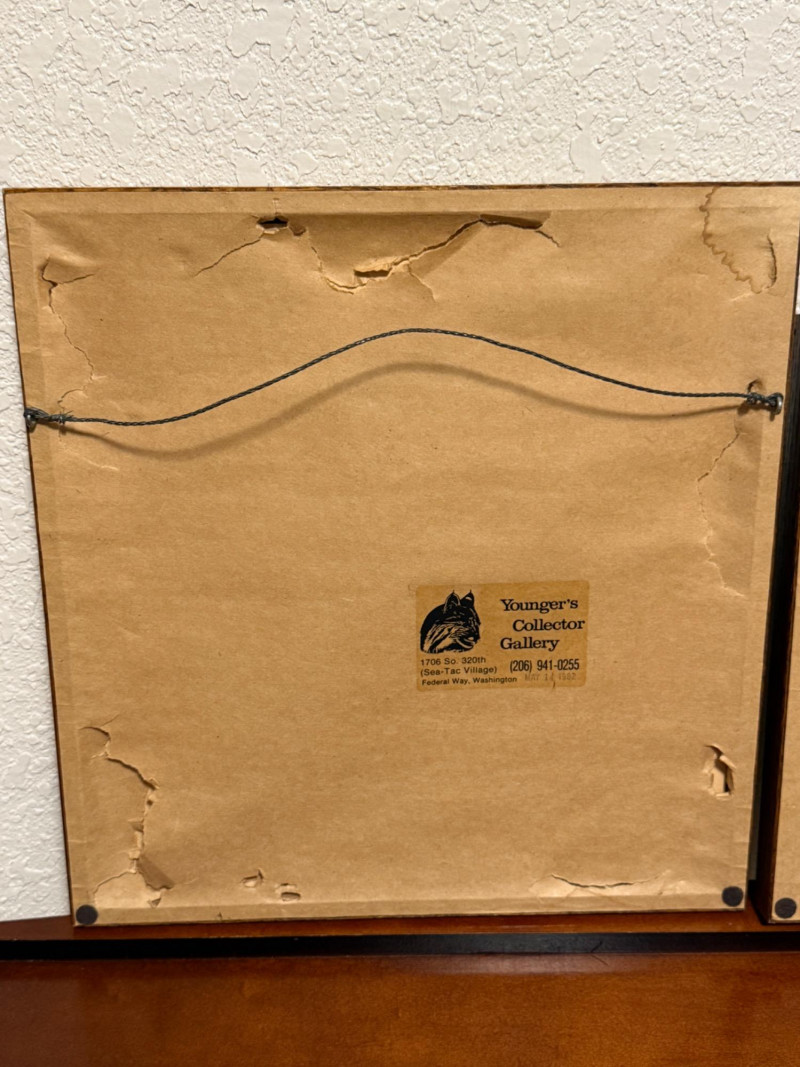 (2) 1970’s Offset Lithographs By American Artist James Bama “Dean Moore - Cowboy, Half Indian, Descendant of Red Cloud” Created in 1973 by the American artist James Bama. It is an oil on Masonite piece. James Bama is known for his realistic depictions of Western American culture, and this portrait is a notable example of his work. Bama frequently focused on capturing the authentic faces and details of people living in the contemporary American West, such as cowboys and Native American individuals, often using models from the Wind River Reservation in Wyoming. The work captures a powerful, intimate moment, emphasizing the subject's character and the rich textures of his clothing and the striped background. 12.75”x11” matted under glass in a oak wood frame. Chester Medicine Crow, the son of a prominent 19th-century Crow chief. The portrait was painted by James Bama in 1972, making Chester the first male Indian the artist ever painted. The flag in the background is his father's 46-star American flag, which dates back to around 1900. The print is a limited edition lithograph, signed and numbered by the artist. James Bama noted the irony of Native Americans using the American flag motif, despite historical injustices, and that Chester was proud of his heritage and accomplishments. 12.5”x12.5” matted under glass in a oak wood frame.
