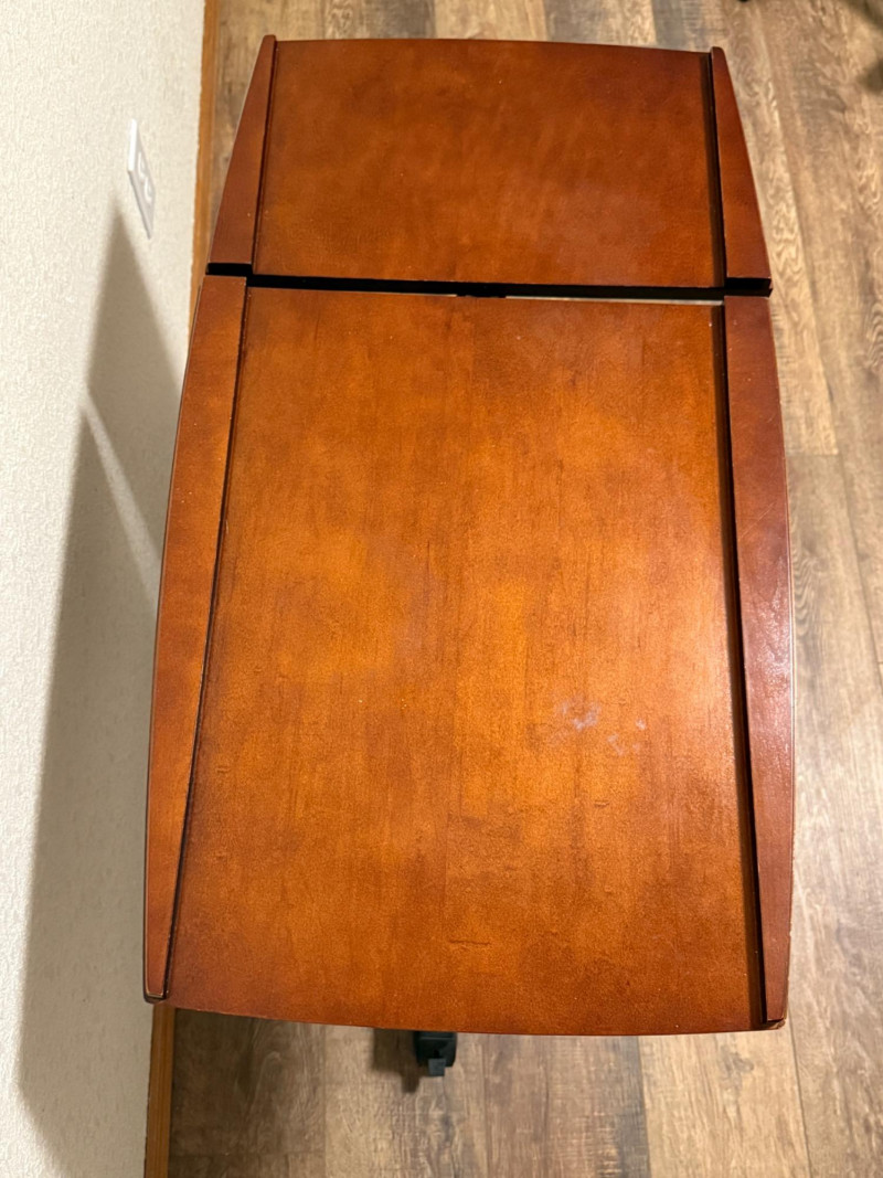 Adjustable rolling side or over-bed table. This type of multi-functional table is designed for use over a bed, sofa, or chair. The tabletop can be tilted up to 45°, allowing you to find the most comfortable angle for your activity. It features three locking wheels for easy movement, and its C-shaped base is designed to slide under beds, sofas, or chairs. The table can also fold upright for compact storage.