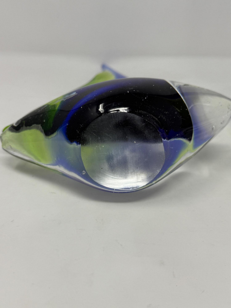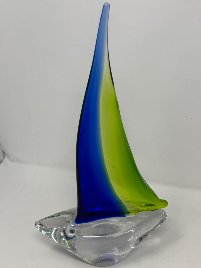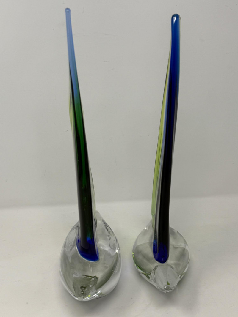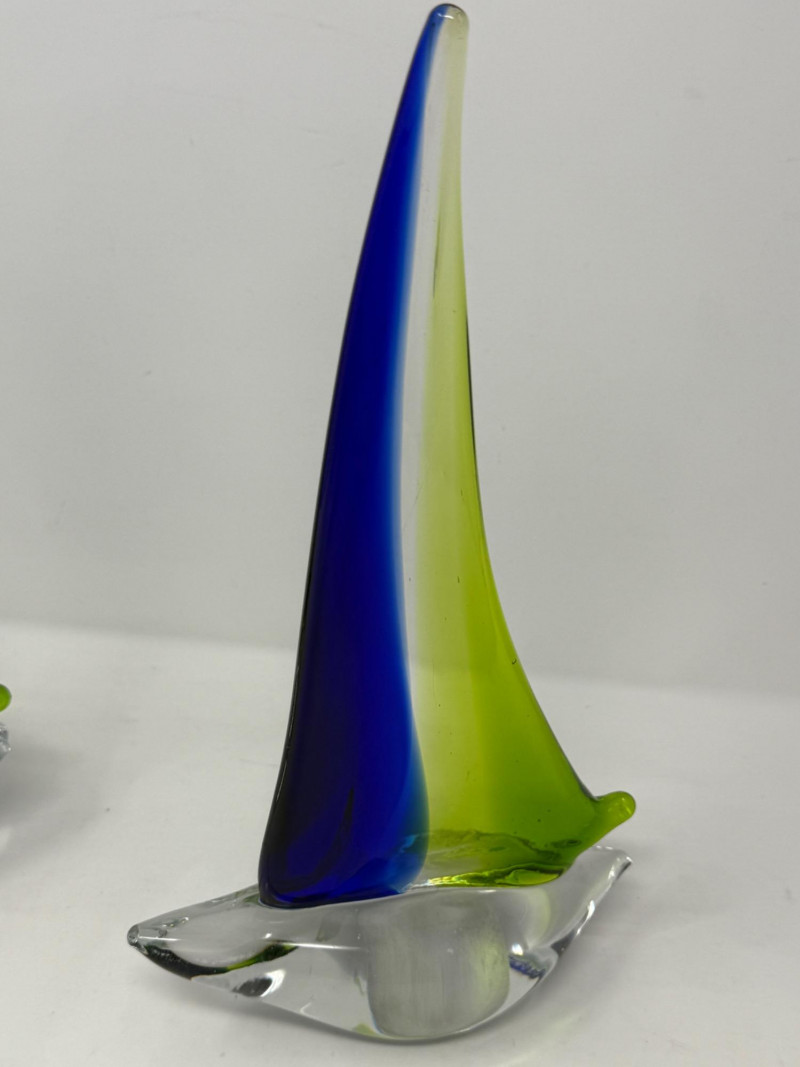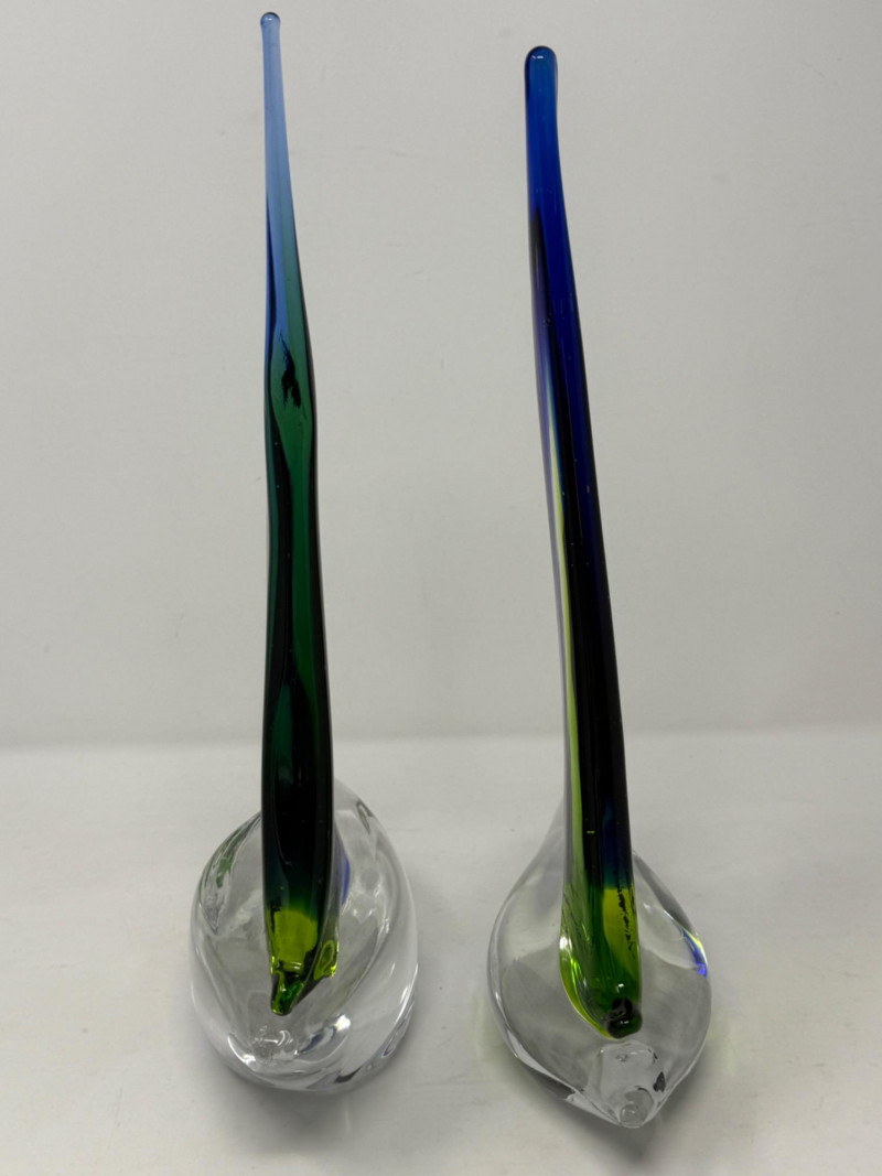 Murano Style Art Glass Sailboats Each measures 6.5”x12” Vivid blue and green sails with a clear glass boat.