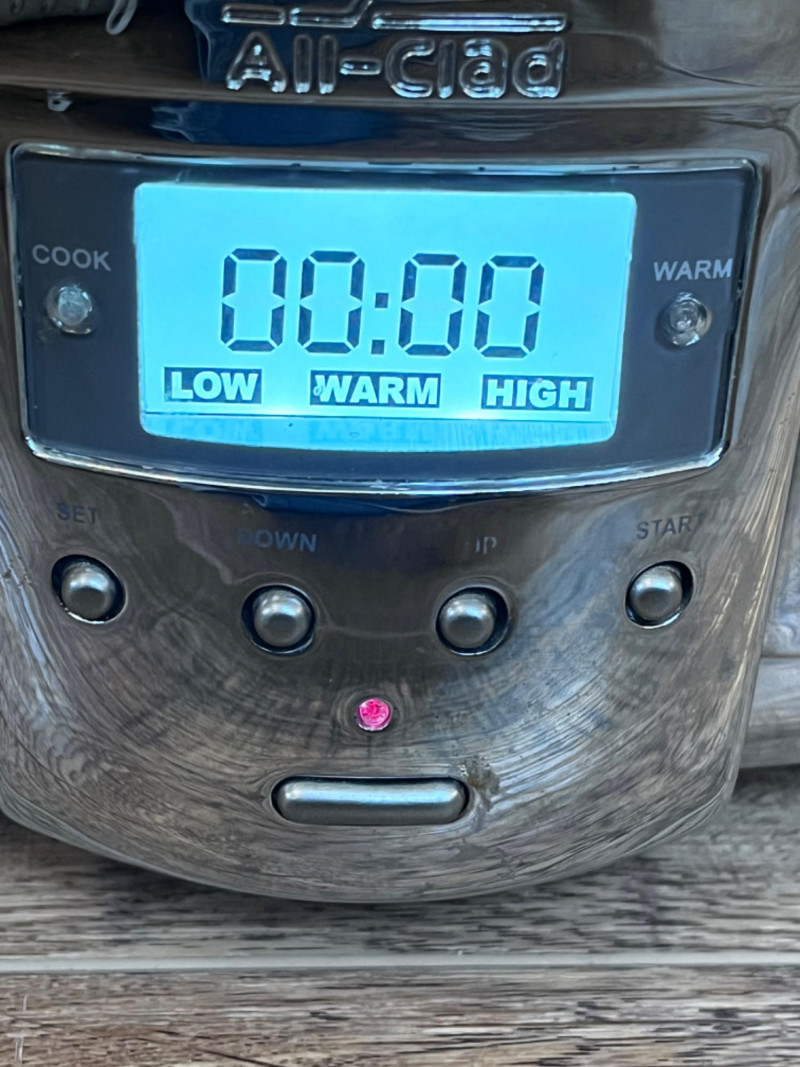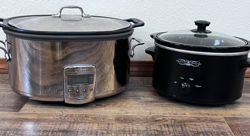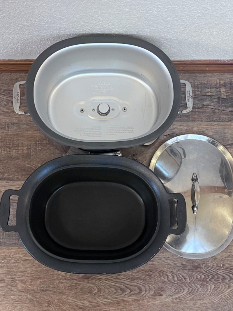 Bella Cucina Artful Food Slow Cooker & All-Clad Slow Cooker Black 4 QT. Programmable slow cooker. Removable stoneware crock. Tested: Turns on. 14”x9.5”x7” Stainless Steel All-Clad programmable slow cooker. 7 QTS. Removable cast aluminum insert & stainless steel lid. Features Low, high, and high/low and an automatic keep-warm function. Tested: Turns on. 18.5”x11.5”x8”