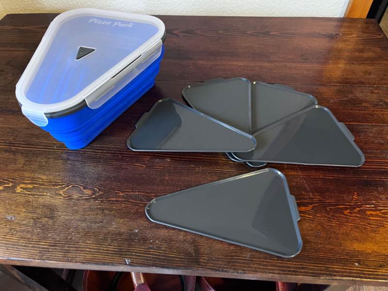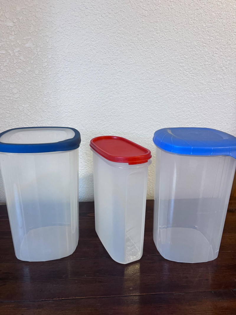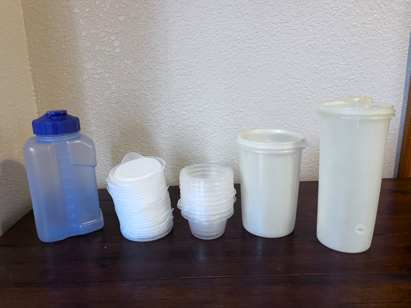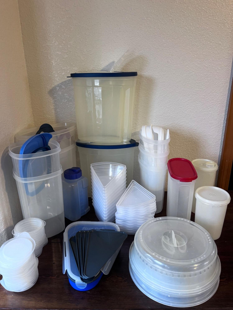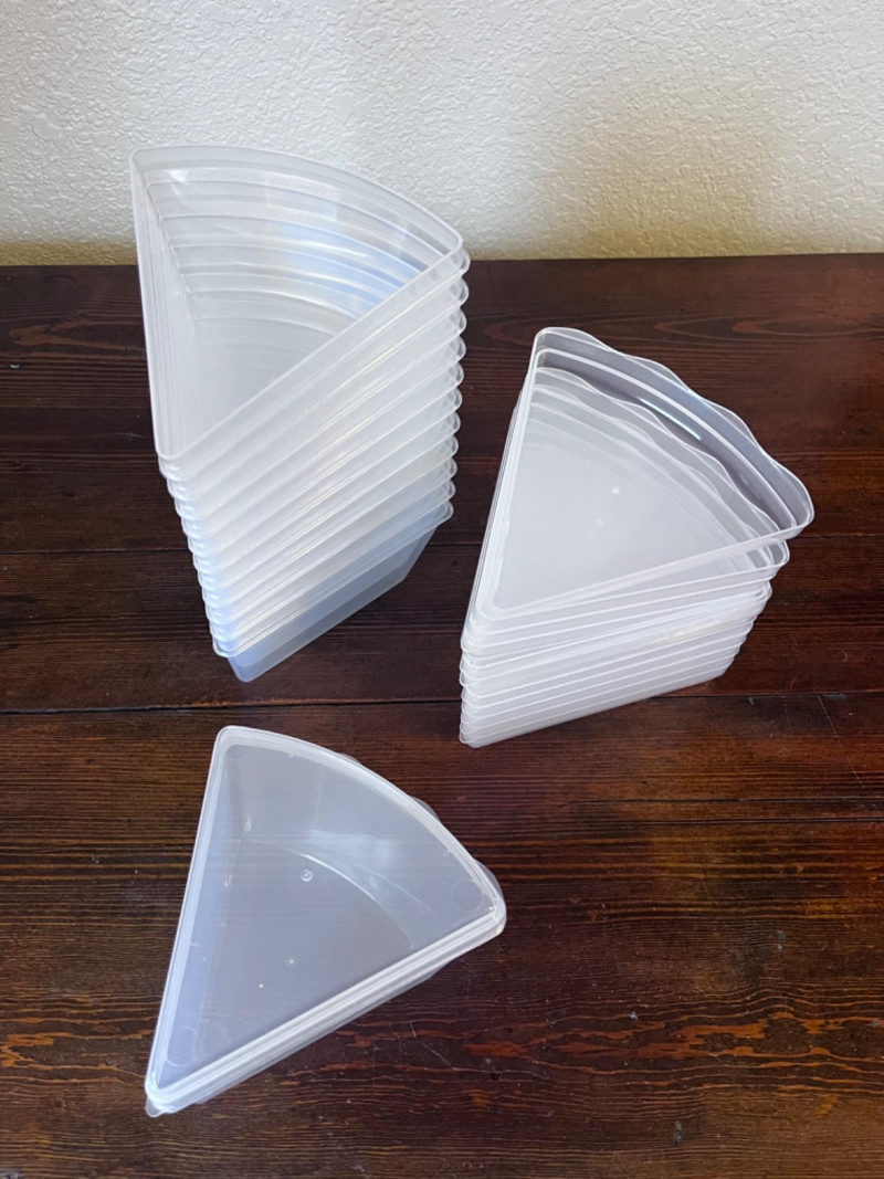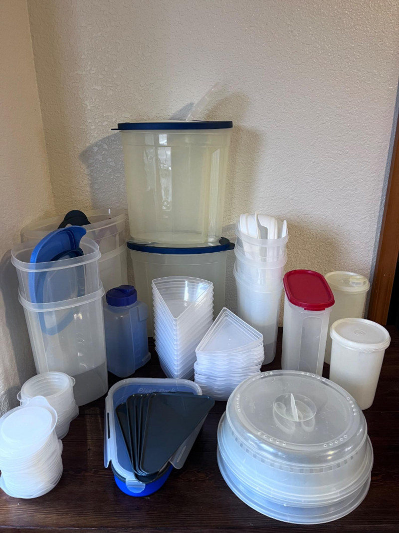 Food Storage Solutions Two Rubbermaid 4.5 QT. containers. Four small pizza trays. Pizza pack extendable pizza storage. Nine sauce containers & twenty-one lids. Four cake container lids. Twelve pie slice containers & lids. Tupperware cylinder with lid and opening. Short Tupperware cylinder with lid. 30 OZ container with lid. Tupperware 9 3/4 cups container with lid.