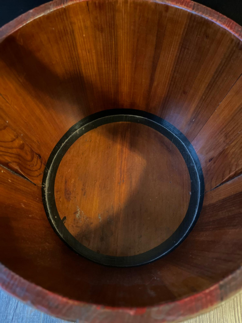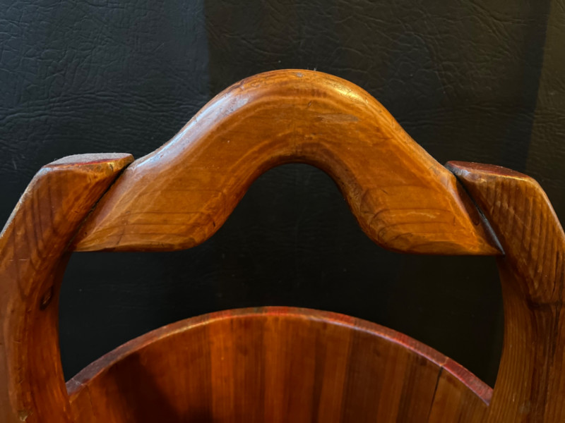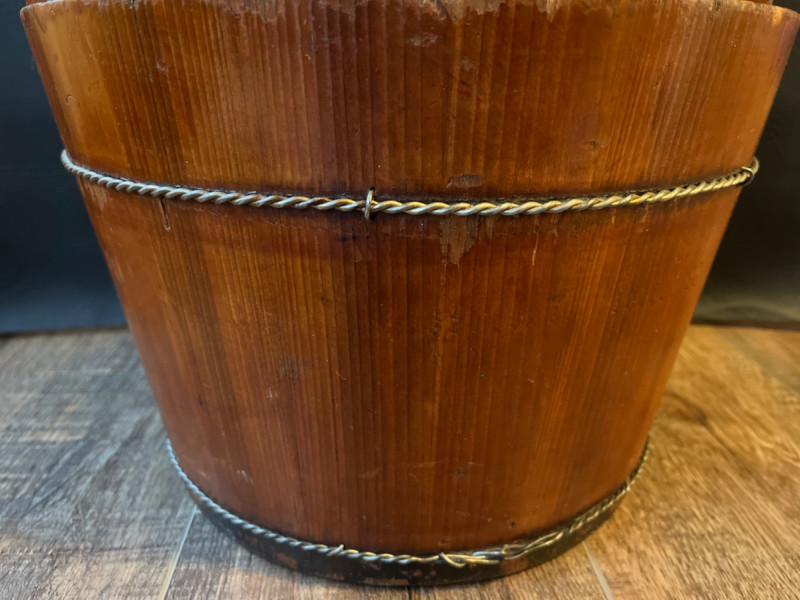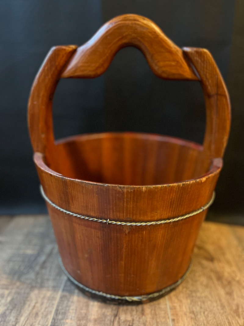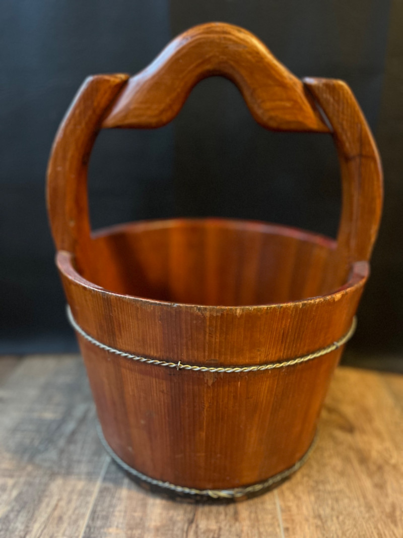 Antique Chinese Elmwood Water Bucket Constructed from durable elm wood with a warm finish. Features a distinctive, hand-arched or curved wooden handle and metal (often iron or bronze) bands. Made using stave construction and secured with dovetail joints and/or wooden pegs. 12.5”x17”