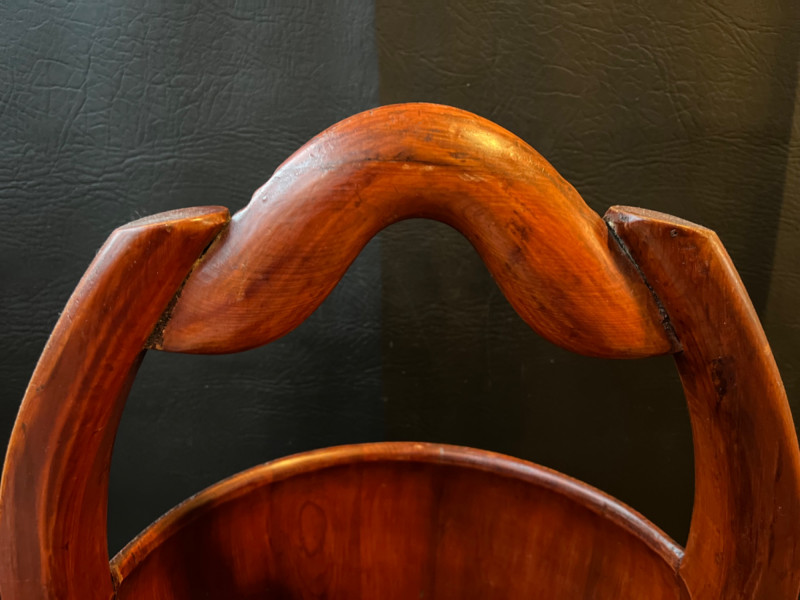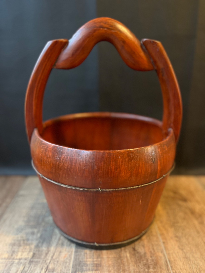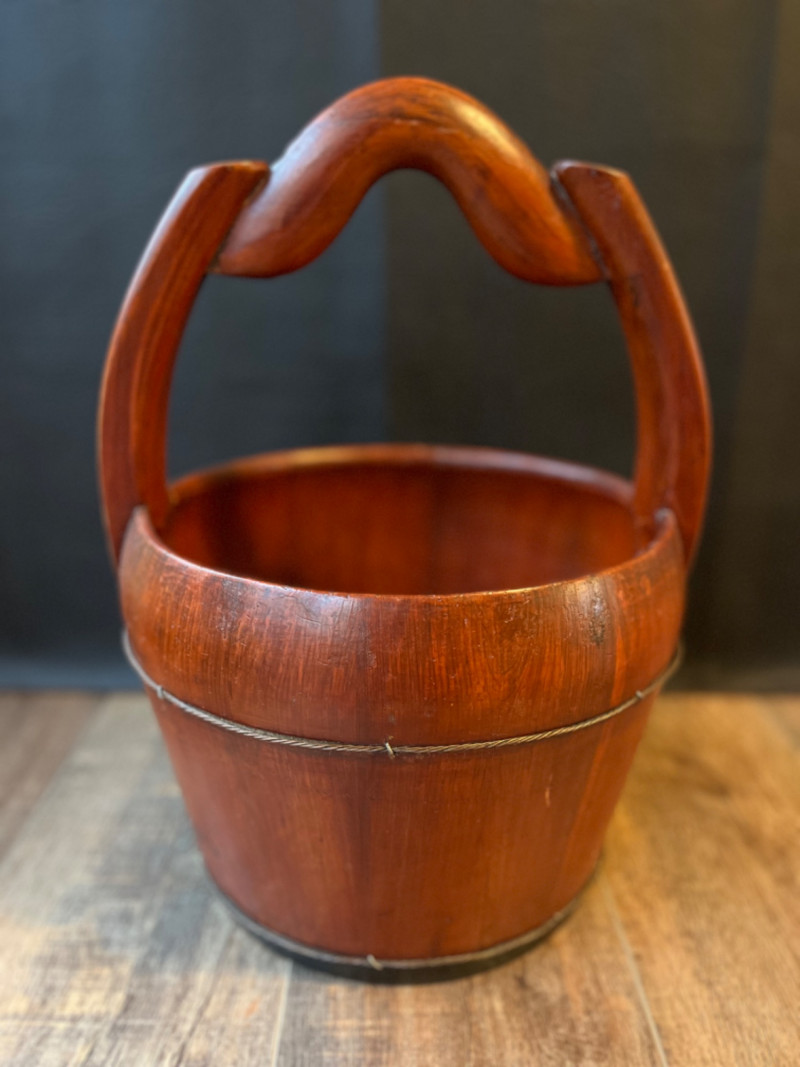 Antique Southern Chinese Wooden Bucket It features a large, curving handle, often carved for a better grip, designed for ease of carrying, sometimes via a carrying pole or yoke. The wood typically develops a rich, dark patina over time due to age and use, which adds to its rustic and authentic appeal.