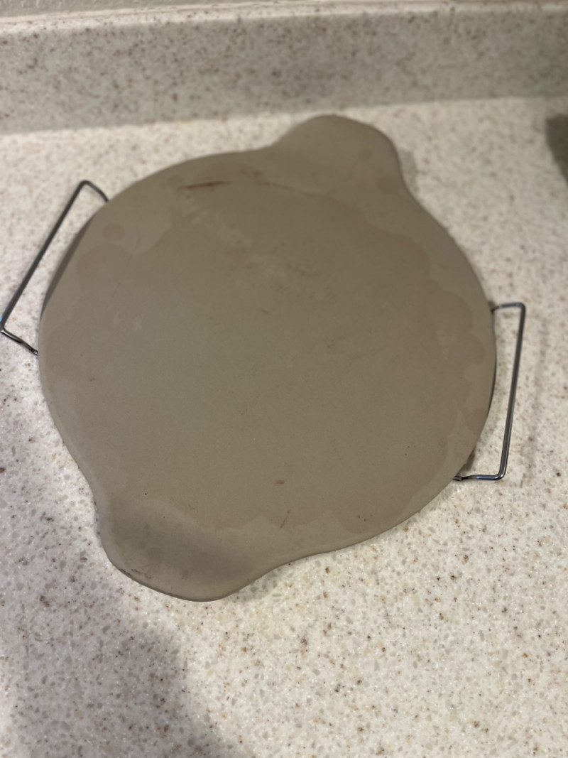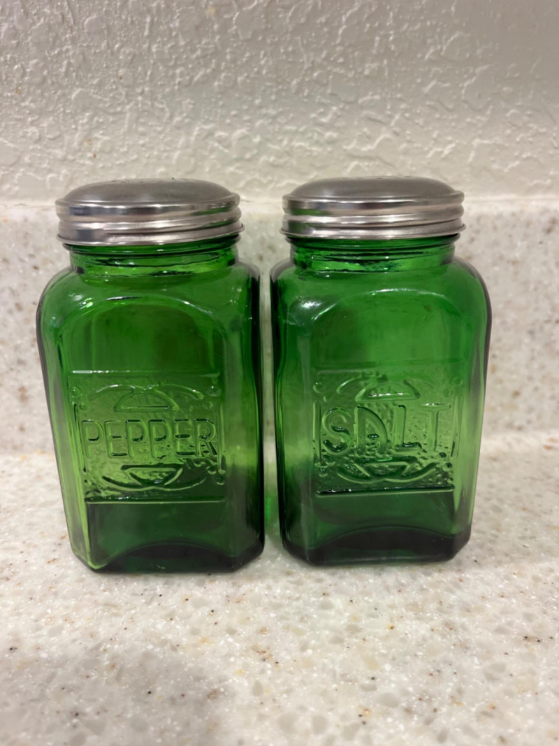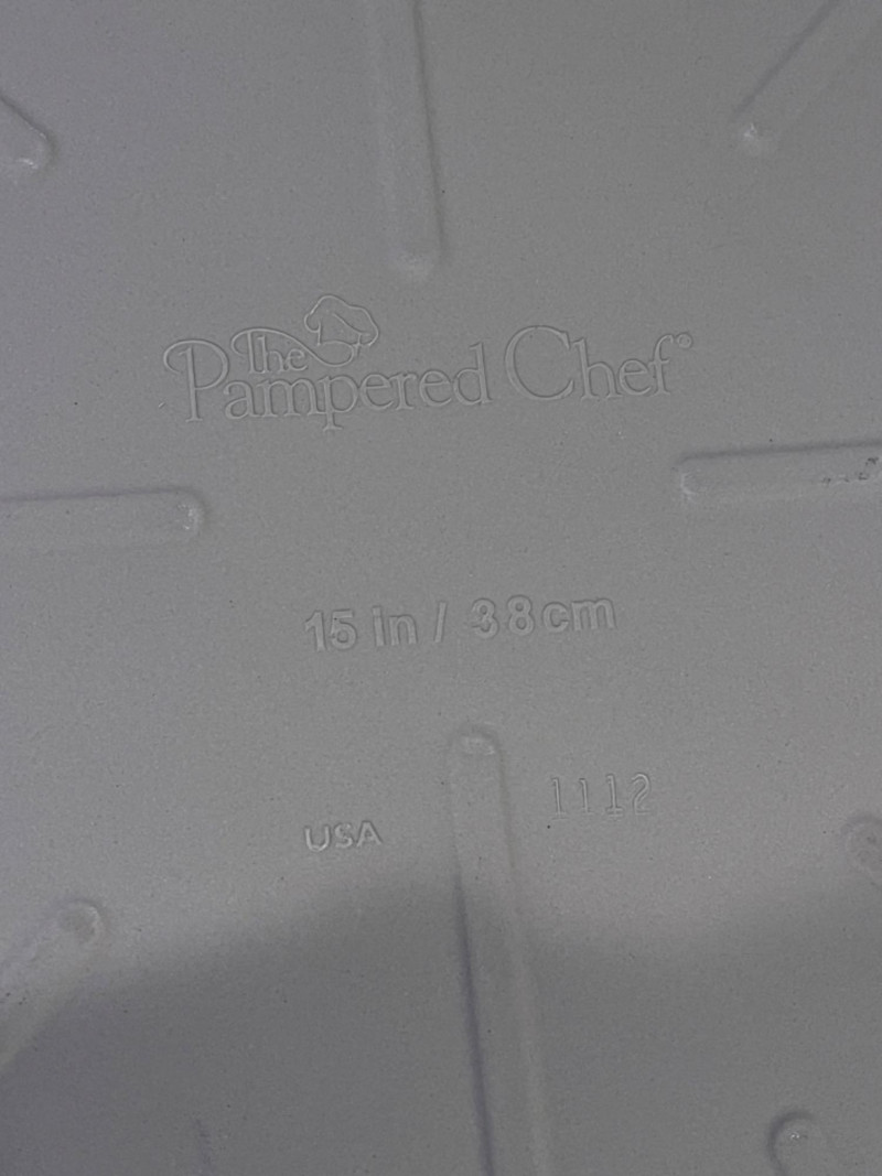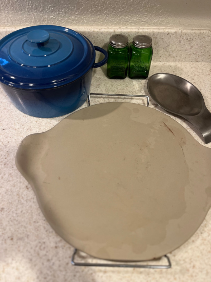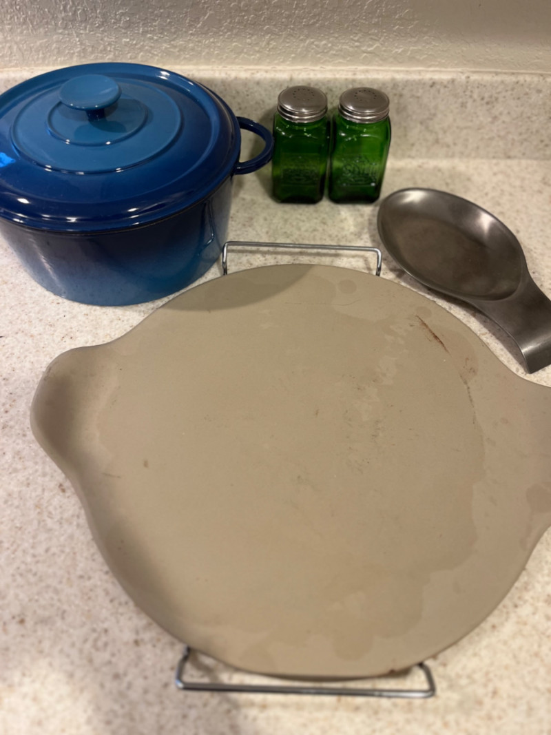 Pampered Chef Pizza Stone-Enamel Cast Iron Pot-Salt & Pepper Shaker 13”x11”x7” The Pampered Chef 15” pizza stone AMCO stainless steel utensil holder 10.5”x5.5” Green glass salt and pepper shakers 2.5”x4.5”