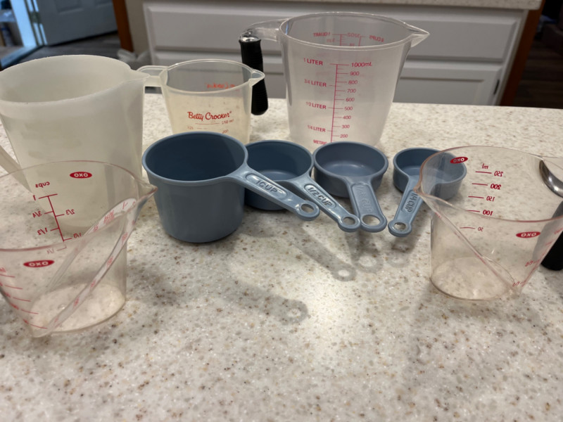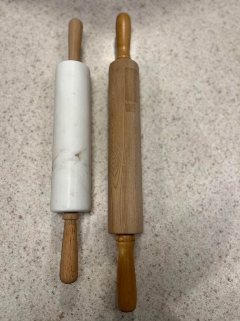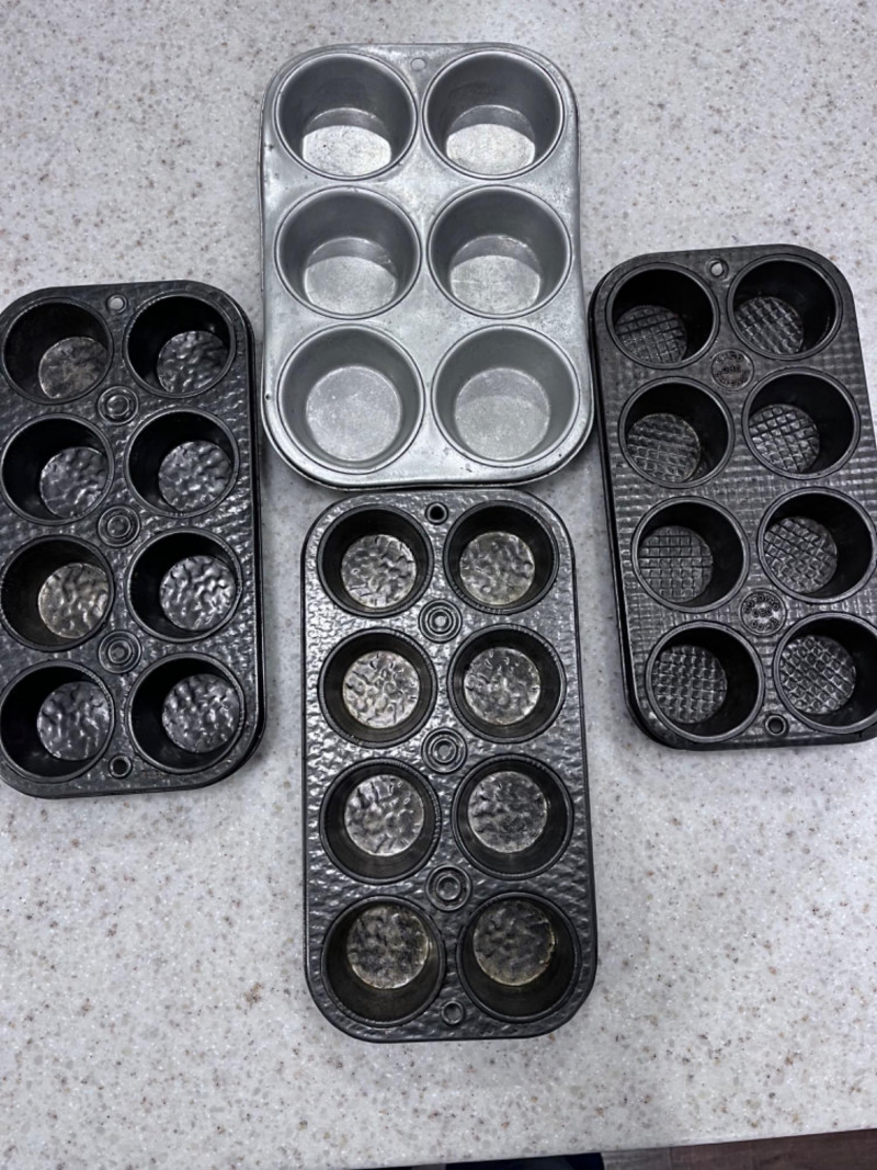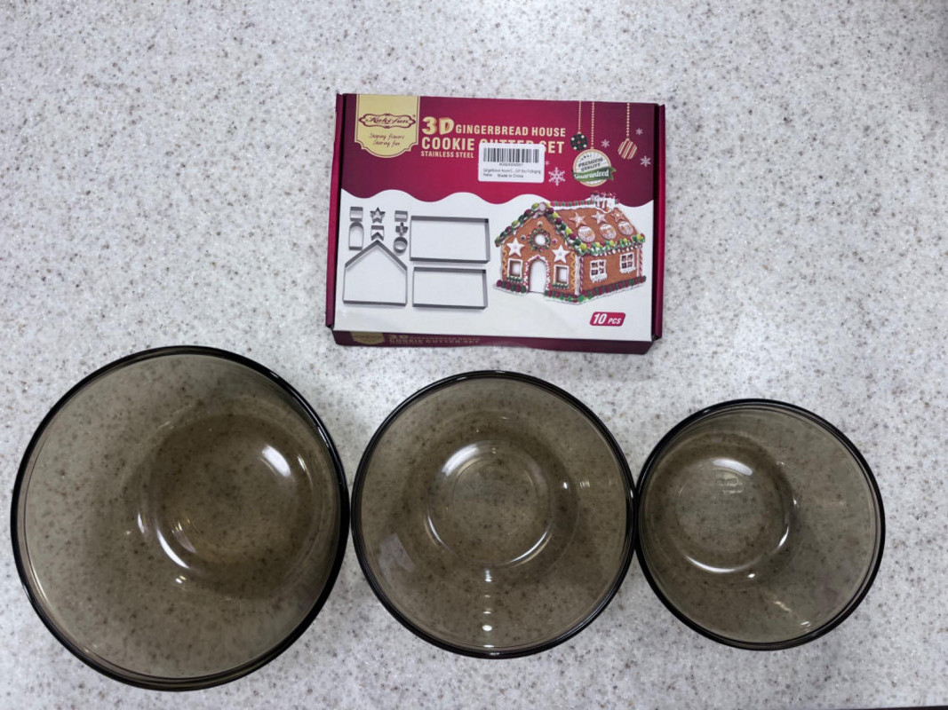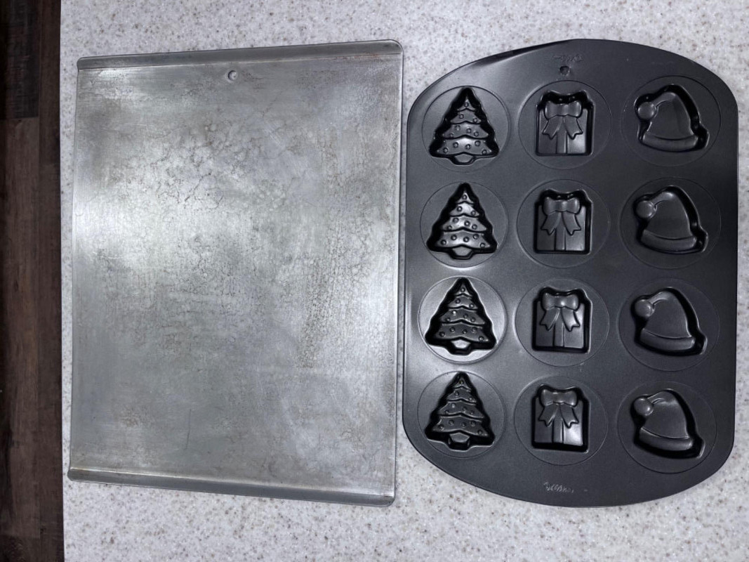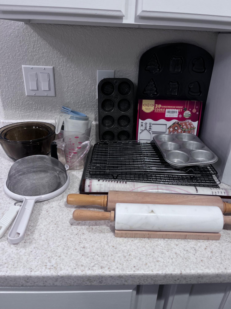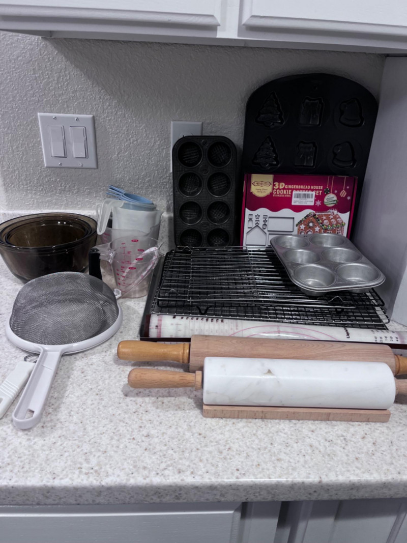 Bakeware Collection Christmas cookie mold pan 16”x11 1/4” Vollrath Cookie sheet 18”x14” Marble rolling pin with wood mount 18.5”x3” Wood rolling pin 21”x2.5” Three Anchor Ovenware glass mixing bowls Largest 8.5”x4” Two bakers mats Box of gingerbread house cookie cutters Light blue measuring cups OXO measuring cups Three mini muffin tins Makes eight mini muffins each tin Tin muffin pan Makes six muffins Two sifters