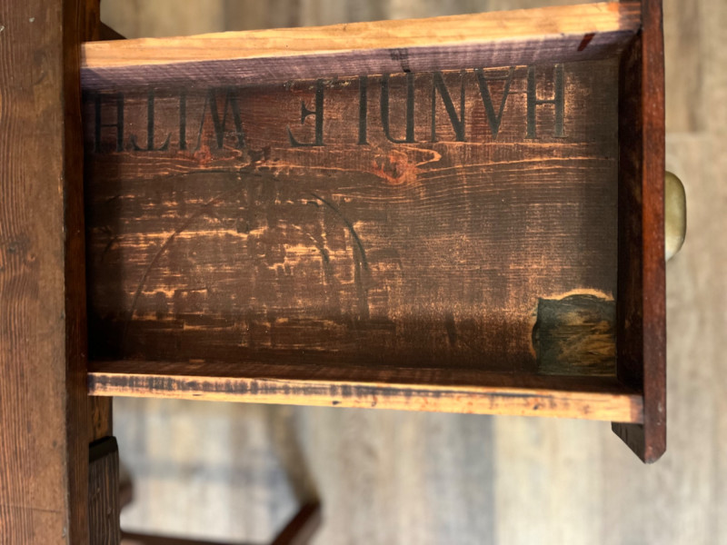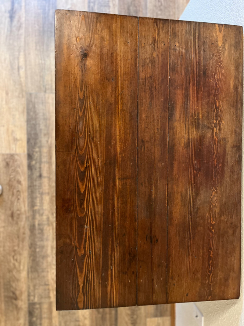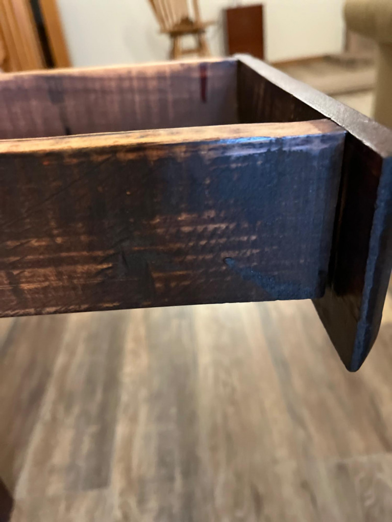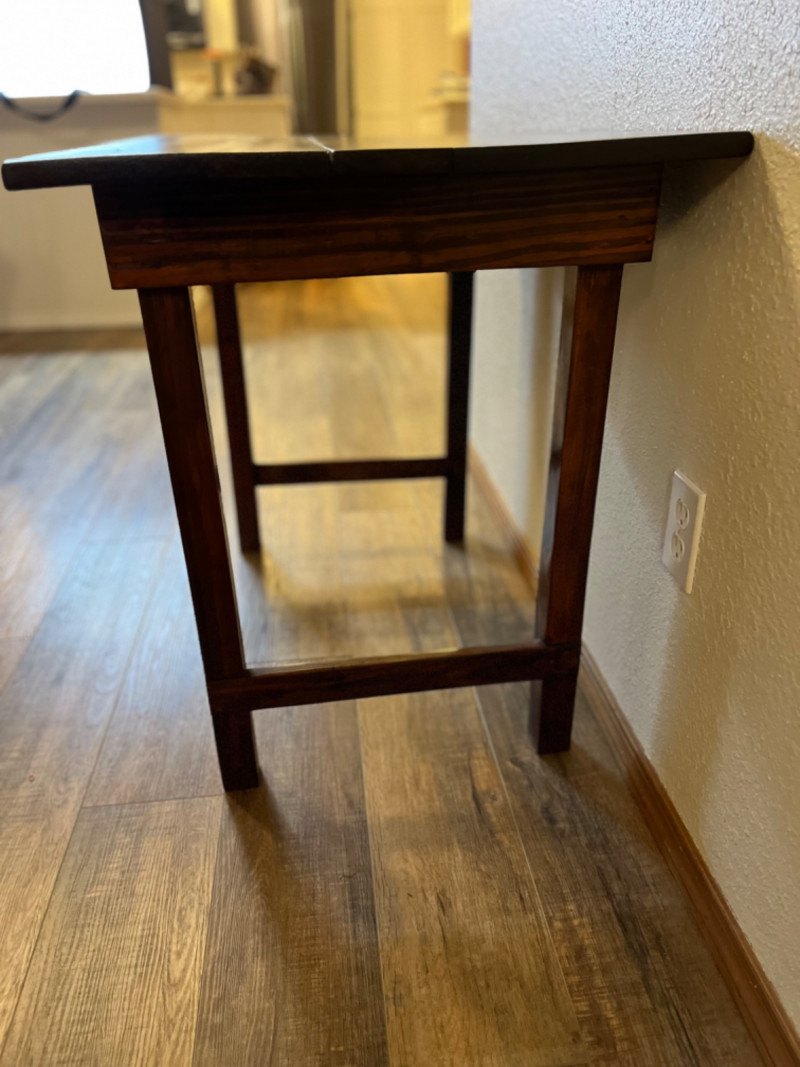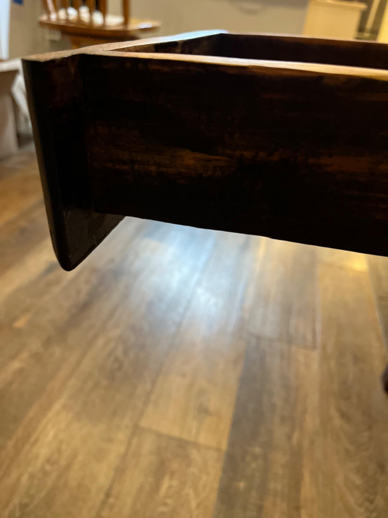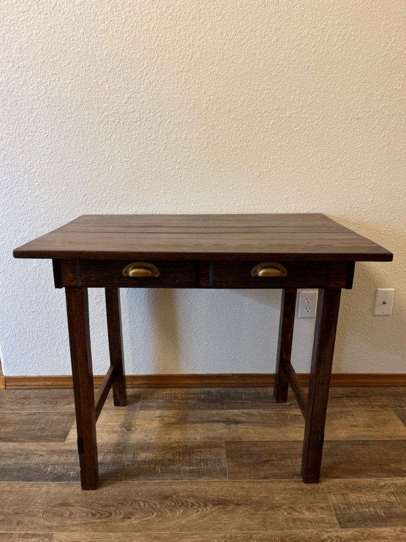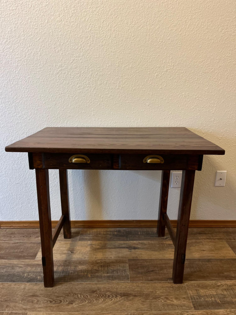 Handmade Rustic Wooden Table with 2 Drawers Brass drawer pulls. Drawers are 19 1/4” long. 35“ x 23 1/2“ x 29 1/2“