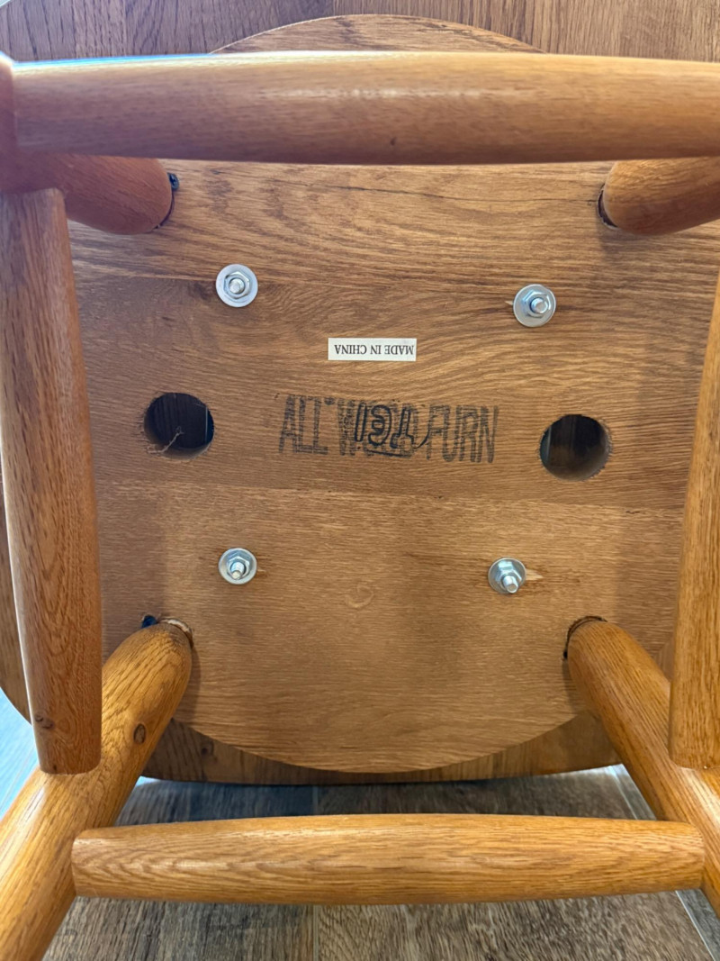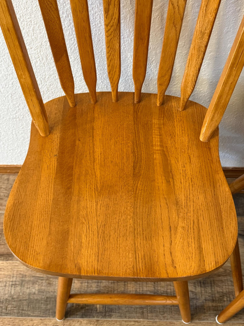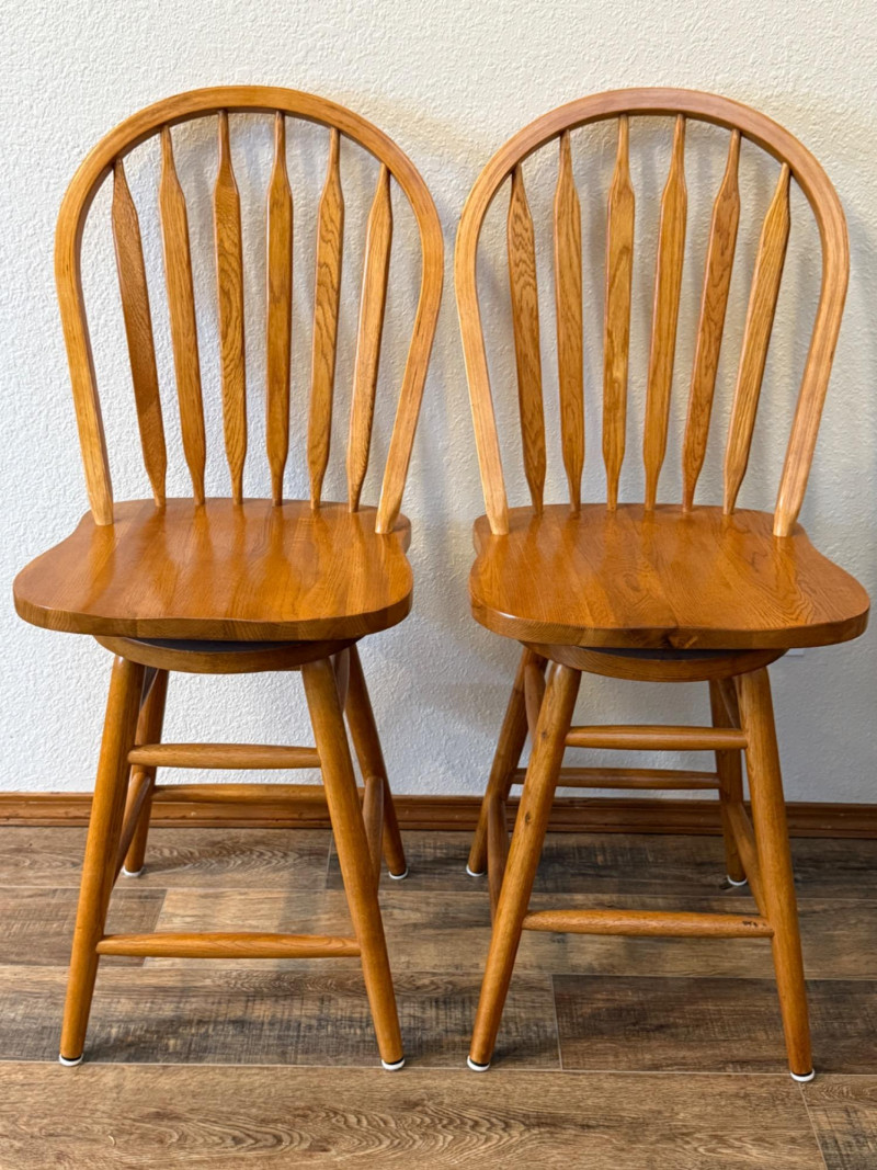 (2) Solid Oak Swivel Bar Height Barstools 17.5”x20”x44 back height.