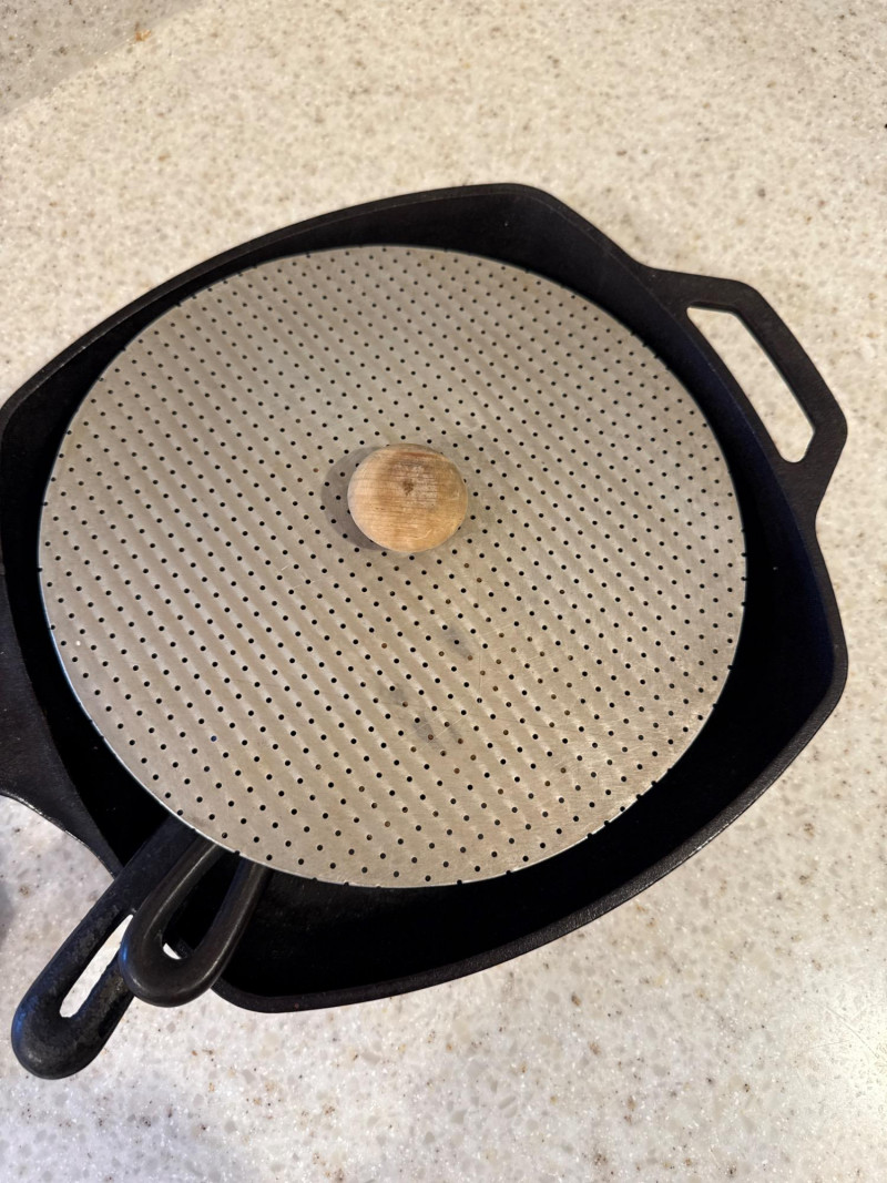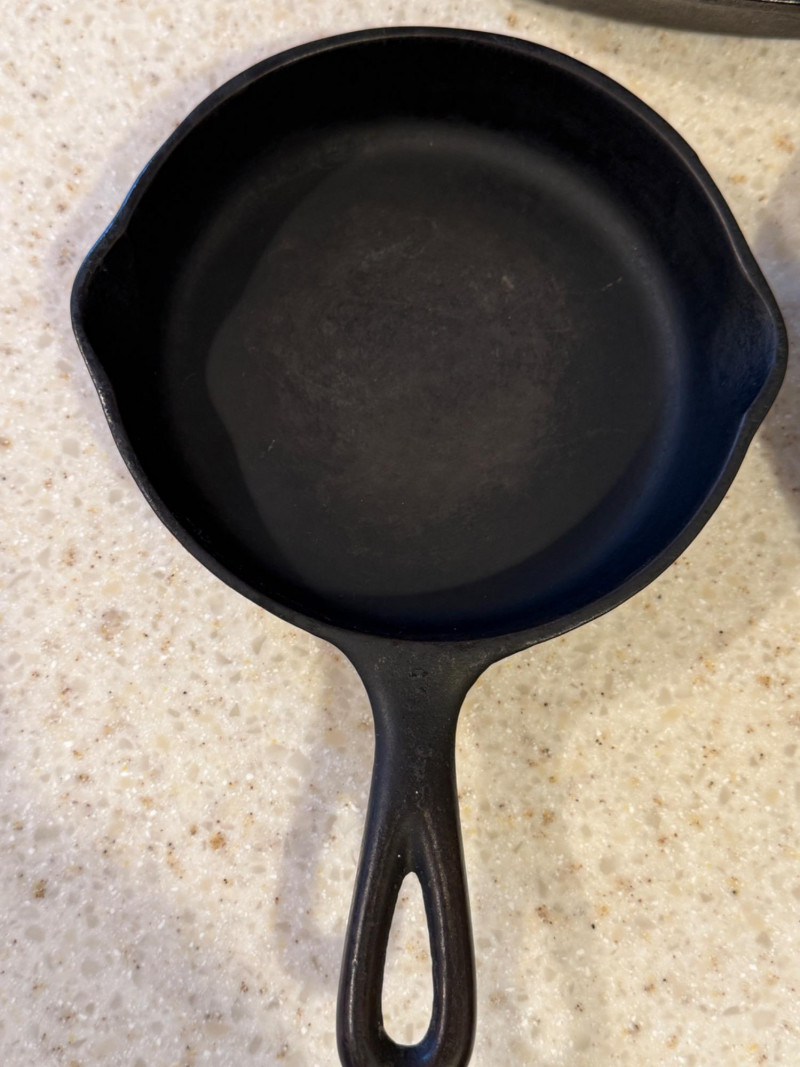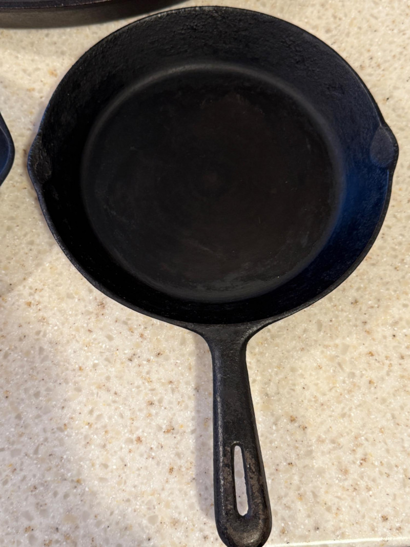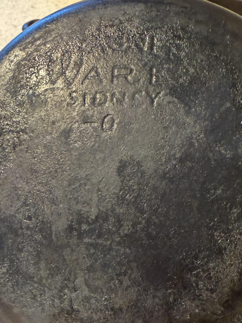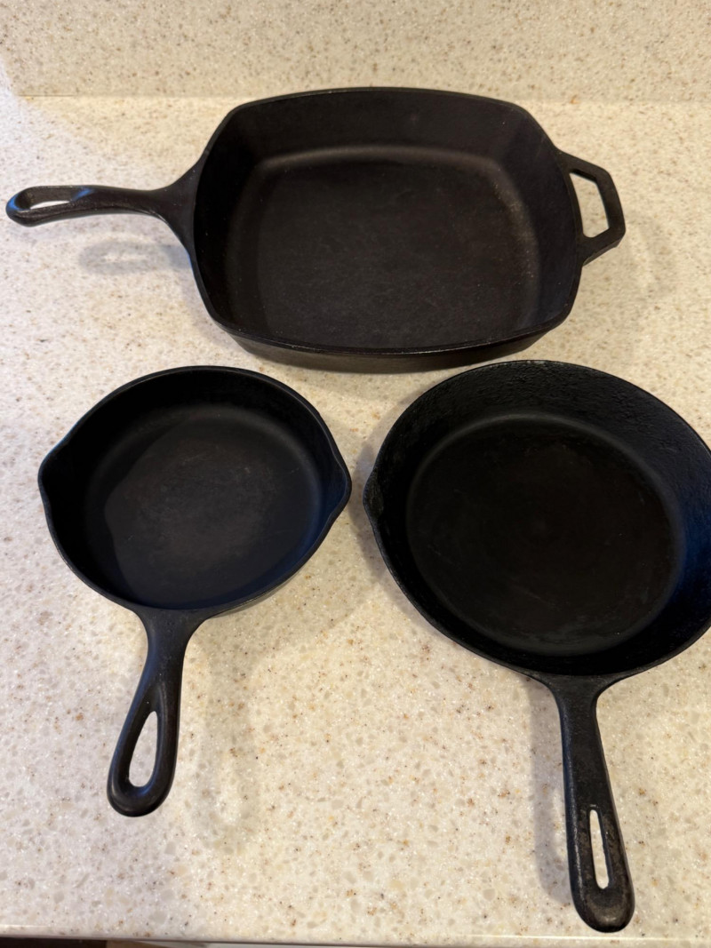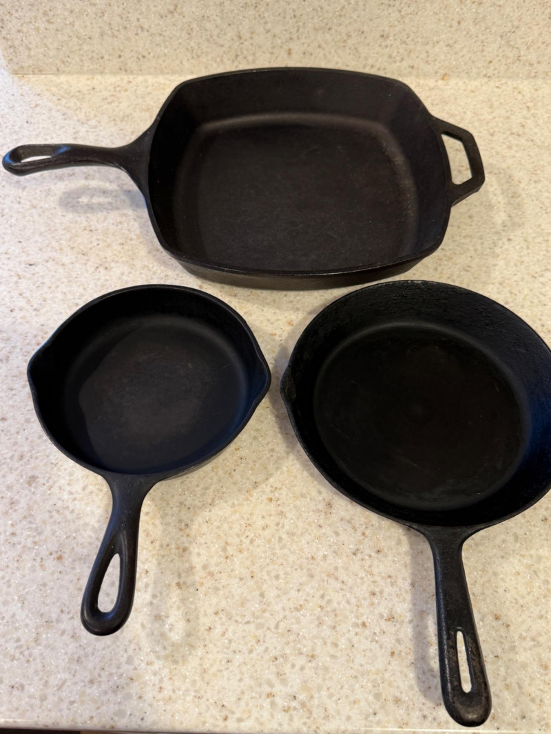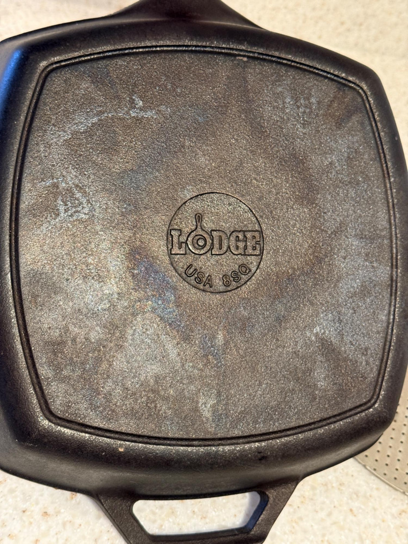 Lodge - Wagner Ware + Cast Iron Pans with Splatter Screen. Square Lodge pan marked SQ8 but measures 10.5” square. 6.5” Wagner Ware Sydney 0
