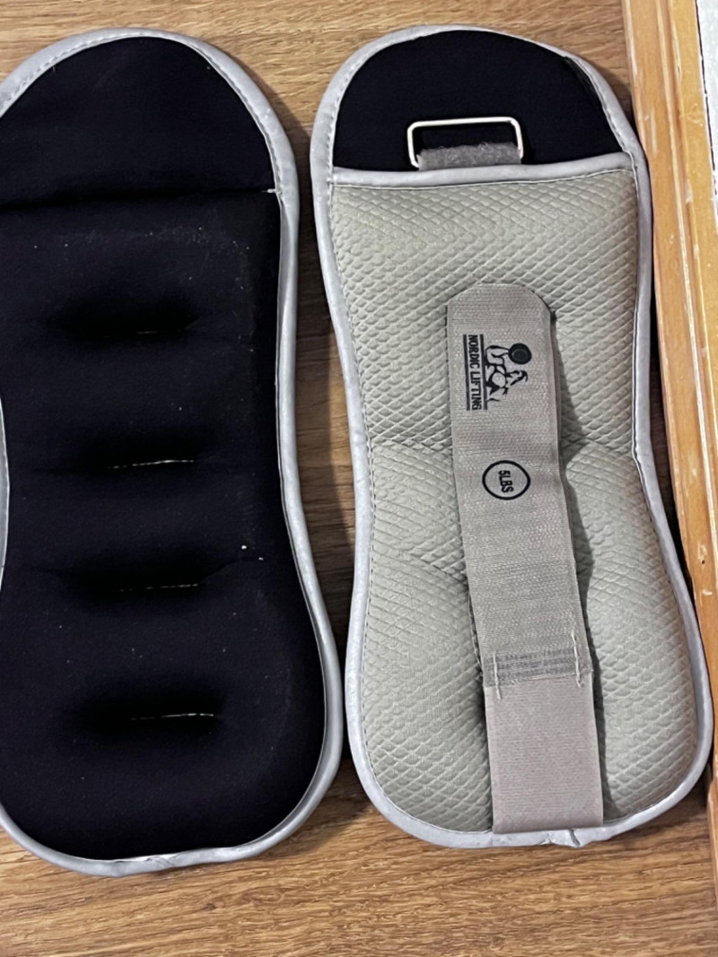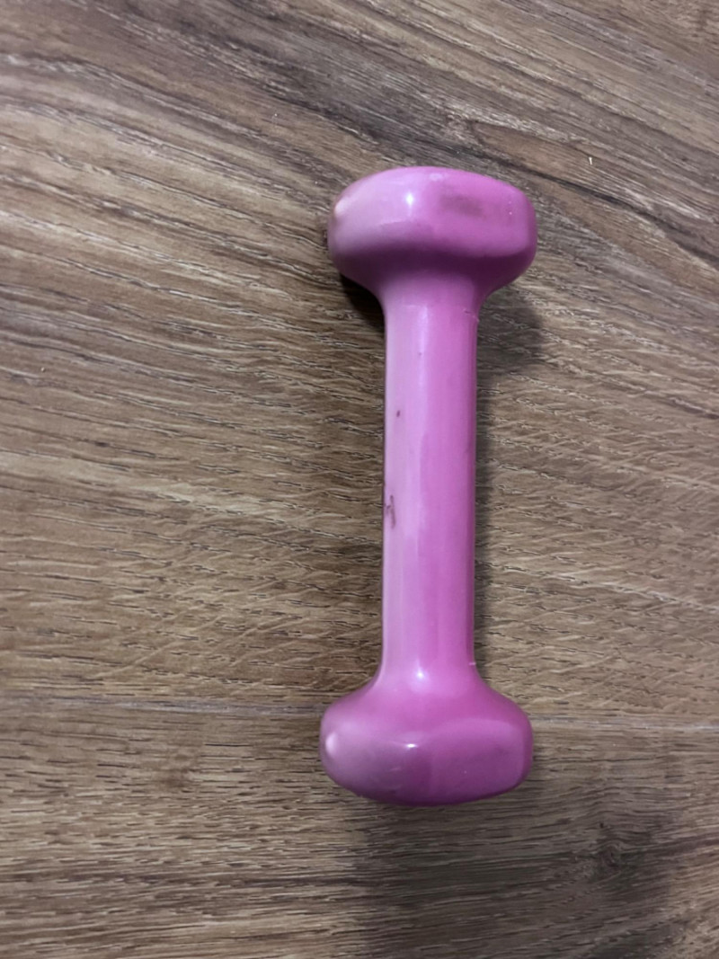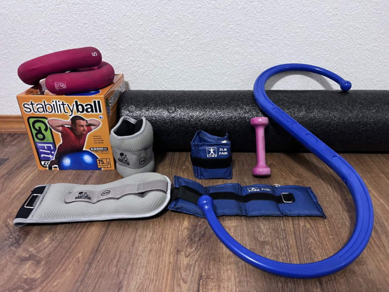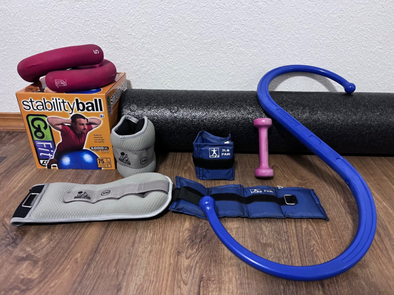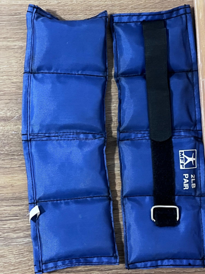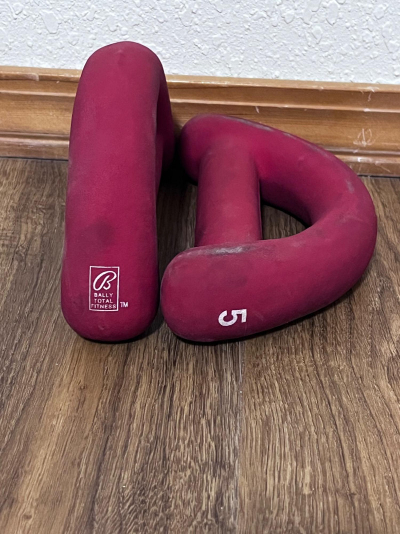Exercise Equipment Blue Ball comes with pump 75 CM fully inflated Pair of grey Nordic Lifting 5LBS weights Velcro strap to attach to limbs. Pair of blue MFP 2LB weights Velcro strap to attach to limbs. Single 1LB pink dumbbell Discoloration on entire dumbbell. AXIS OPTP large black foam roller. 36” long. Bally Total Fitness hand weights Pair of red 5LBS weights. Blue Backnobber II Two hooks for working out knots in muscles. 22”