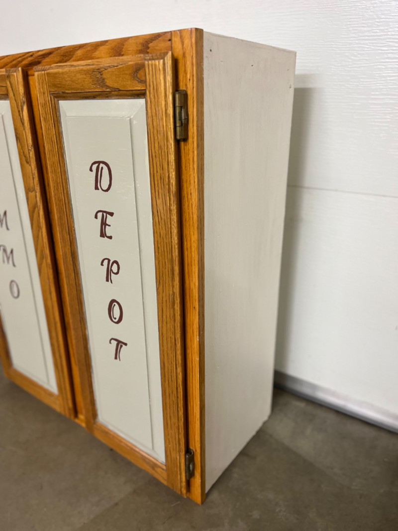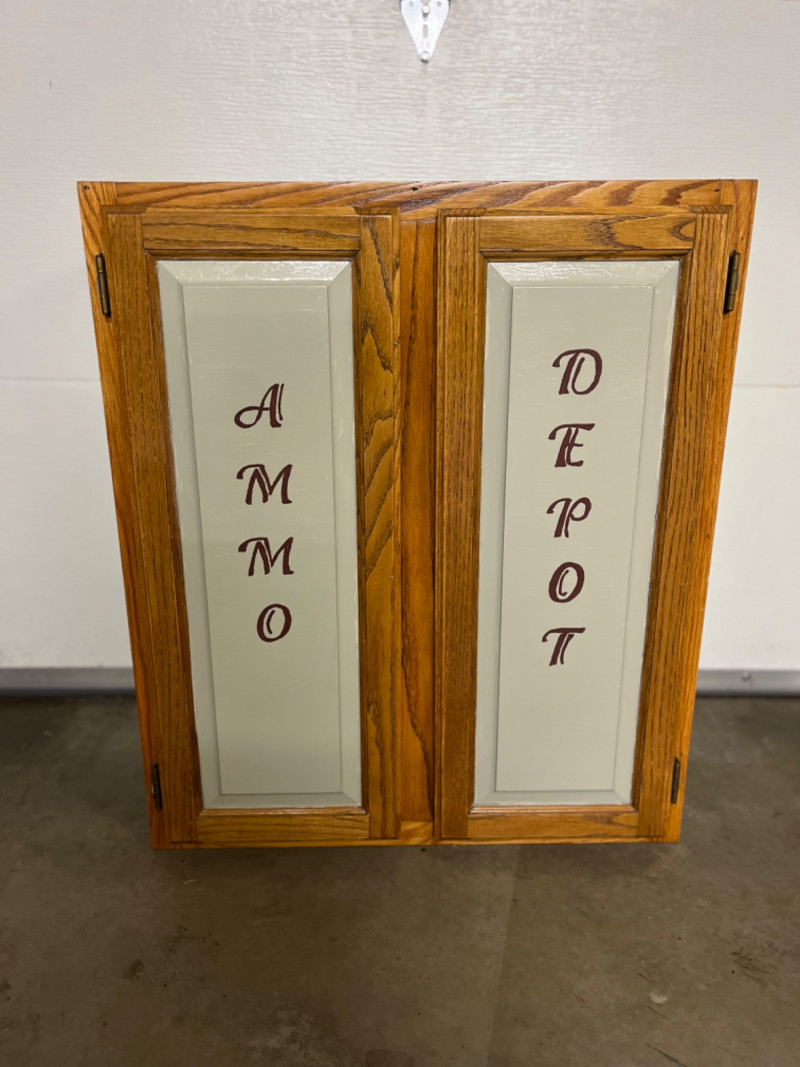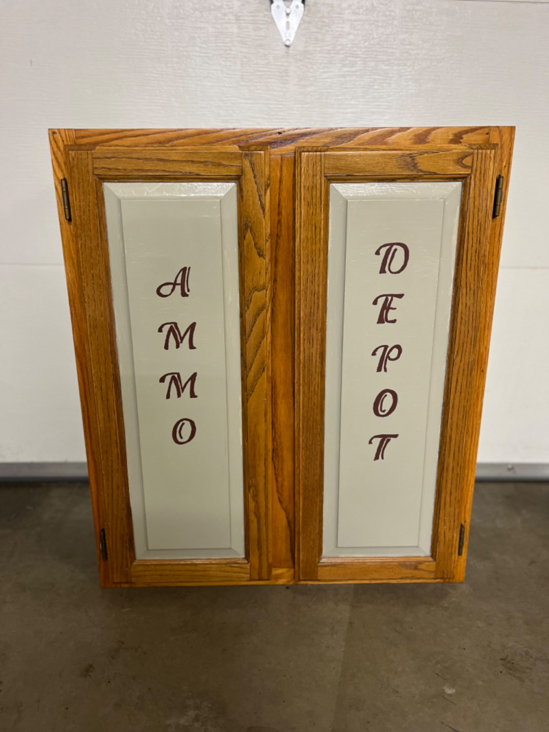*Painted Storage Cabinet ”Ammo Depot” is painted on the cabinet doors. Two shelves. 27“ x 13“ x 31.5“