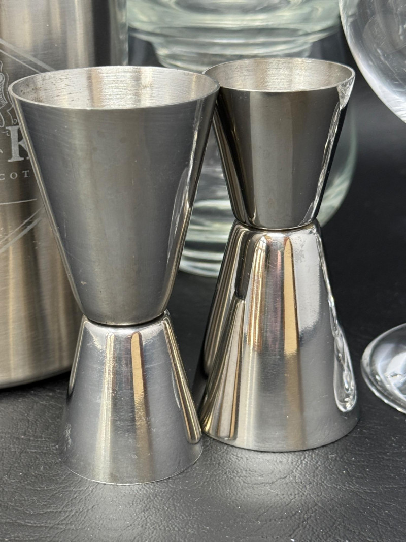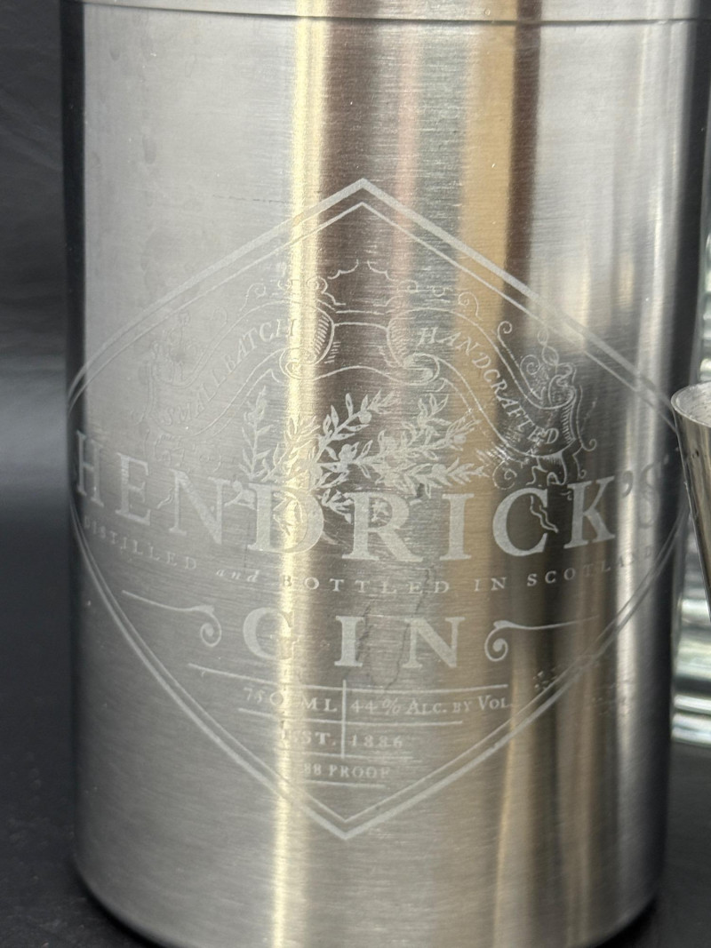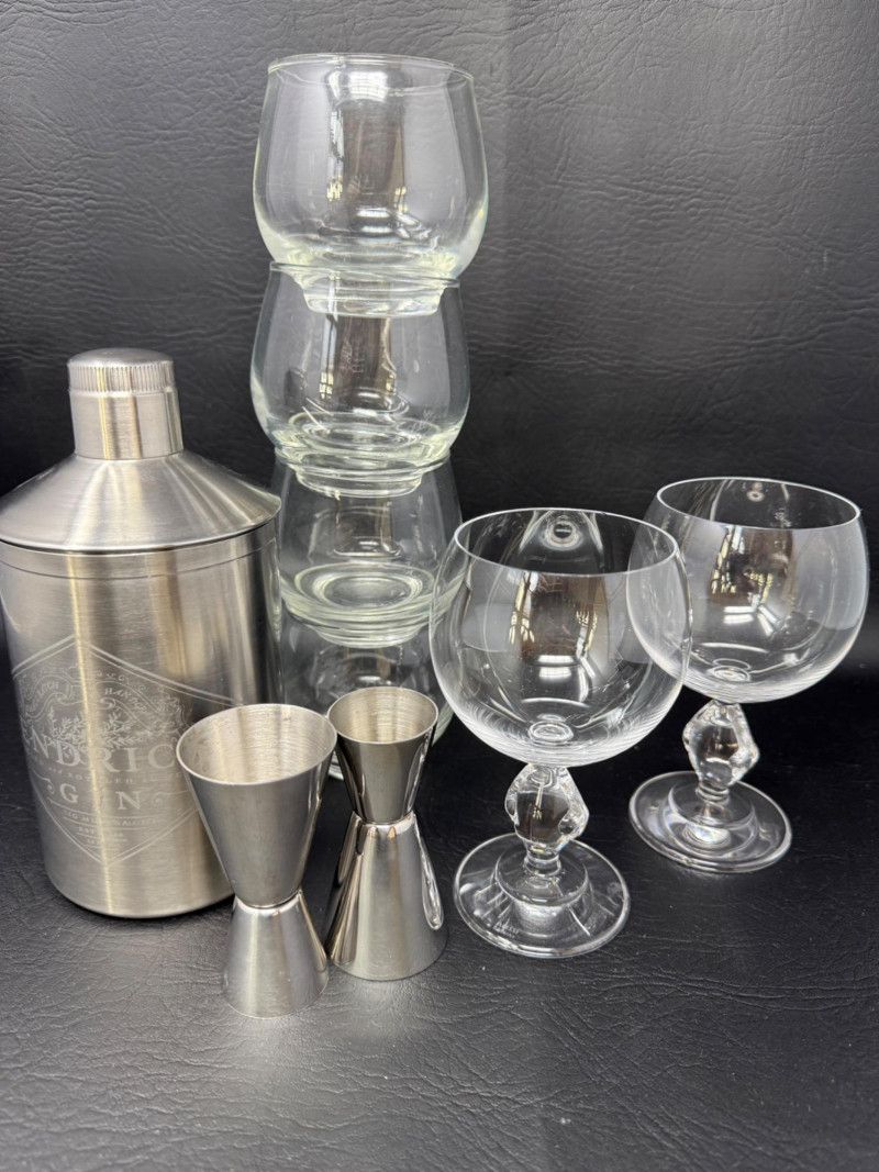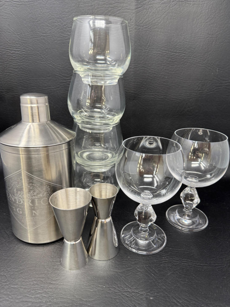 Stainless Gin Shaker & Glass Sets Hendricks Gin shaker with 2 jiggers Set of 4 tumblers 2 German Alessi Gin glasses