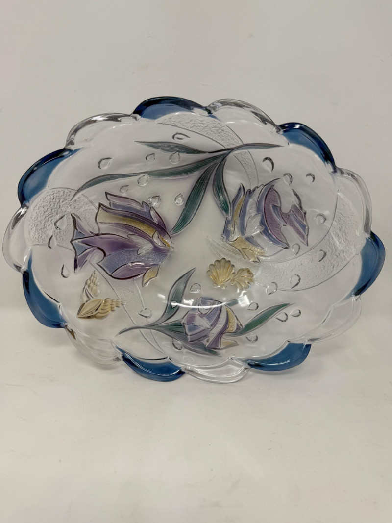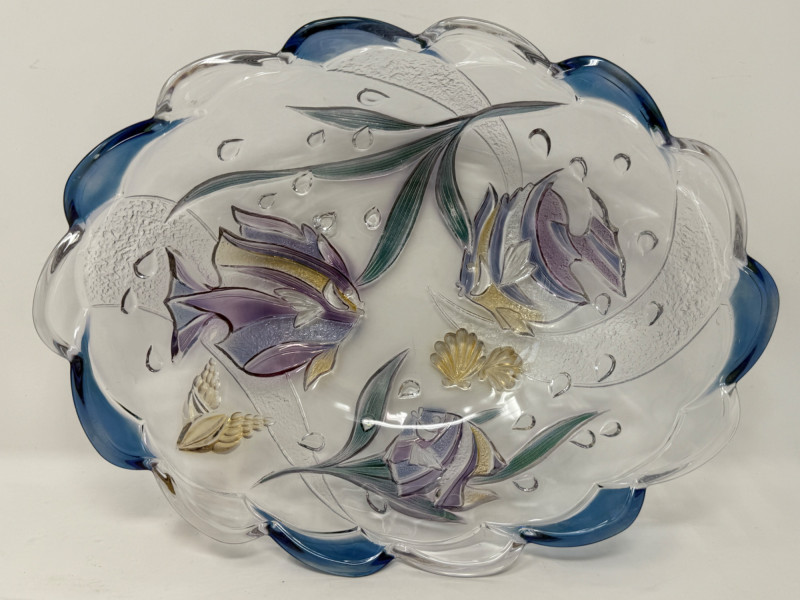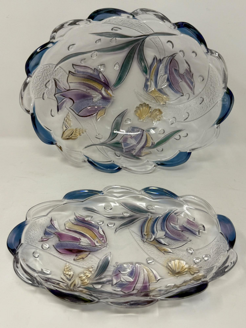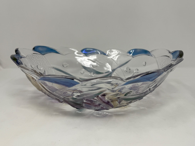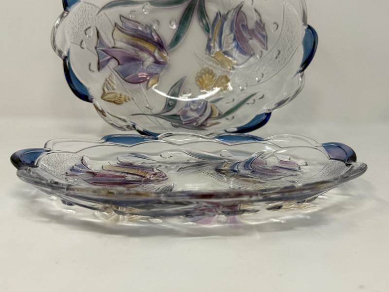 Mikasa “Savoir Vivre” Key Largo glass serving bowl and platter. Featuring a clear glass construction with a scalloped, wavy blue rim and a hand-painted or stained glass design of purple and blue tropical fish and seashells. Platter is 10.75”x7.75”