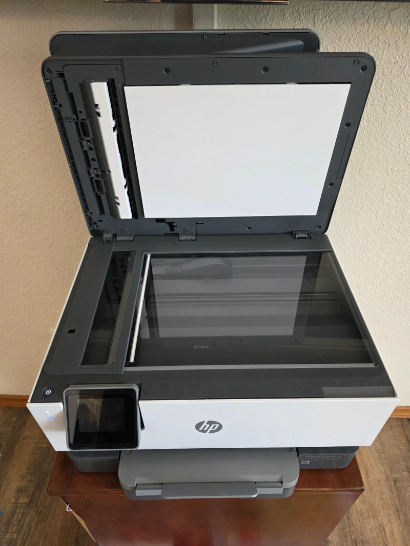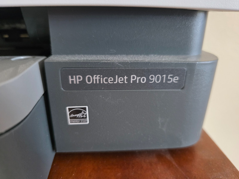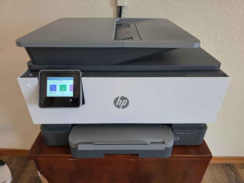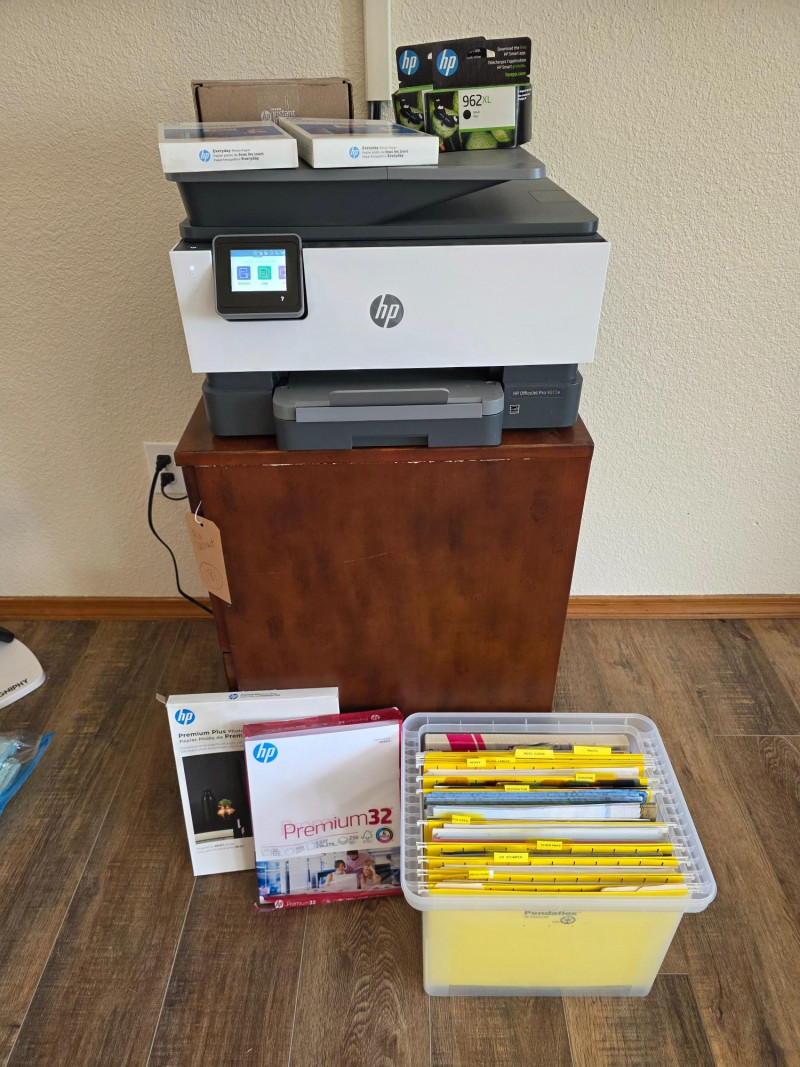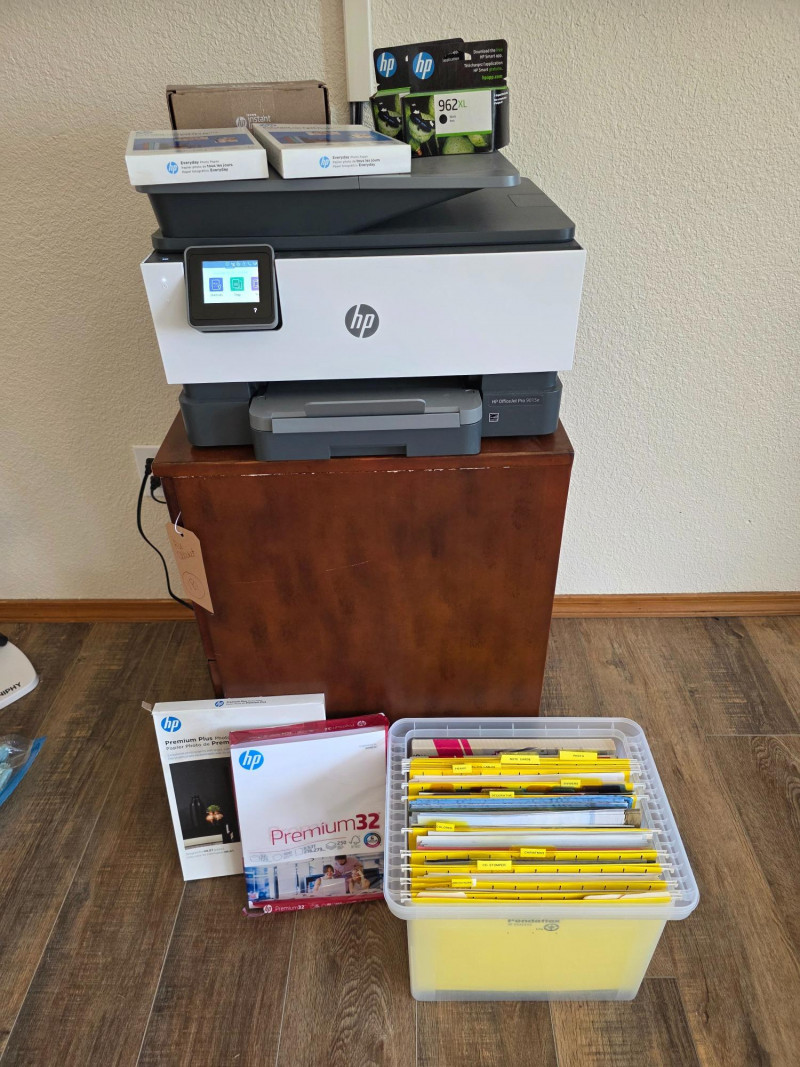 HP OfficeJet Pro 9015e Printer, Extra Ink & Paper Wireless all-in-one inkjet printer (print, copy, scan, fax) known for its speed, color quality, and features like HP Smart Tasks and HP+ Functions: Print, Copy, Scan, Fax. Connectivity: Wireless, Ethernet, USB, Wi-Fi Direct, Apple AirPrint, Mopria. Speed: Up to 22 ppm (ISO black), 18 ppm (ISO color), 32 ppm (draft). Resolution: Up to 1200x1200 dpi (black), 4800x1200 optimized (color). Paper Handling: 250-sheet input tray, 35-page auto-feeder, auto duplexing. Display: 2.7" Color Capacitive Touchscreen. Includes (2) HP 962XL Black Ink Cartridges, (2) HP Everyday Photo Paper (100 sheets each), File box full of special paper (brochure stock, Christmas card stock, colored paper, note cards and more! Tested - Works! 11"T x 17"W x 15"D