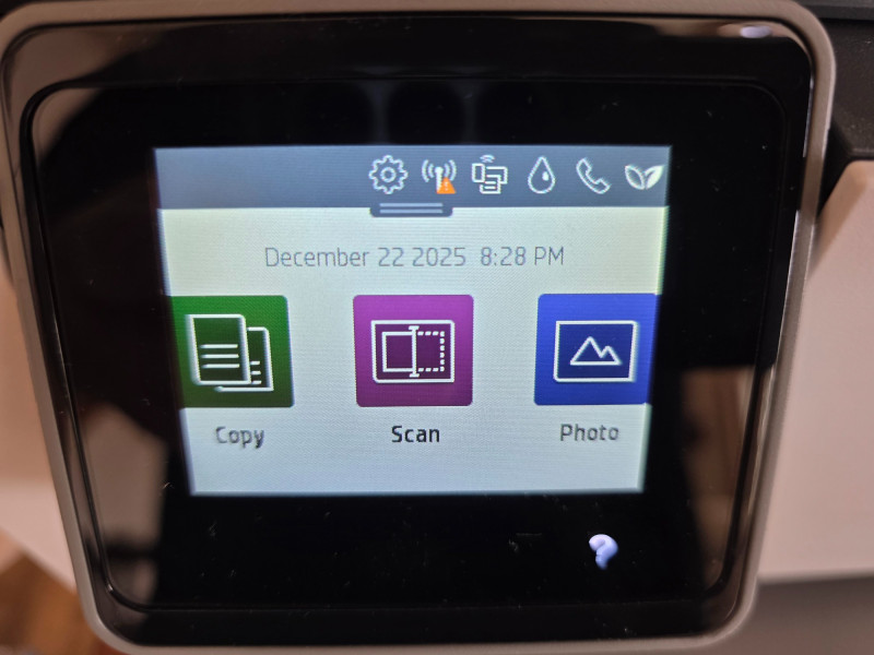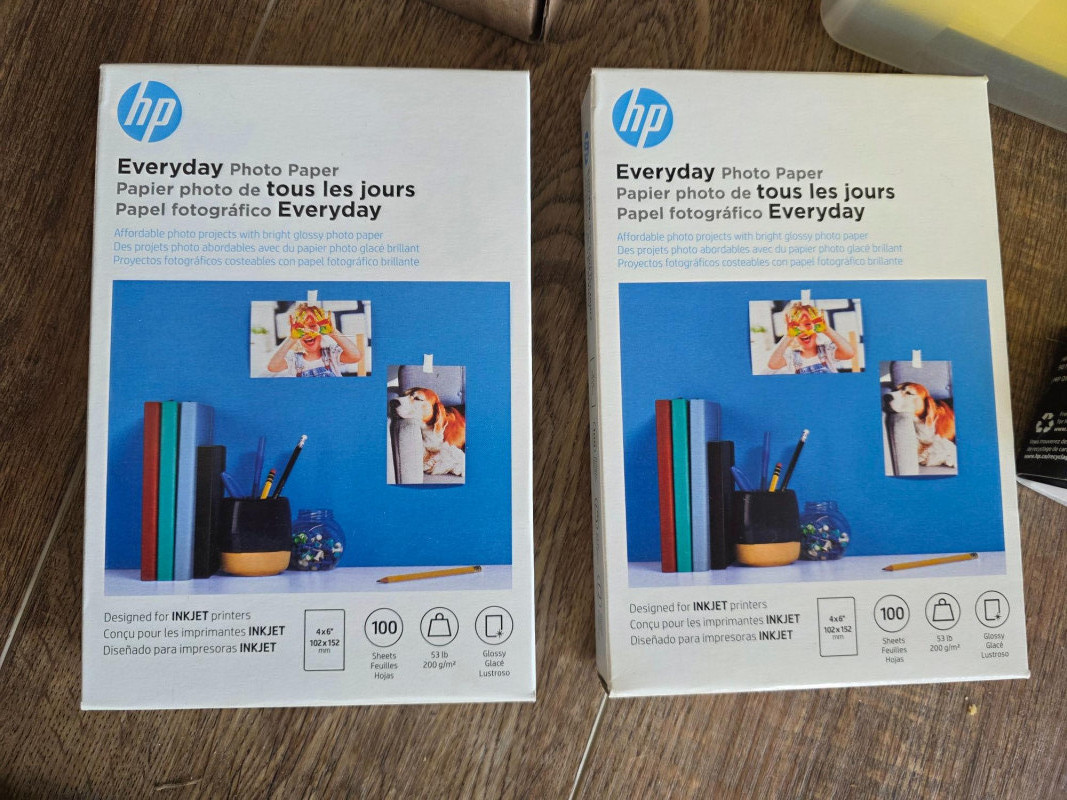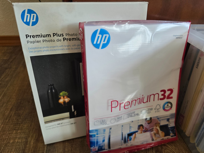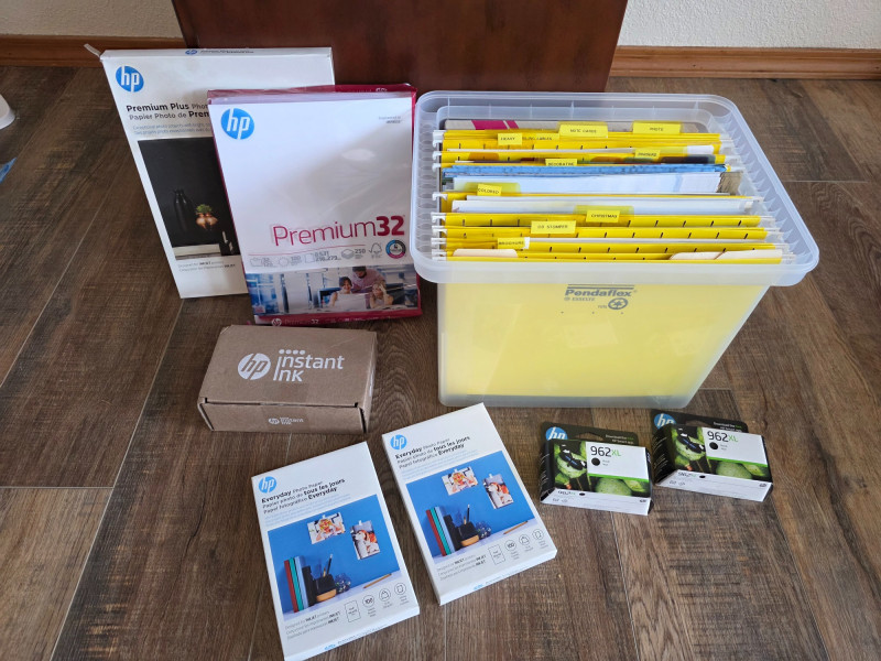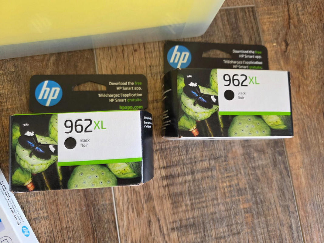 HP OfficeJet Pro 9015e Printer, Extra Ink & Paper Wireless all-in-one inkjet printer (print, copy, scan, fax) known for its speed, color quality, and features like HP Smart Tasks and HP+ Functions: Print, Copy, Scan, Fax. Connectivity: Wireless, Ethernet, USB, Wi-Fi Direct, Apple AirPrint, Mopria. Speed: Up to 22 ppm (ISO black), 18 ppm (ISO color), 32 ppm (draft). Resolution: Up to 1200x1200 dpi (black), 4800x1200 optimized (color). Paper Handling: 250-sheet input tray, 35-page auto-feeder, auto duplexing. Display: 2.7" Color Capacitive Touchscreen. Includes (2) HP 962XL Black Ink Cartridges, (2) HP Everyday Photo Paper (100 sheets each), File box full of special paper (brochure stock, Christmas card stock, colored paper, note cards and more! Tested - Works! 11"T x 17"W x 15"D