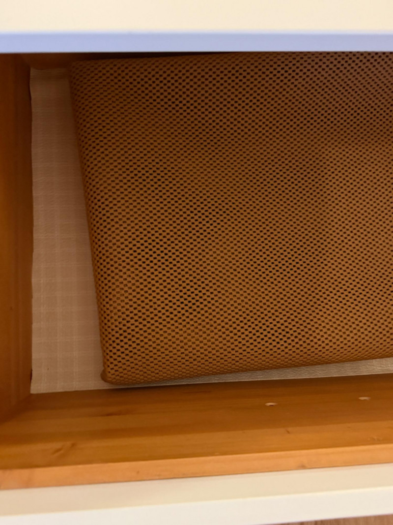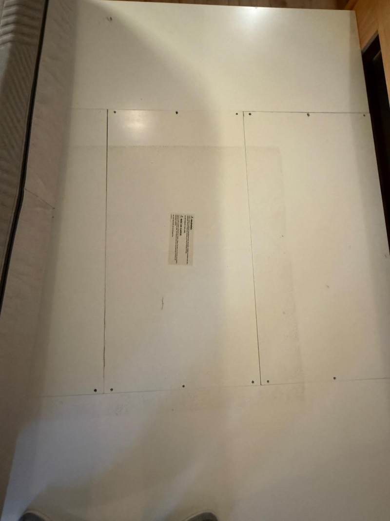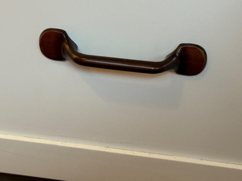 There is a platform piece of wood that fills the gap in the middle. White painted wood with oil rubbed bronze pulls. Includes a rug pad to prevent a mattress from slipping off the base. Some scuffing on one edge.