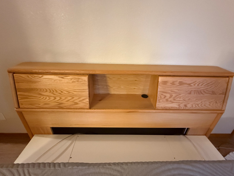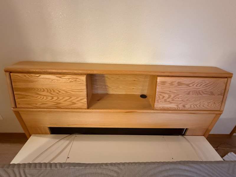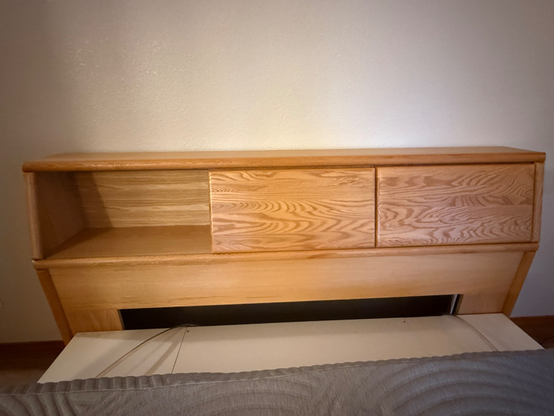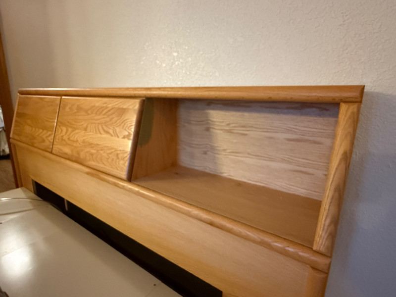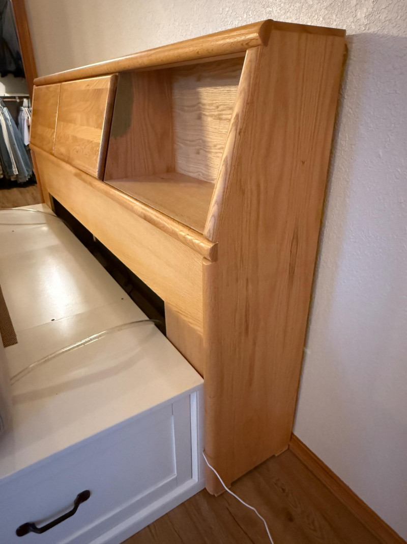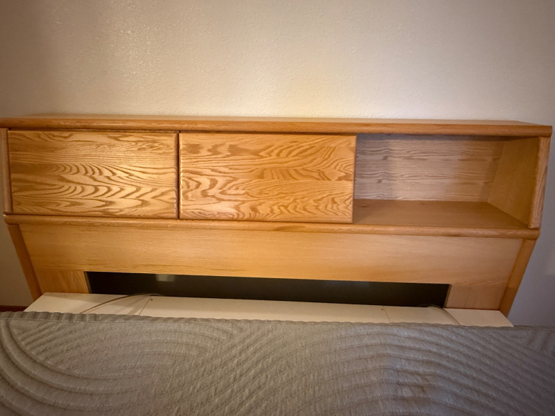 King Size Light Oak Cabinet Storage Headboard Cabinet doors slide to the middle. This unit is freestanding with wall bumpers.