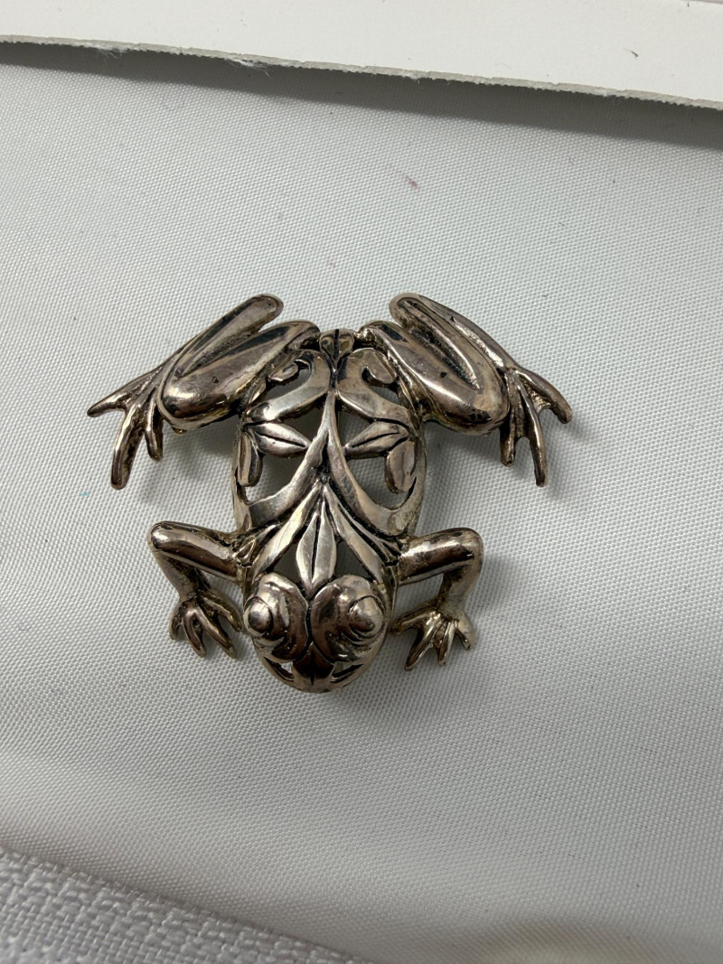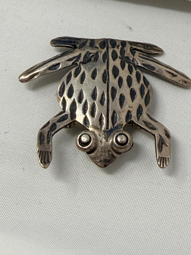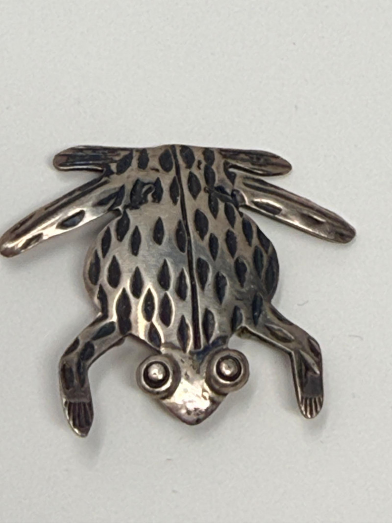 Jezlaine Sterling Silver and Spotted Frog Pins Solid sterling silver spotted frog is 1”x1” Sterling weight of these pieces is 12.26 grams.