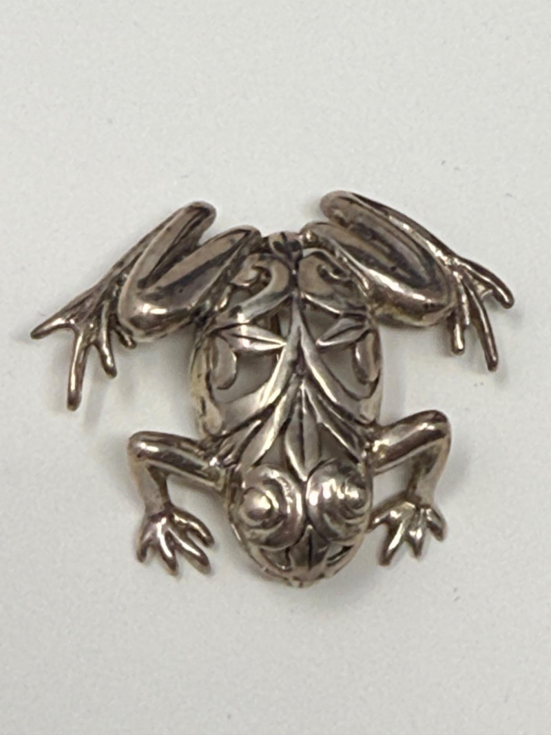 Vintage Jezlaine frog pin. The piece features an intricate openwork, filigree design on the frog's back and is made of 925 sterling silver. 1.25”x1”
