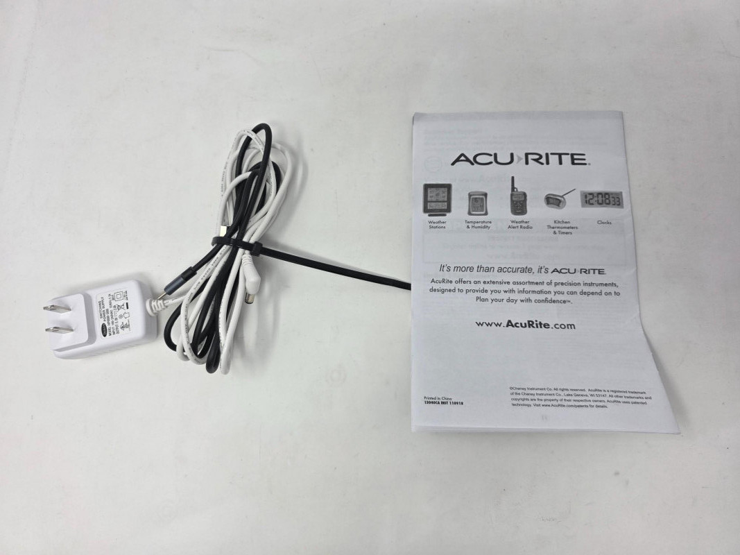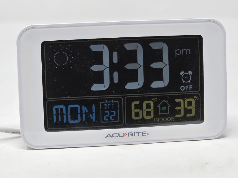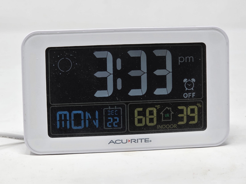 AcuRite Intelli-Time Atomic Digital Alarm Clock With USB Charger Illuminated color display shows the time, date, and indoor temperature/humidity. Features a USB port for charging compatible smartphones and other mobile devices. "Intelli-Time" or "Atomic" clock technology automatically sets the correct time and date and adjusts for Daylight Saving Time (DST). Dual programmable alarms can be set for everyday, weekdays, or weekends only. Powered by an AC adapter with battery backup in case of power failure Includes power cord, USB-C cable & user's manual Tested - Works! 2.75"T x 5.5"W x 2.25"D