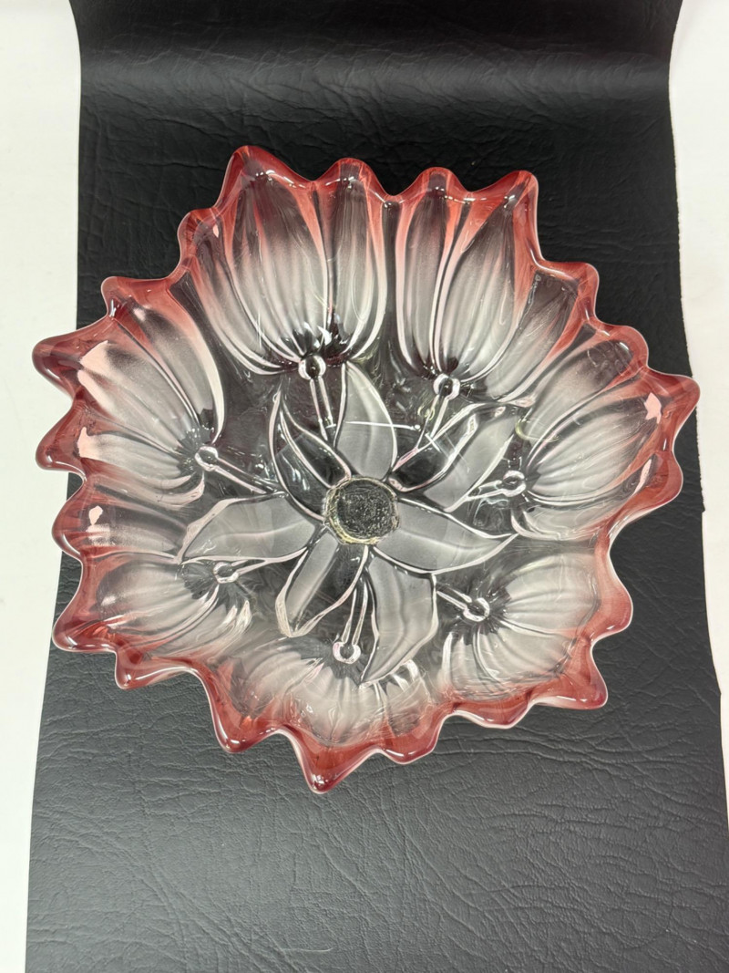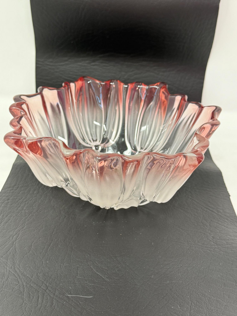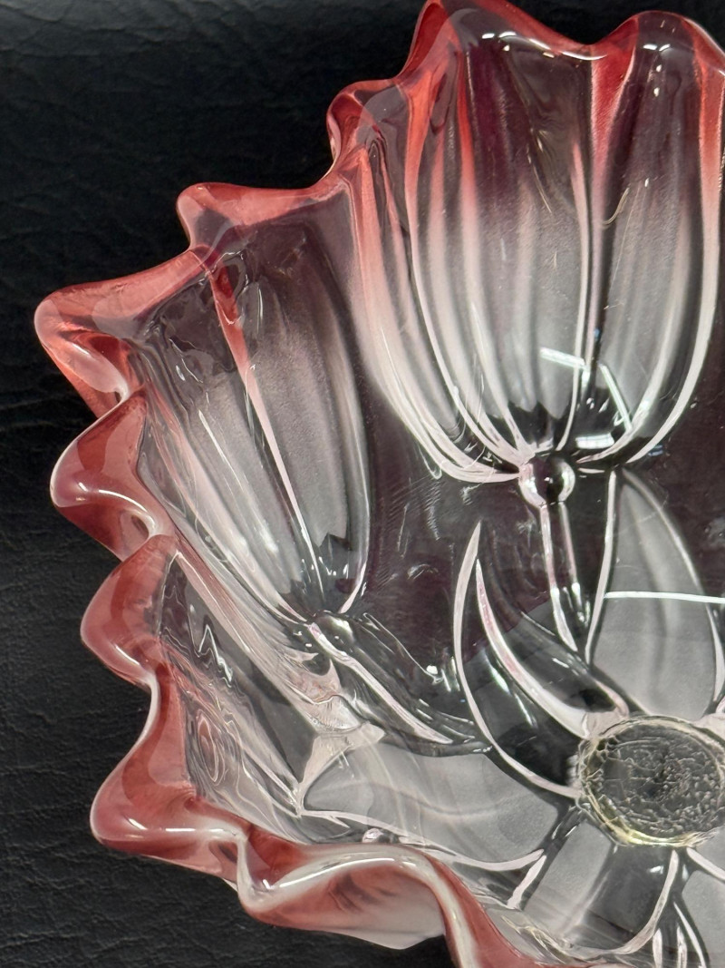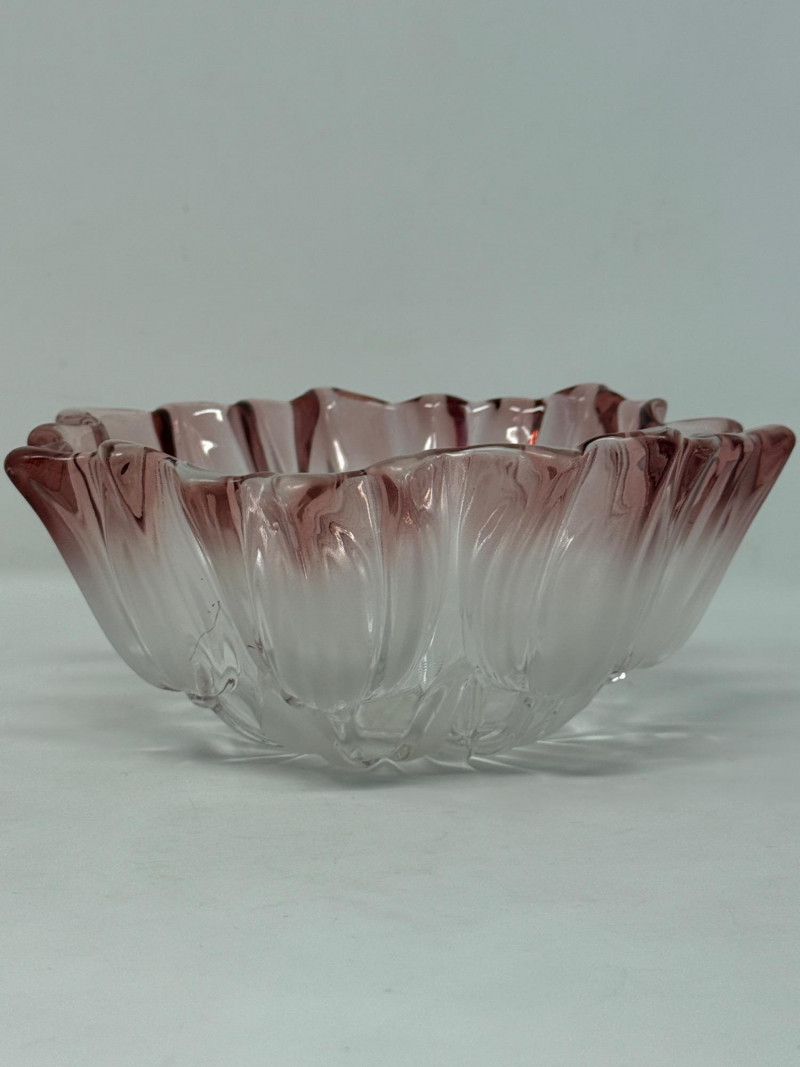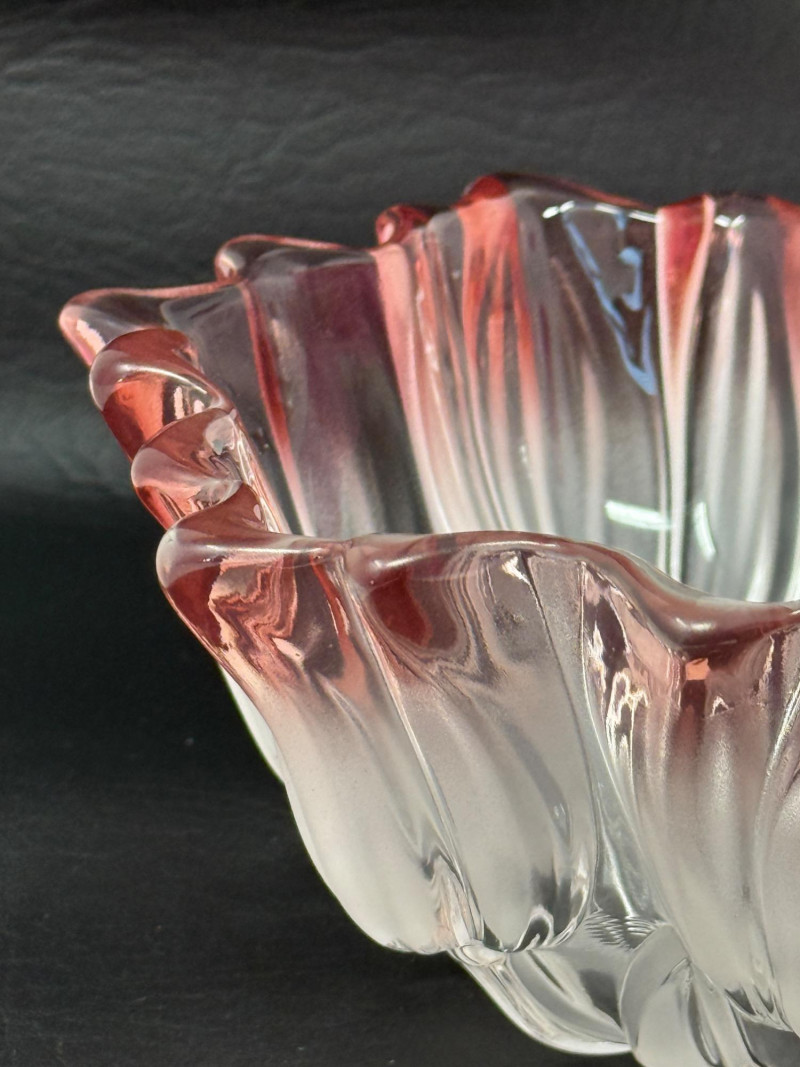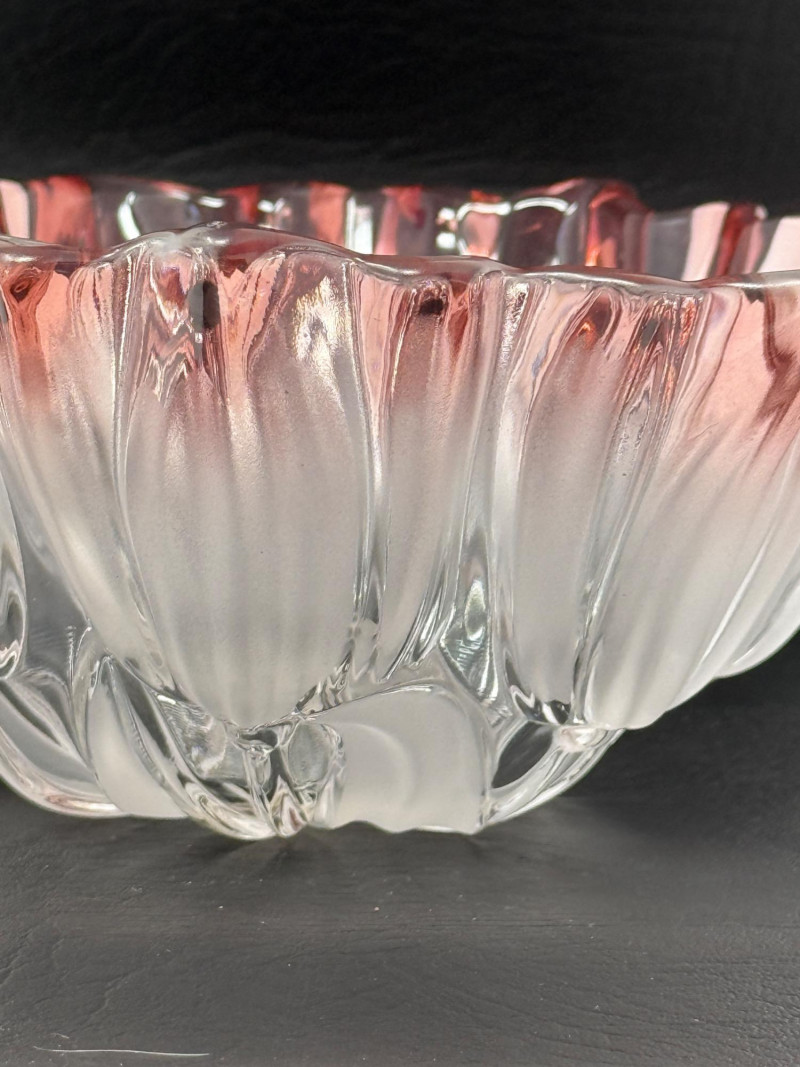 Mikasa “Tulips Pink” satin frosted crystal hostess bowl. The bowl features a distinctive scalloped edge and a frosted, clear-to-pink gradient design. It is part of the "Tulips Pink" pattern, which was produced in Germany. The design is often associated with Walther Glas, sometimes sold under the Mikasa brand name