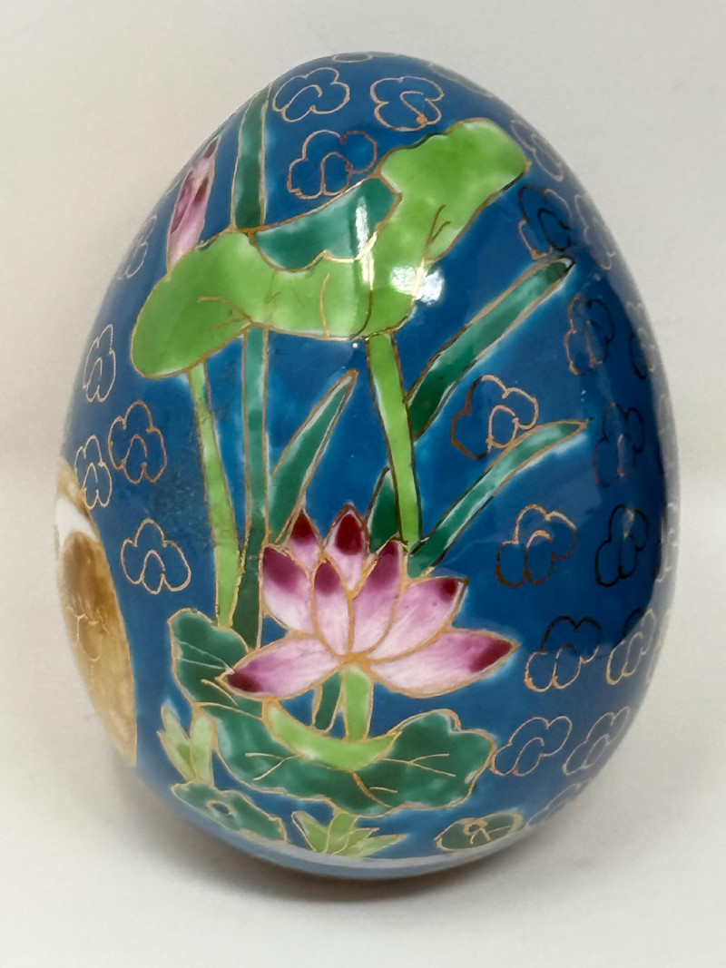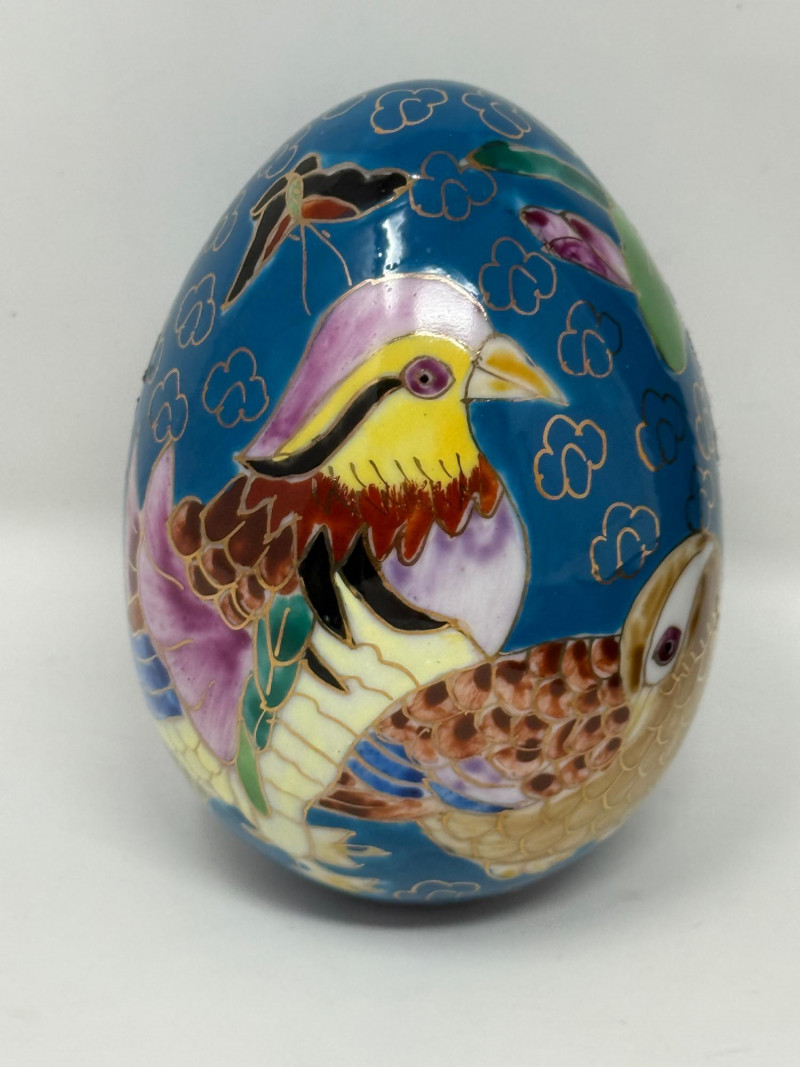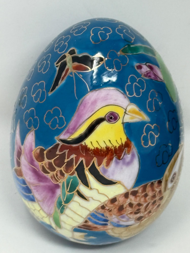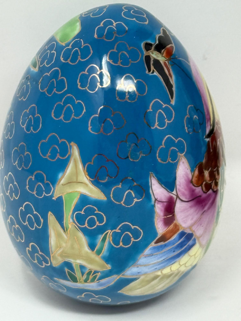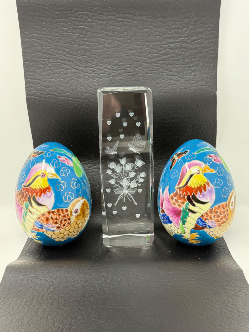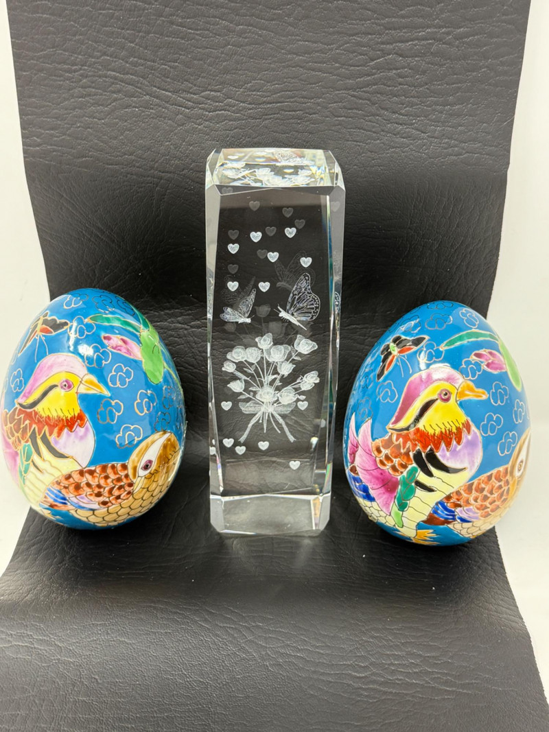 Laser-etched crystal glass paperweight featuring a 3D design of butterflies and flowers (2) Matching hand painted cloisonné style ceramic eggs with bird and floral motif. 3”x4.5” tall.