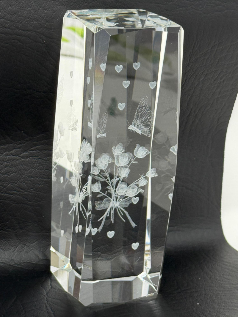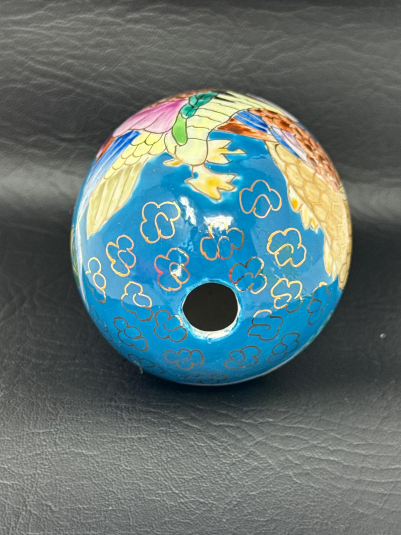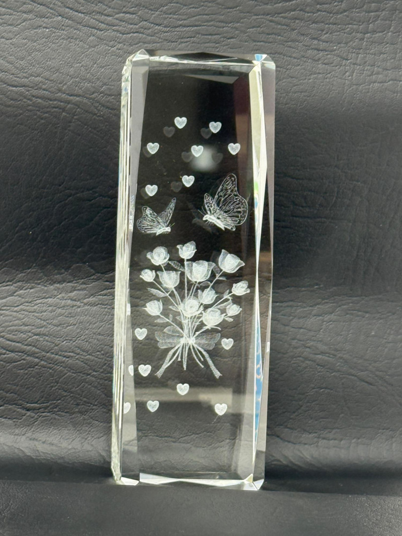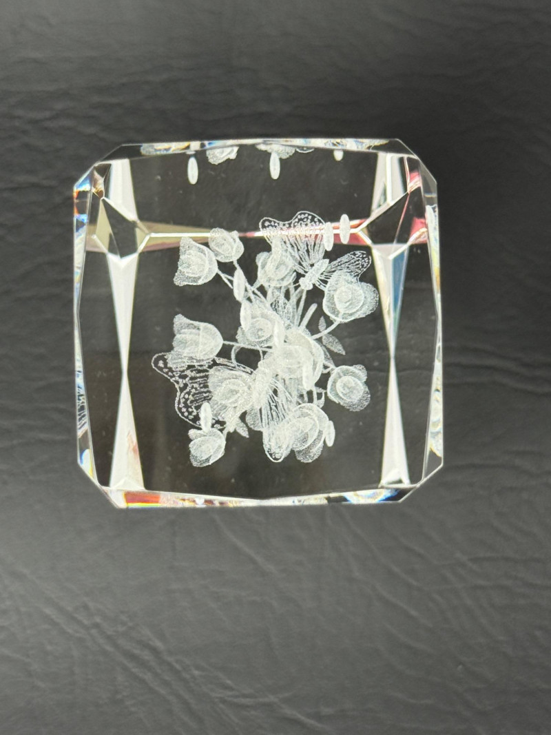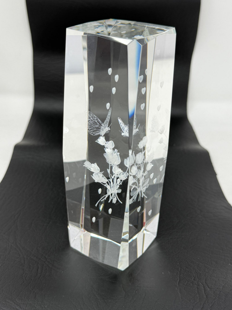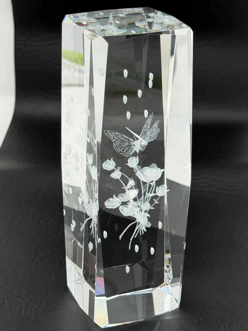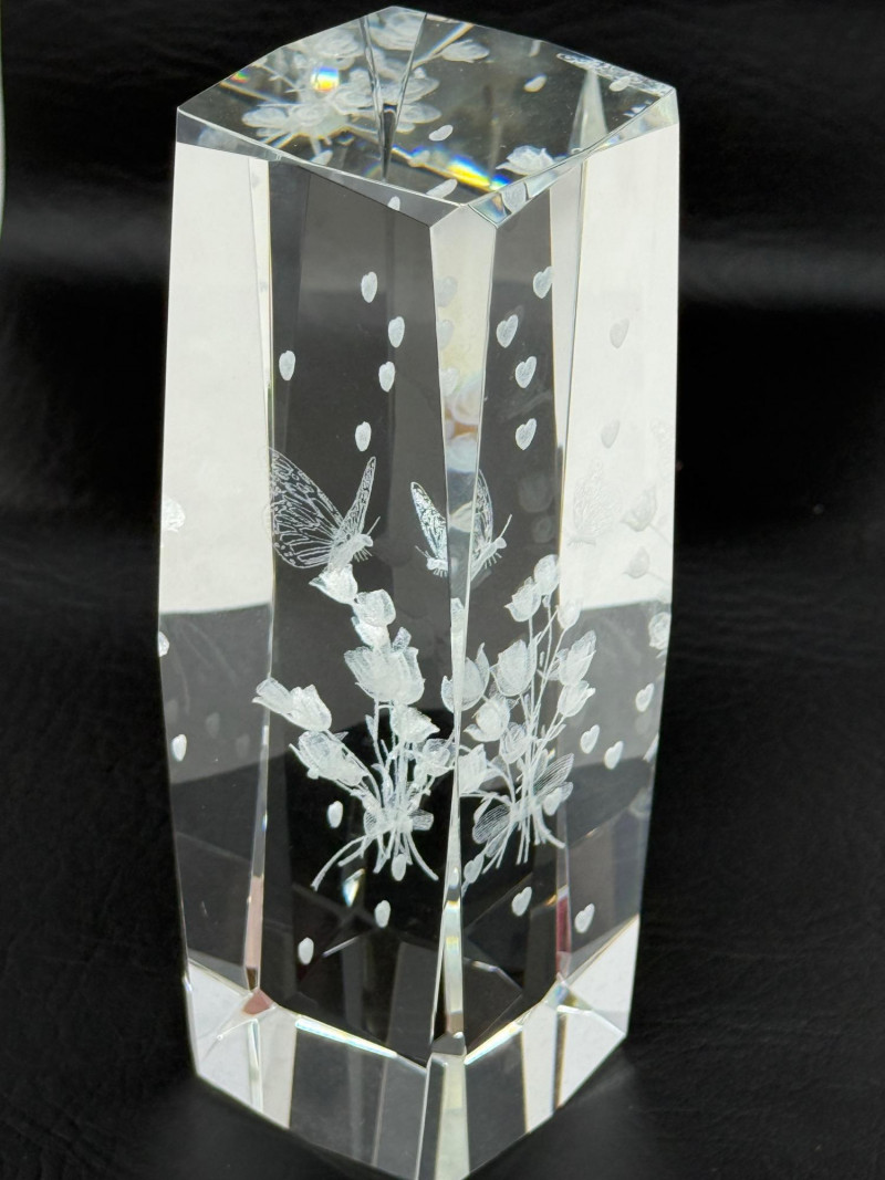 Laser-etched crystal glass paperweight featuring a 3D design of butterflies and flowers (2) Matching hand painted cloisonné style ceramic eggs with bird and floral motif. 3”x4.5” tall.