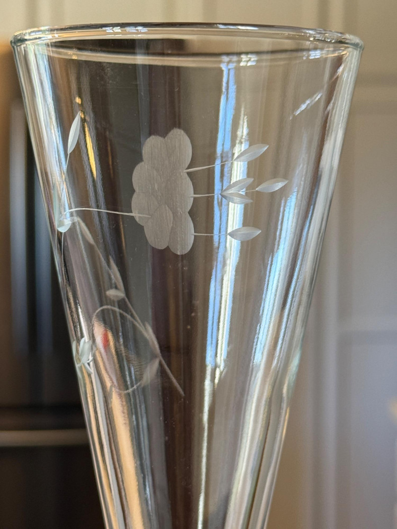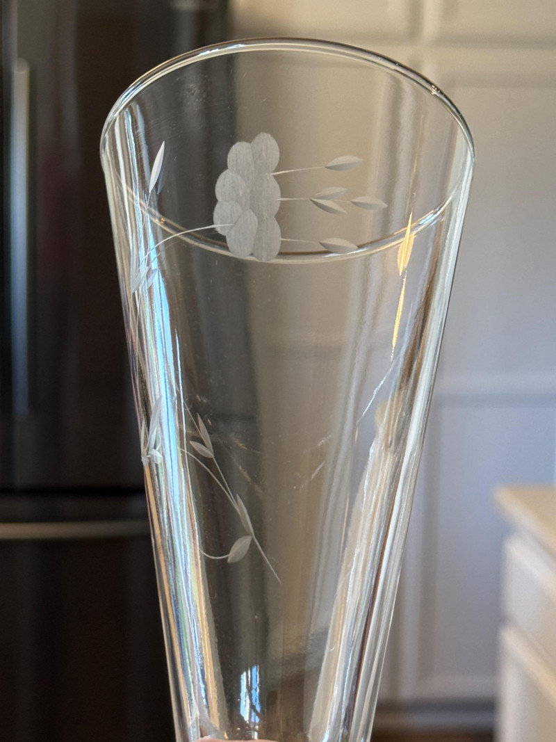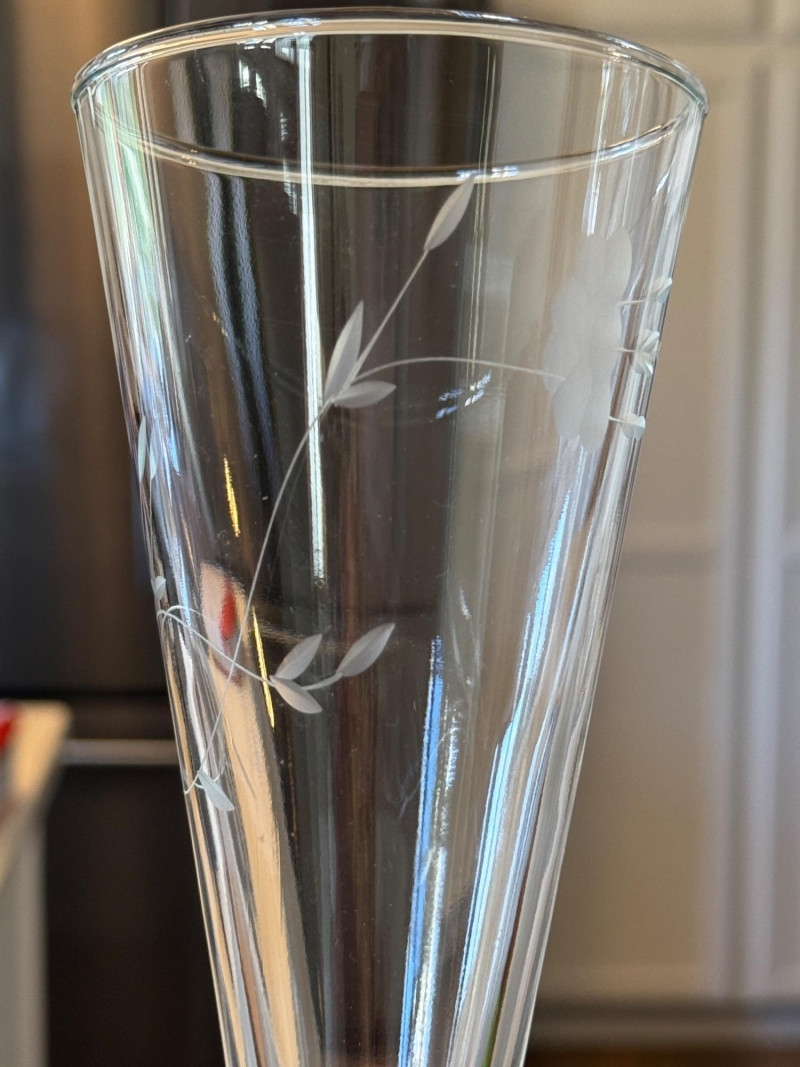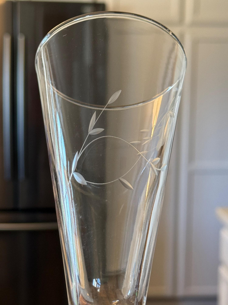 (4) vintage Princess House Heritage etched crystal pilsner glass. Each glass features a delicate floral etching pattern. The glass is made of hand-blown crystal. 3.25”x7.5”