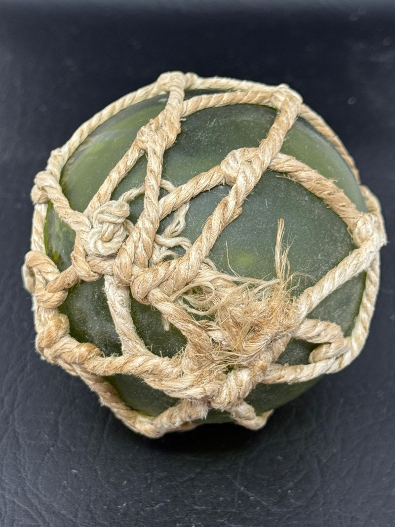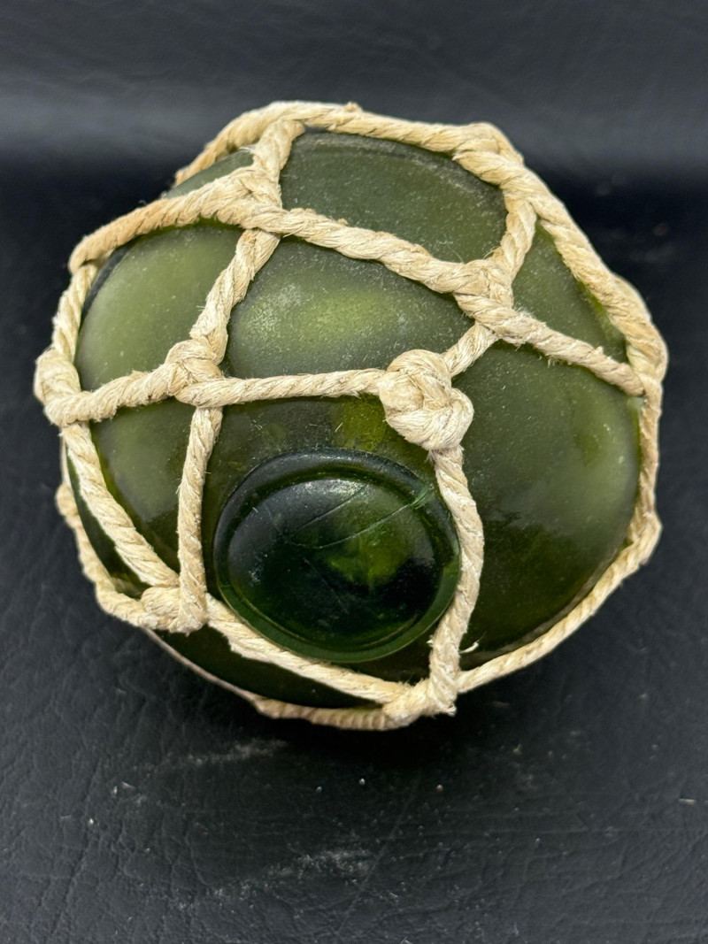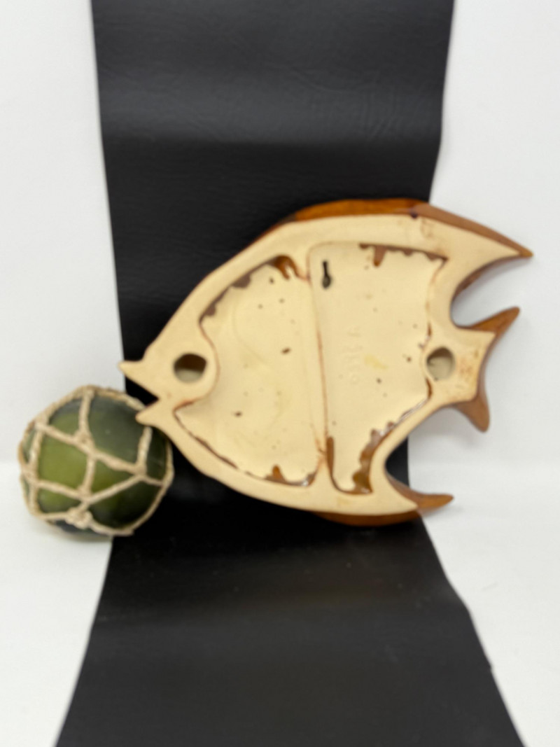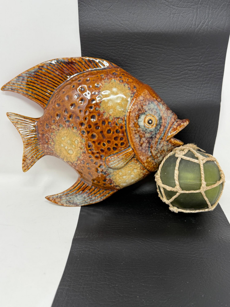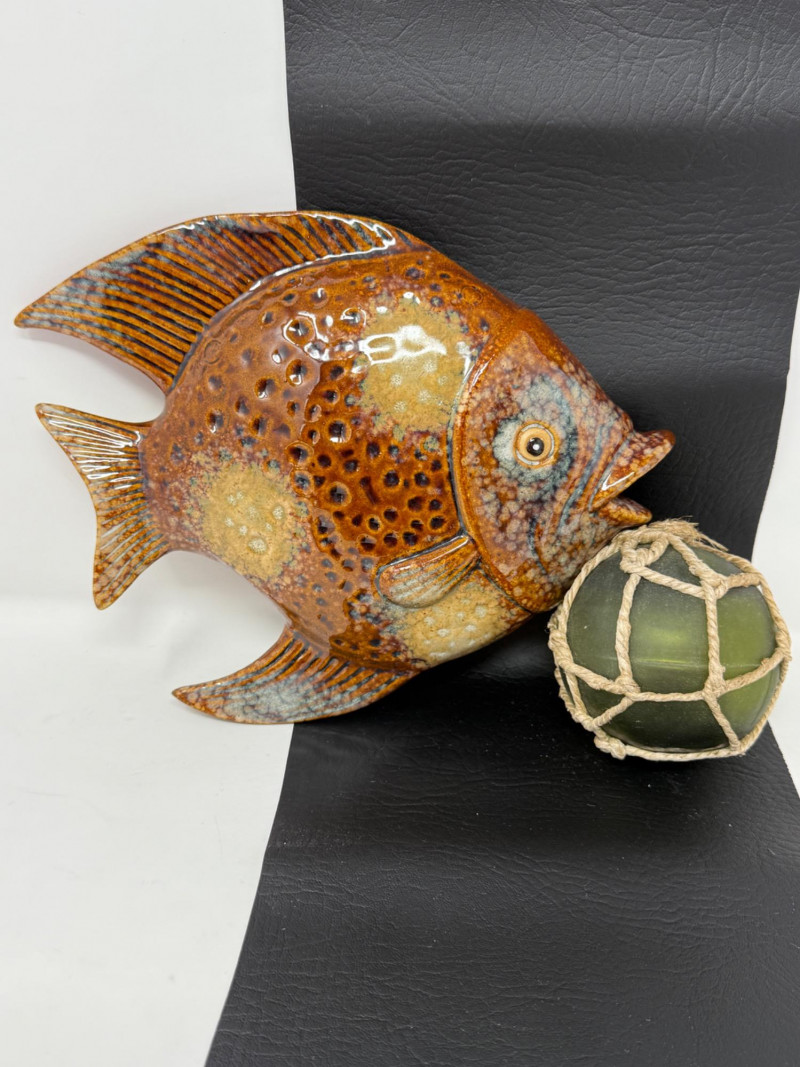 Ceramic Goldfish Wall Art With Green Glass Float in Netting 10.5”x8.25” Mottled brown and tan ceramic goldfish wall art.