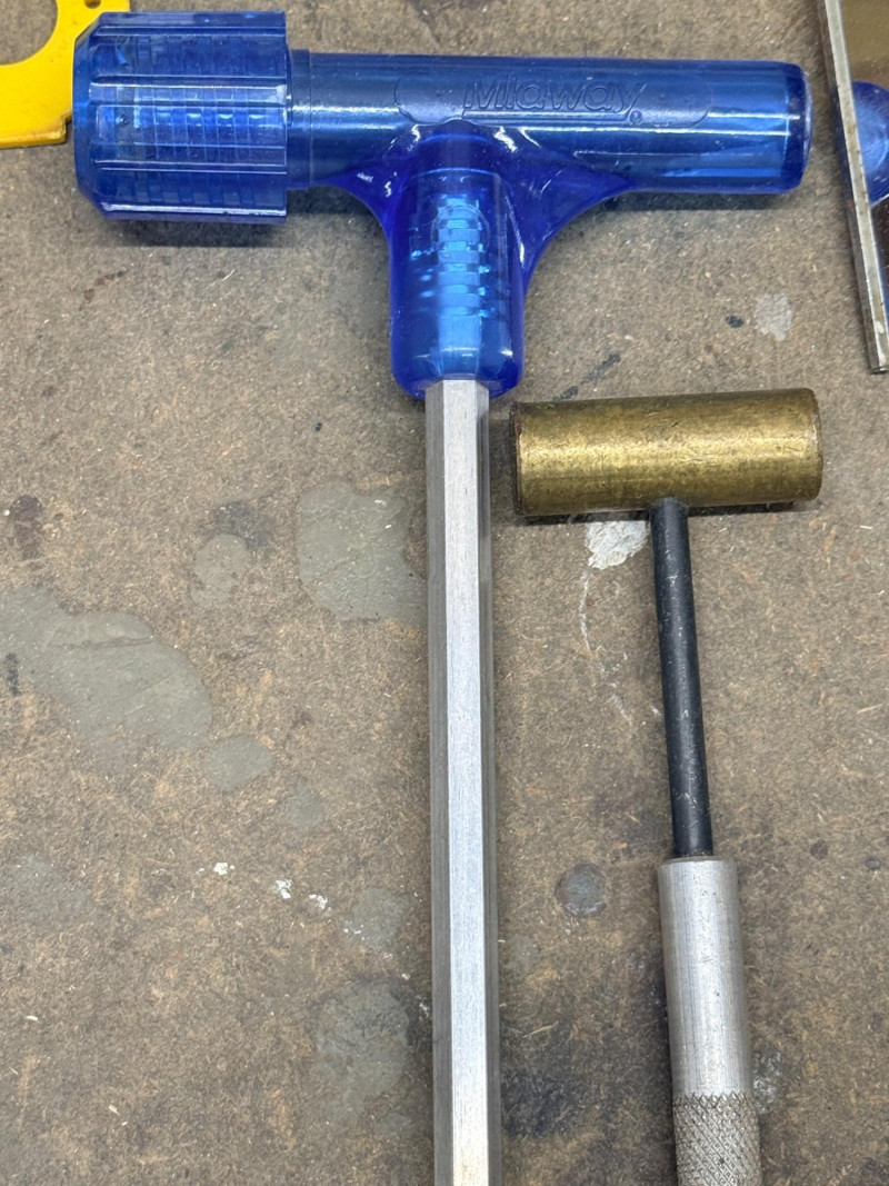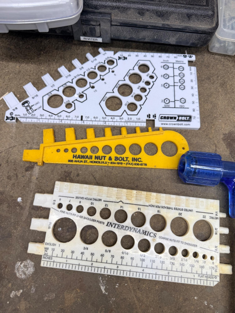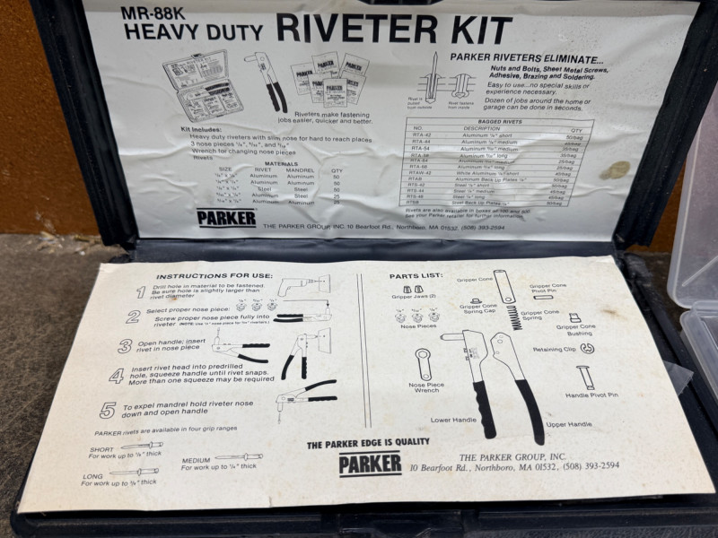 Riveter Kit & Miscellaneous Tools and Hardware Parker riviter kit 2 small specialty hammers Magnetic bowl and long handle pick up sticks Adjustable mirror with long handle Measuring cards 1/4' steel stamps 0-9 in wood box Hex head fasteners Wall anchor kit