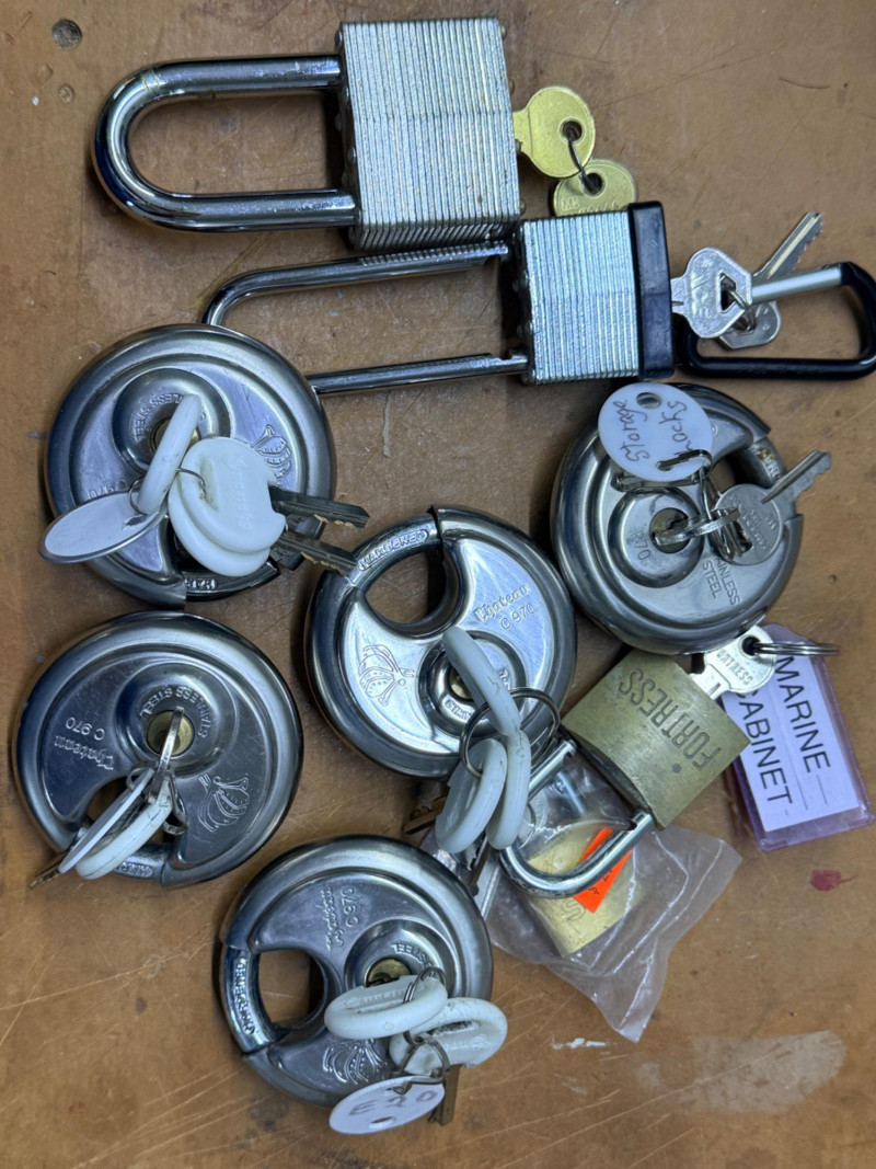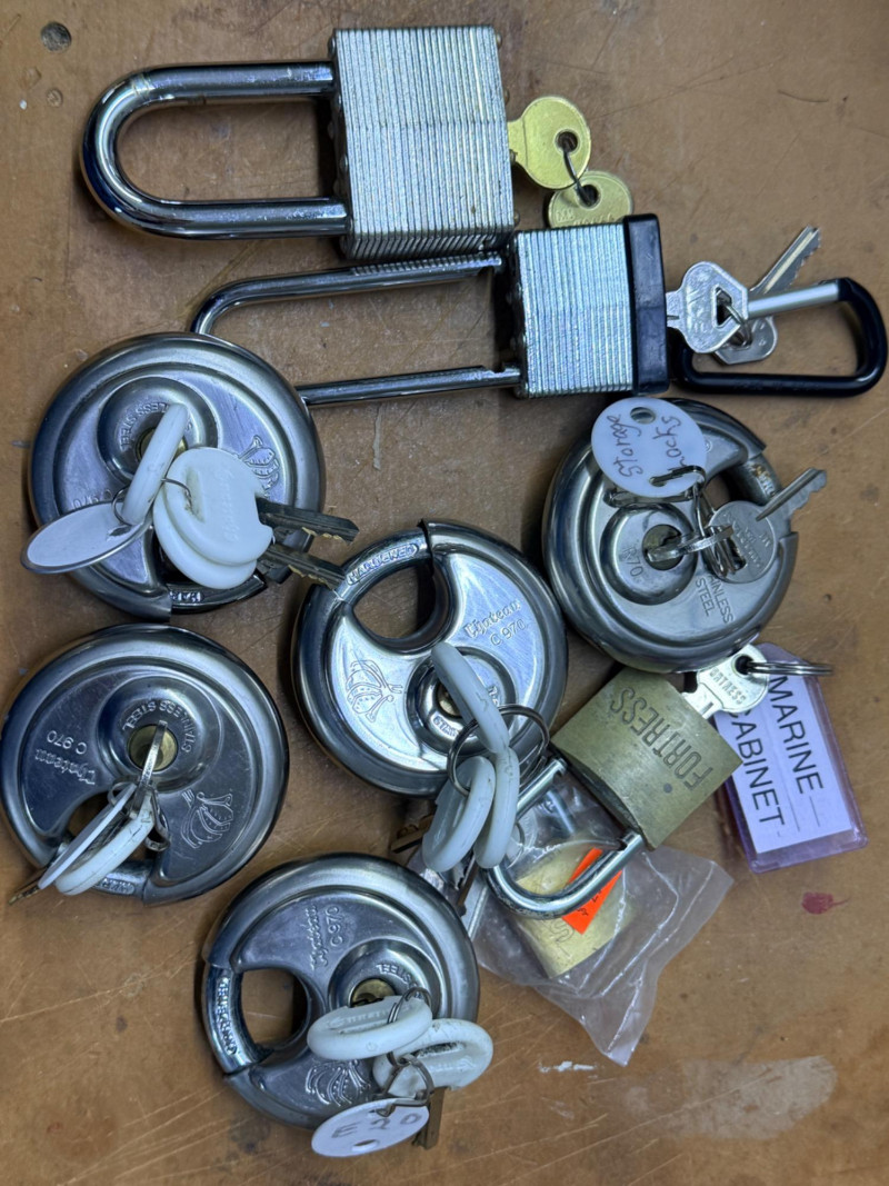 (8) Shackle and round padlocks with keys. (5) Chateau sliding closure locks with keys. Brass Fortress small shackle and smaller brass shackle underneath.