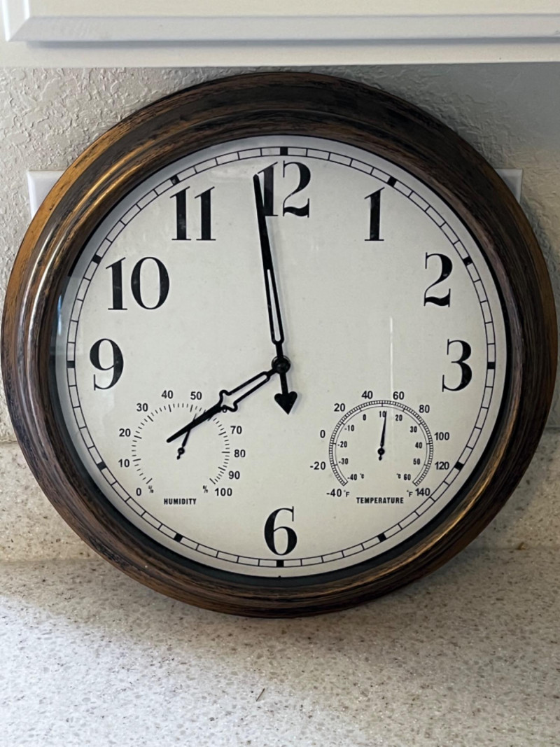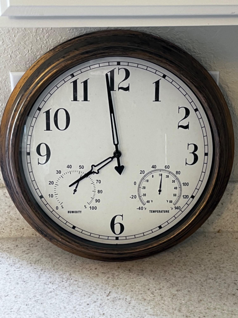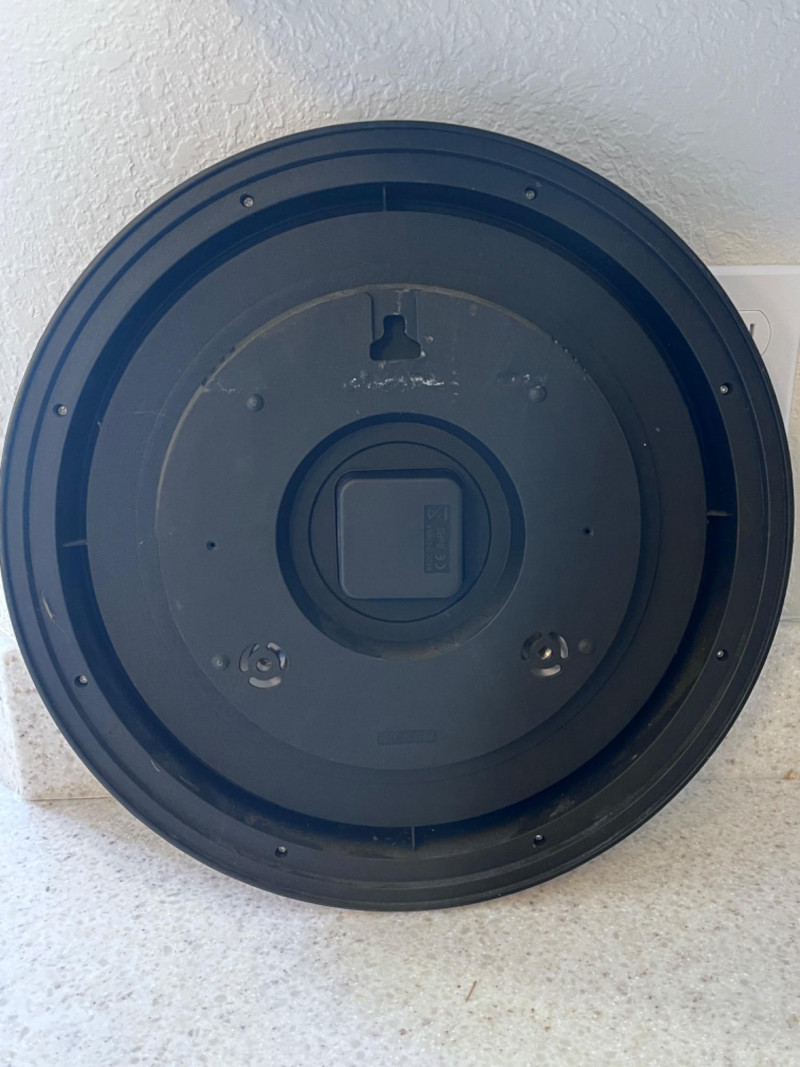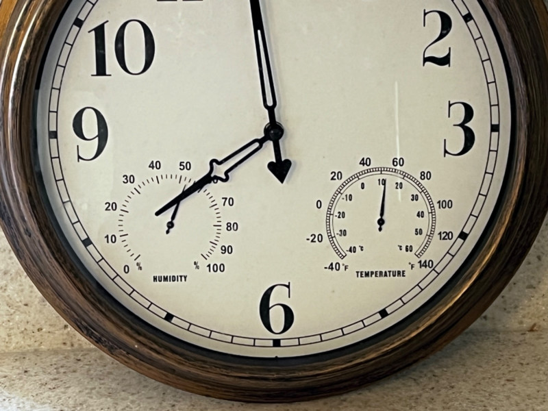 Indoor/Outdoor Wall Clock with Built-in Thermometer and Hygrometer Measures temperature from -40℉ to 140℉ (-40℃ to 60℃) Measures humidity from 0% to 100% RH Designed to be waterproof and non-ticking Features a vintage bronze-toned frame Not tested. 15 1/4” across.