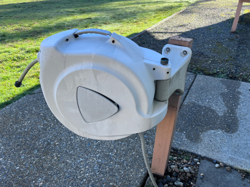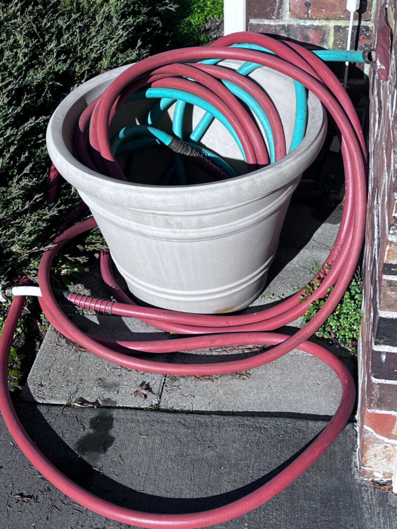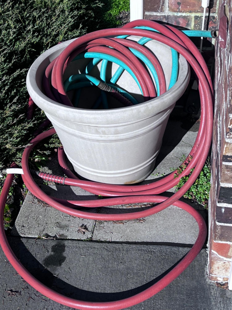 Tan hose bucket/planter.