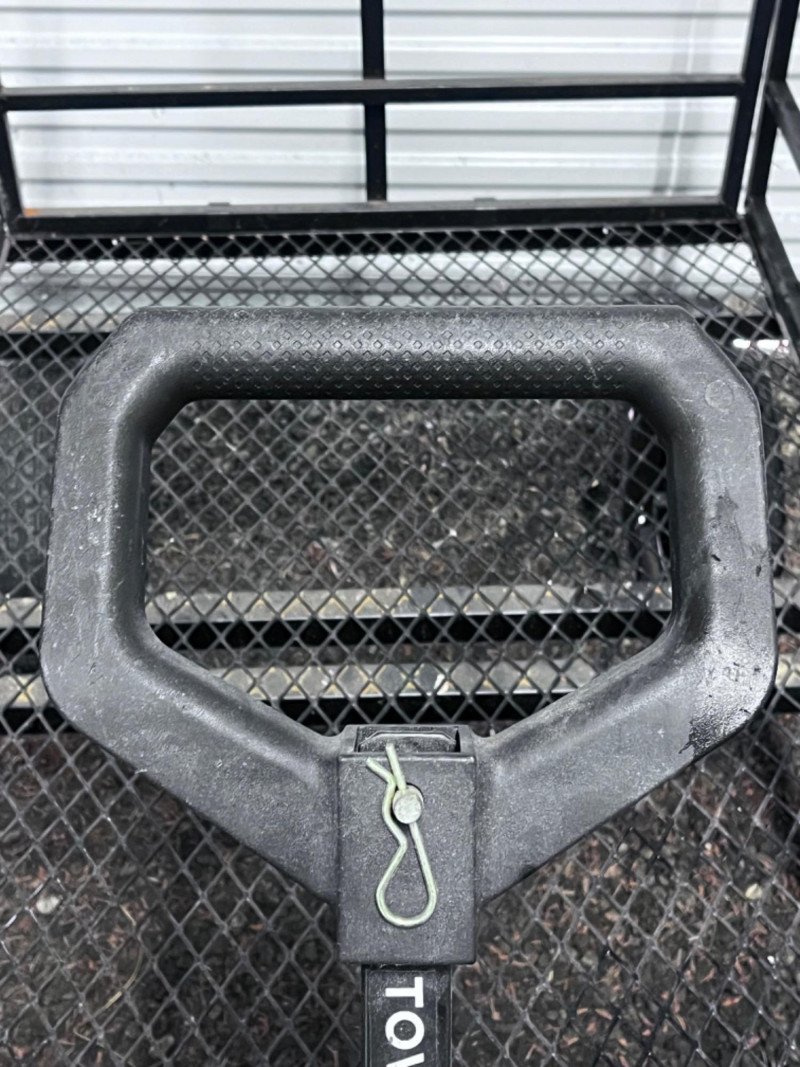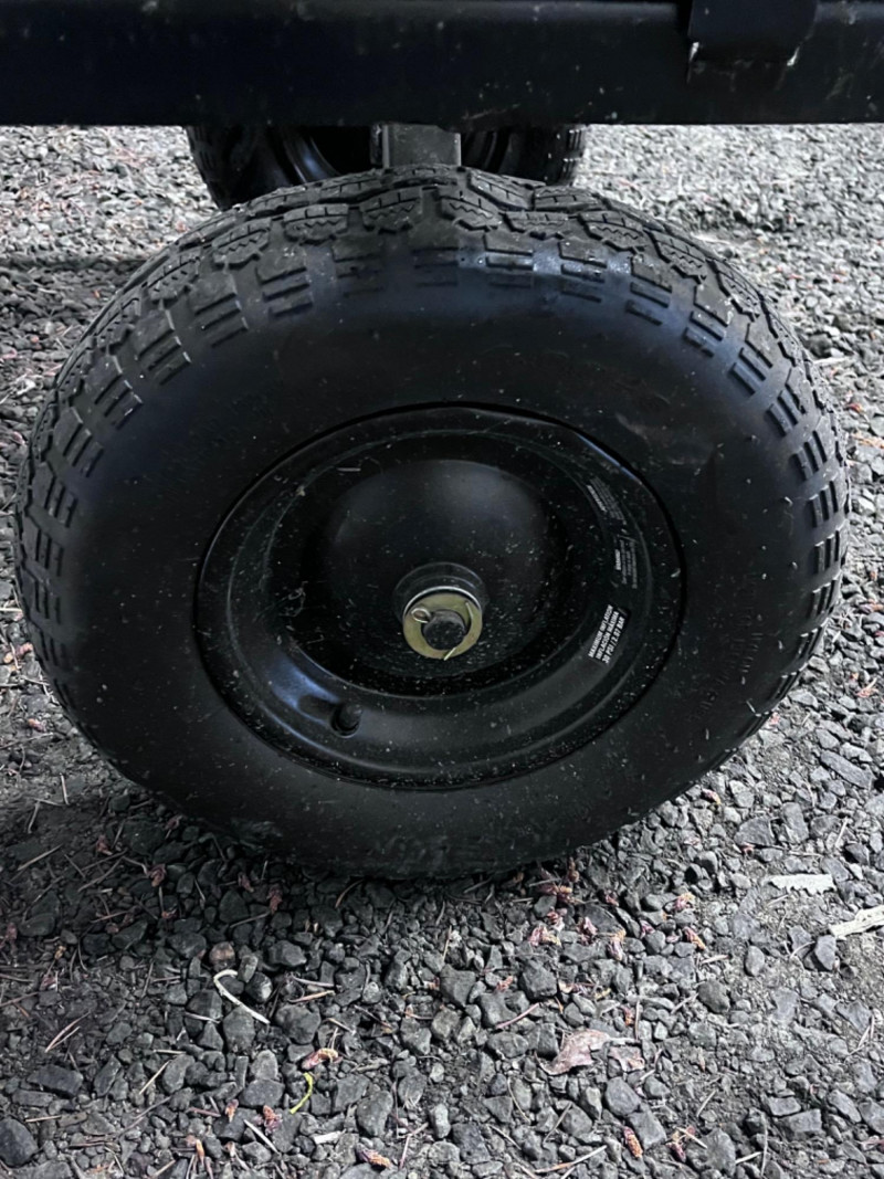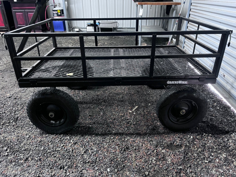 Large 12 cubic feet volume capacity and is rated for heavy loads up to 1,400 lbs.. The cart features removable sides, allowing it to quickly convert into a flatbed for transporting oversized or bulky items. It is equipped with a 2-in-1 handle that can be used for pulling by hand or converted into a trailer hitch for towing behind an ATV or tractor. The cart has four 16-inch all-terrain pneumatic tires designed to roll smoothly over various surfaces, including grass, dirt, and gravel. The rugged design includes a powder-coated steel frame and mesh deck built for durability and resistance to rust and wear. Tires need inflated. 34“ x 52“ x 30.5”
