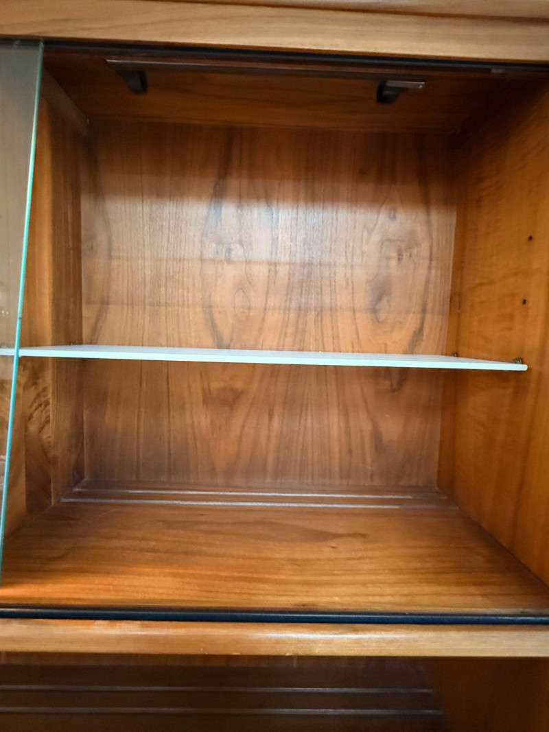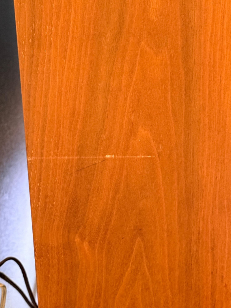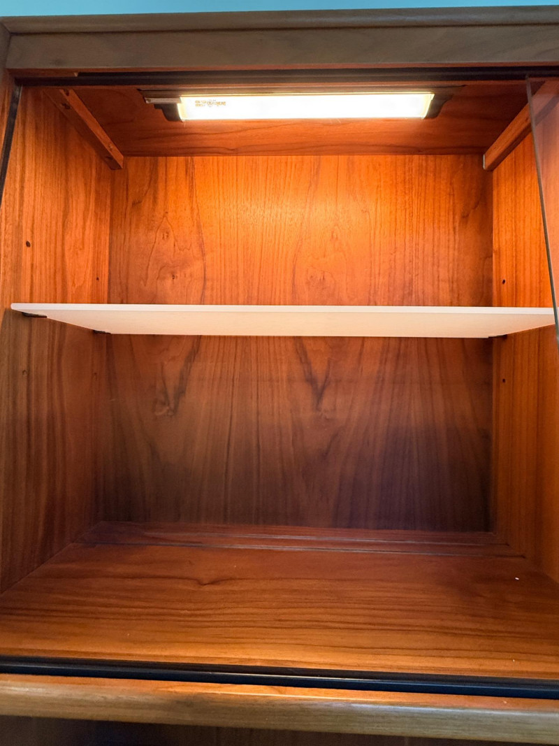 1950’s MCM Drexel “Declaration” Hutch This piece is a stunning Drexel "Declaration" Walnut Hutch, a classic mid-century modern furniture set designed by Kipp Stewart and Stewart MacDougall in the 1950s. Crafted from walnut wood, featuring white porcelain and brass knobs. A lighted display cabinet with two sliding glass doors and adjustable milk glass shelves. A buffet/credenza consisting of two doors on the left (opening to a cabinet with an adjustable shelf) and three drawers on the right and includes a lower light activated by a push-button when the doors are opened. Minor marring, and two moisture discolorations (4”x2” and 1”x2”) on the credenza surface. See photos for details. Please reach out with any questions. Other Drexel Declaration pieces also available in this auction.