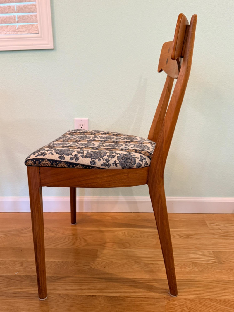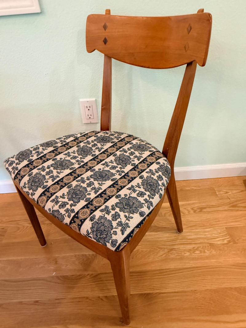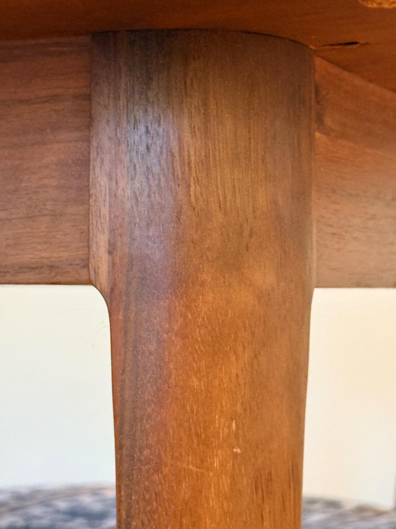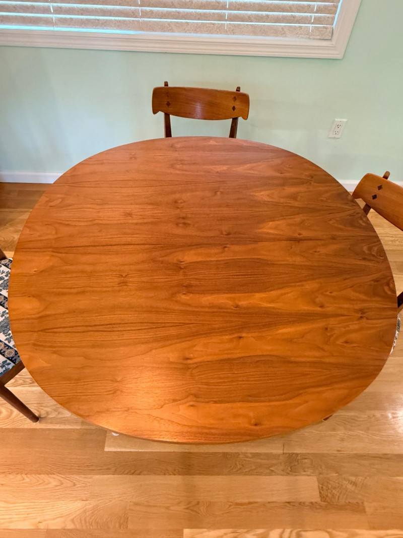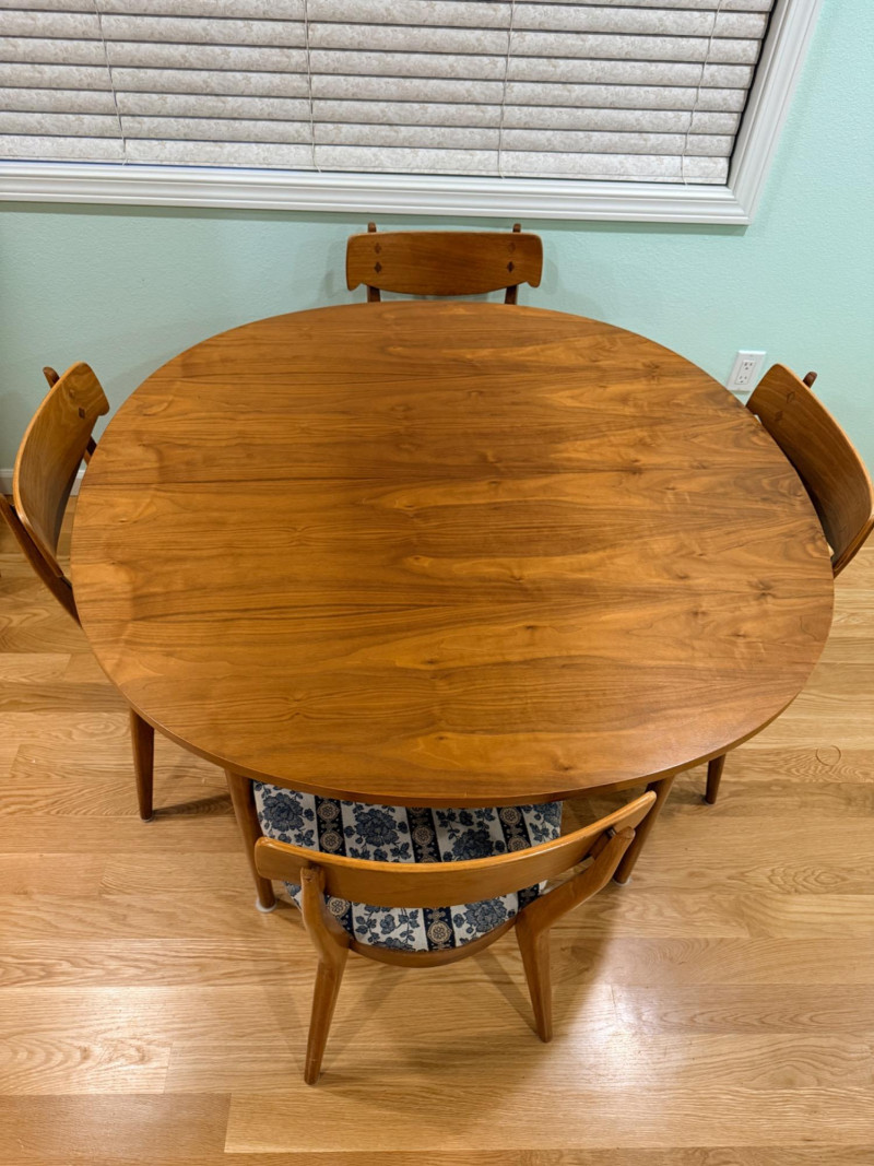 Mid-century modern walnut dining chairs from the Declaration collection for Drexel Furniture, designed by Kipp Stewartand Stewart MacDougall. The chair is part of a celebrated 1960s collection known for its high-quality construction and distinctive design elements. Crafted primarily from solid walnut. The backrest features signature inlaid rosewood medallions(the small diamond shapes seen in the photos), which are characteristic of the Drexel Declaration line. It boasts a sculpted, curved backrest and gently tapered legs, typical of the clean lines found in mid-century design. A round top with extension capability and slender tapered legs. It was designed by Kipp Stewart and Stewart MacDougall. Made of walnut. Table measures 44.5" W x 29.25" H x 44.5" D. No leaves. Chairs measure 20”x19”x23” back height 18” seat height