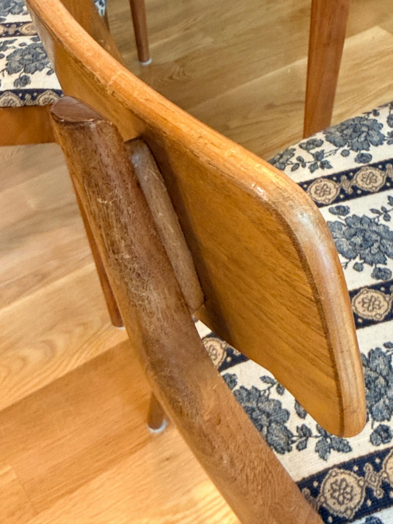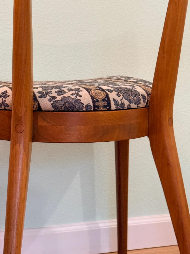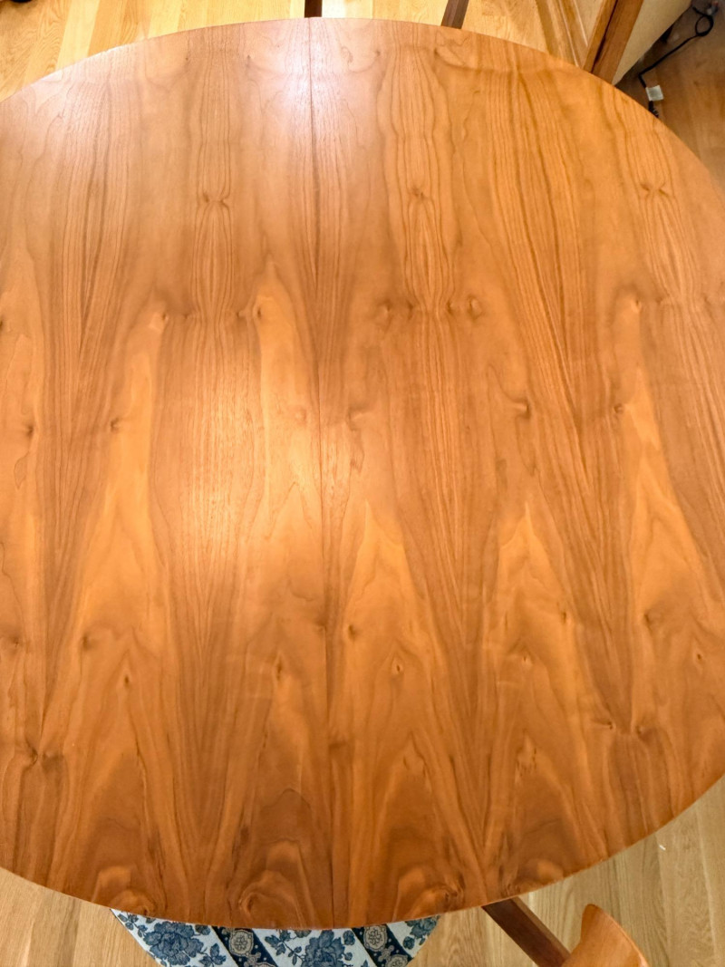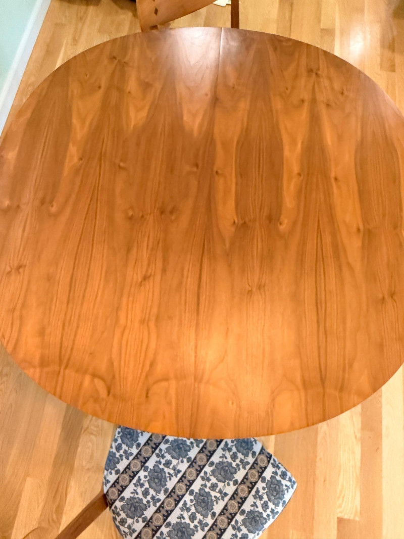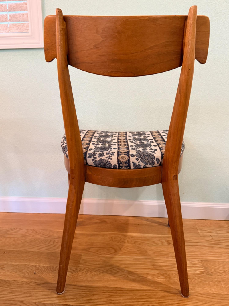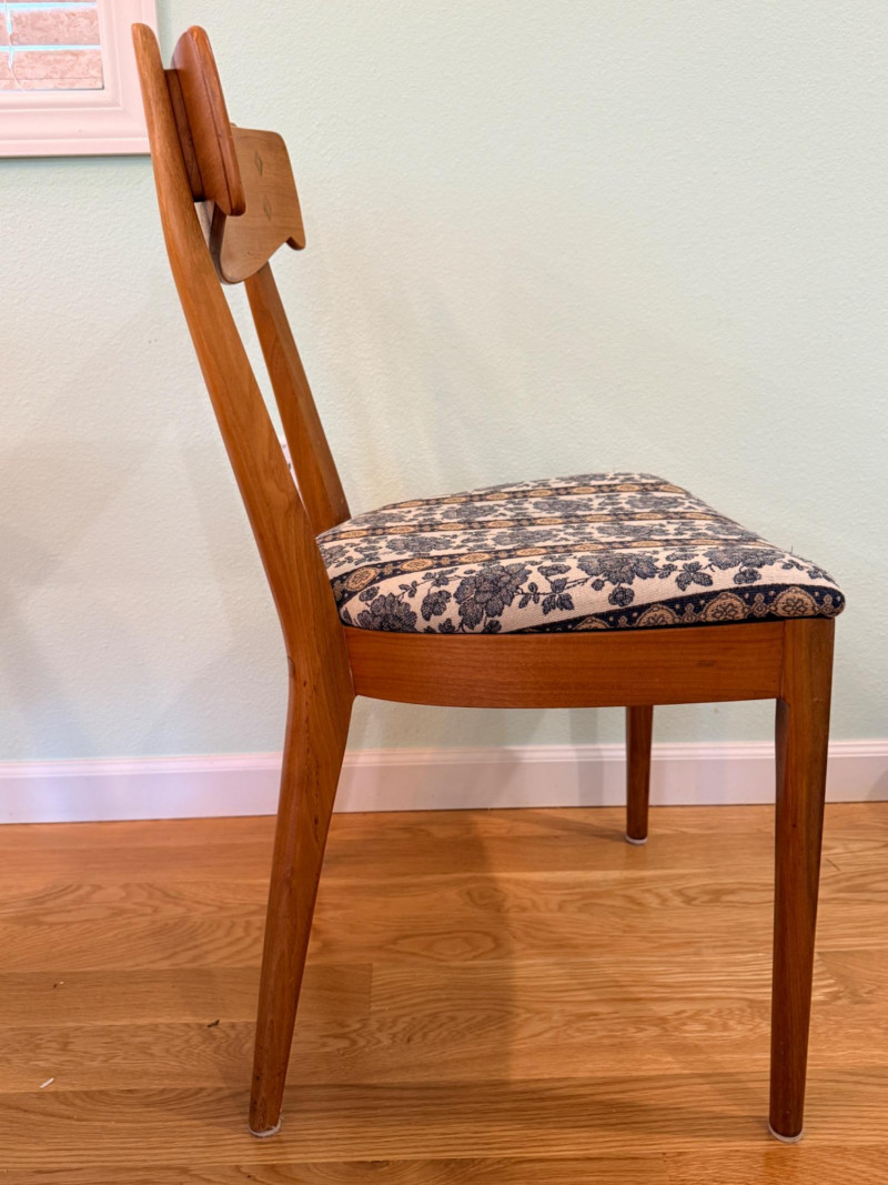 Mid-century modern walnut dining chairs from the Declaration collection for Drexel Furniture, designed by Kipp Stewartand Stewart MacDougall. The chair is part of a celebrated 1960s collection known for its high-quality construction and distinctive design elements. Crafted primarily from solid walnut. The backrest features signature inlaid rosewood medallions(the small diamond shapes seen in the photos), which are characteristic of the Drexel Declaration line. It boasts a sculpted, curved backrest and gently tapered legs, typical of the clean lines found in mid-century design. A round top with extension capability and slender tapered legs. It was designed by Kipp Stewart and Stewart MacDougall. Made of walnut. Table measures 44.5" W x 29.25" H x 44.5" D. No leaves. Chairs measure 20”x19”x23” back height 18” seat height