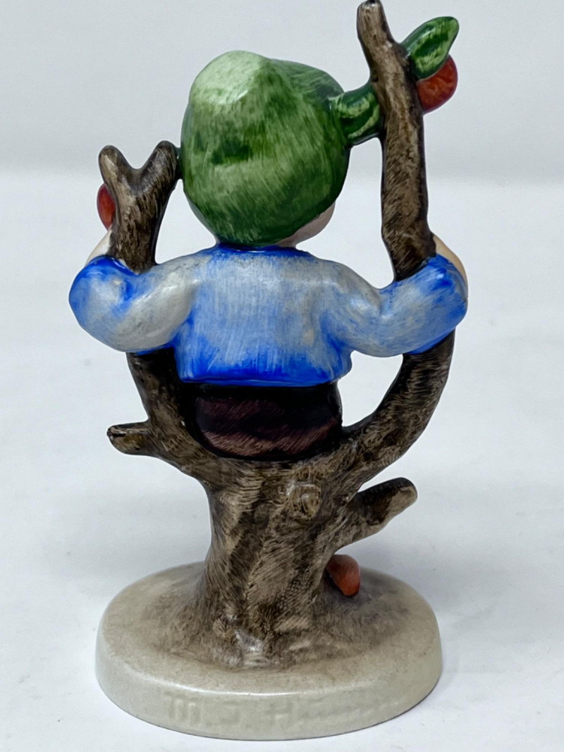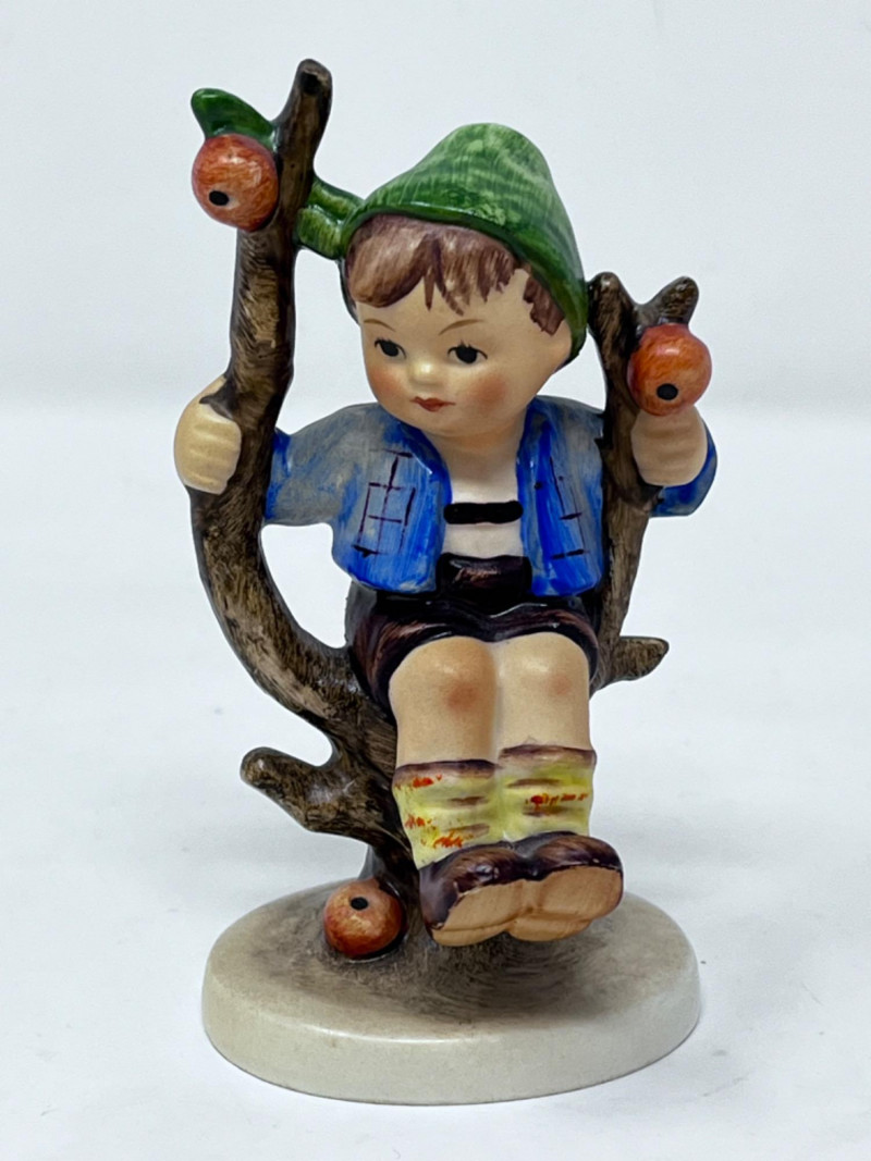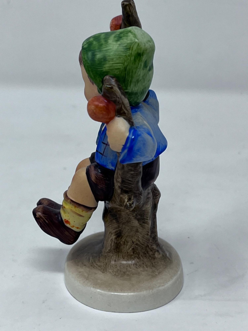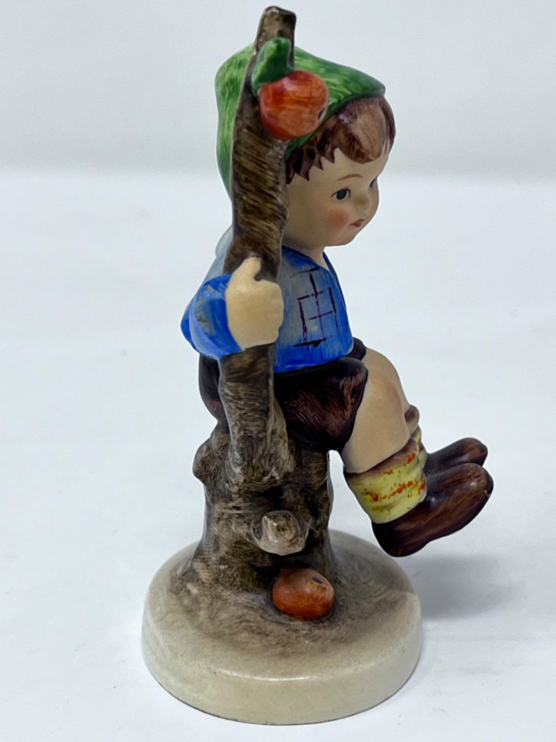 M.I. Goebel Hummels - “Playmates”, “Apple Tree Boy”, & “Feeding Time” 4.5”x 3” Depicts a young boy wearing a green hat, blue jacket, brown pants, and patterned socks, perched in the branches of an apple tree with red apples. 4”x 2” M.I. Hummel "Feeding Time" figurine, HUM 199 features a girl in a headscarf holding a bowl, surrounded by a rooster, a hen, and three small chicks.