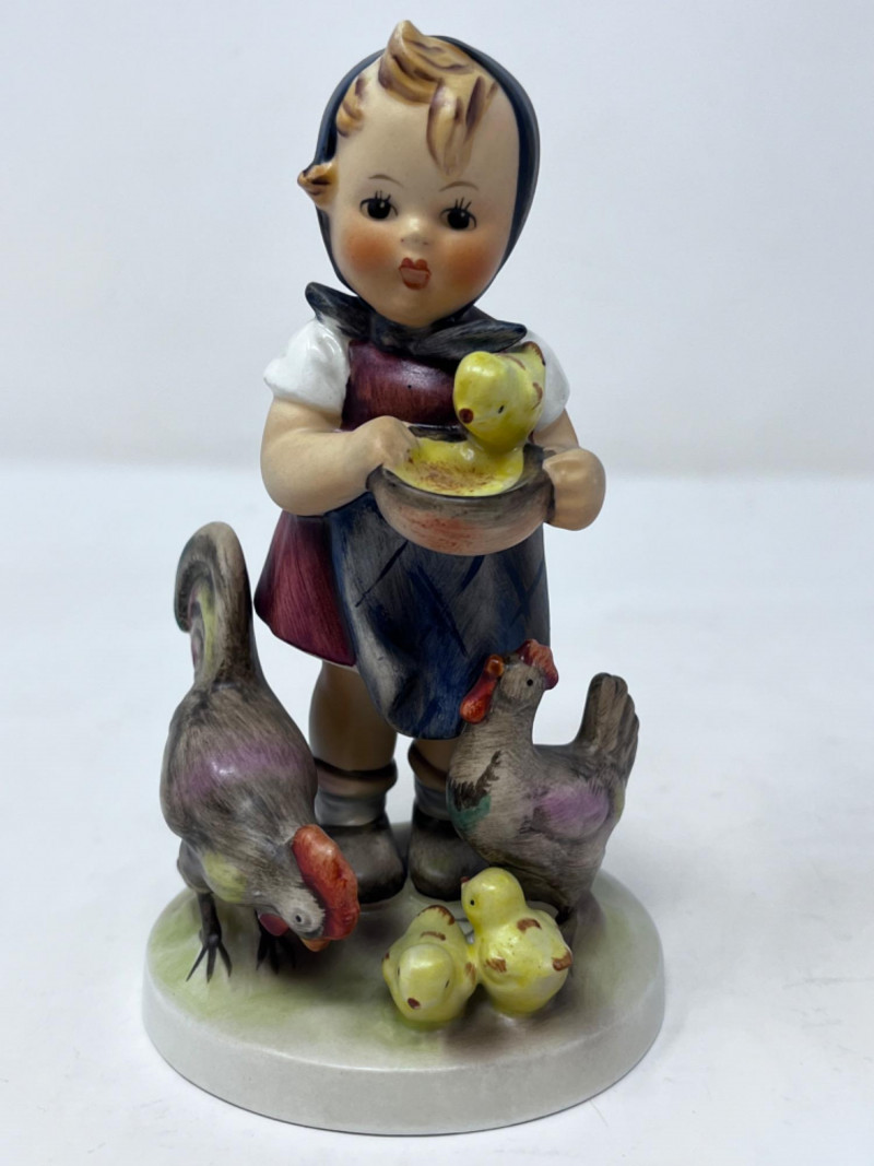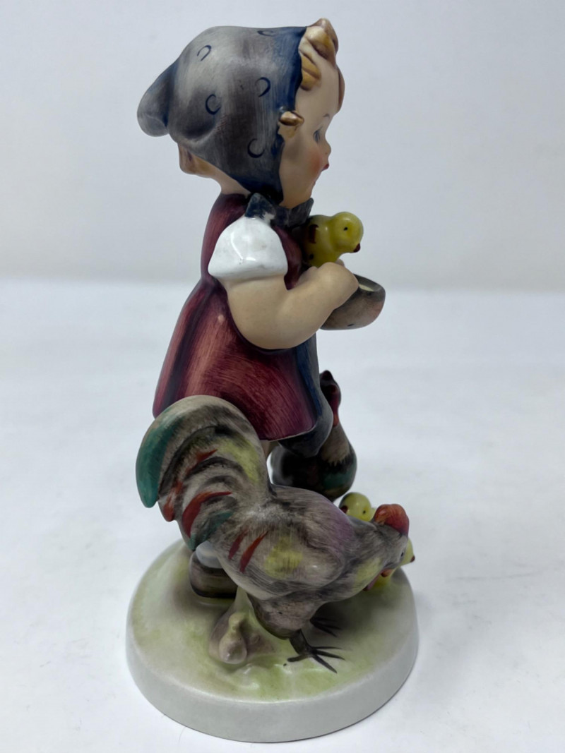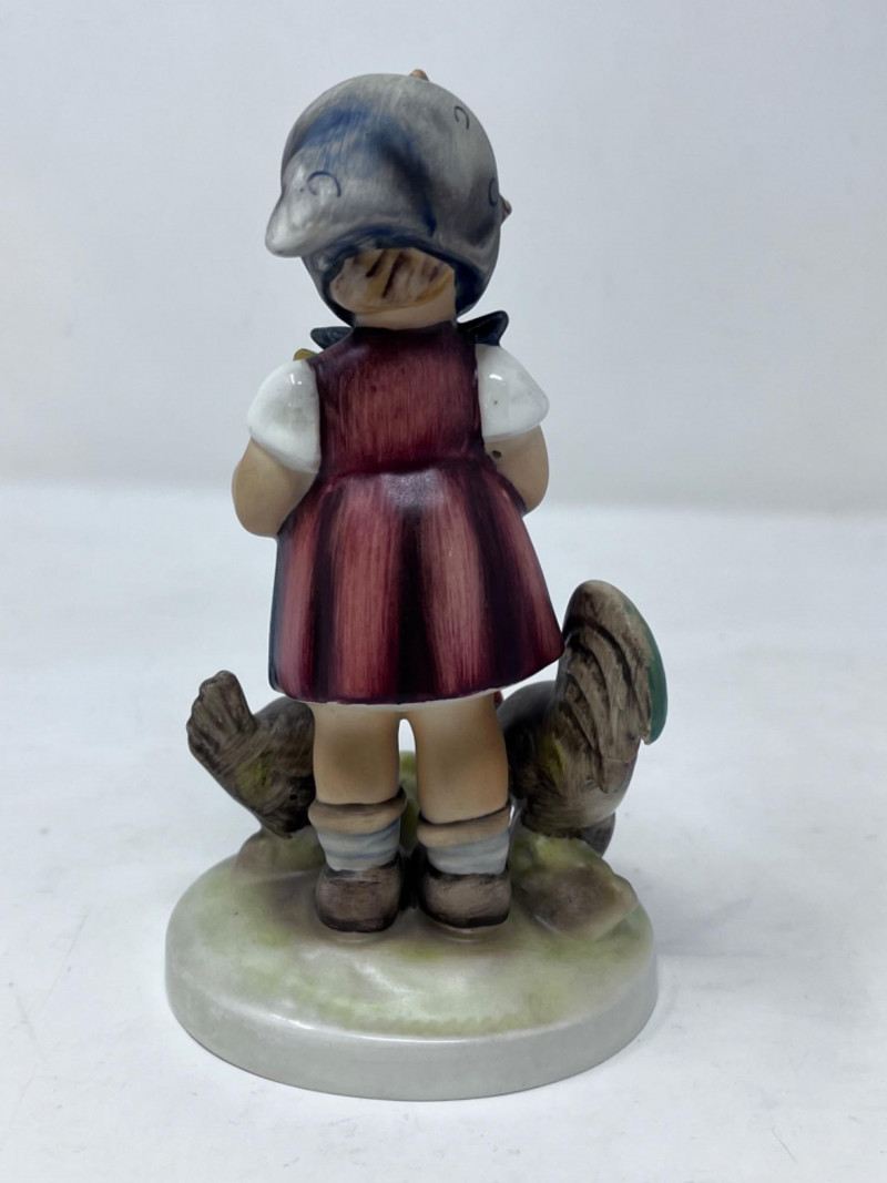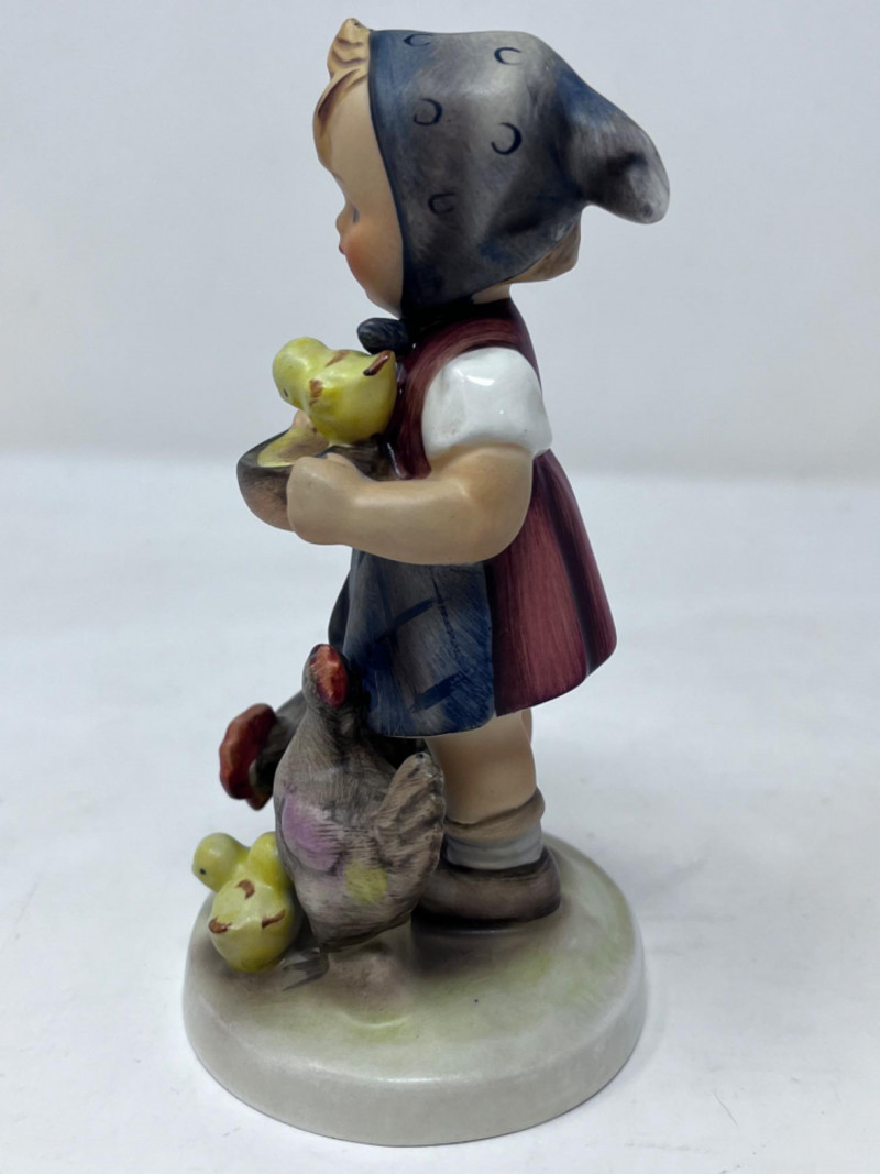 M.I. Goebel Hummels - “Playmates”, “Apple Tree Boy”, & “Feeding Time” 4.5”x 3” Depicts a young boy wearing a green hat, blue jacket, brown pants, and patterned socks, perched in the branches of an apple tree with red apples. 4”x 2” M.I. Hummel "Feeding Time" figurine, HUM 199 features a girl in a headscarf holding a bowl, surrounded by a rooster, a hen, and three small chicks.