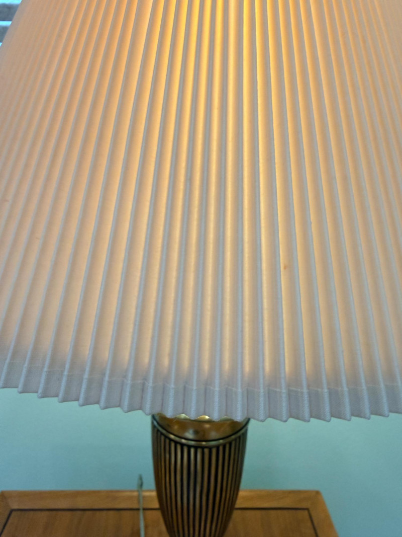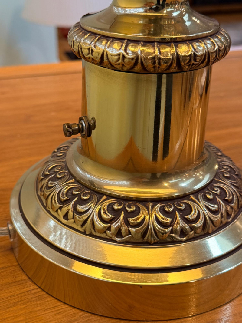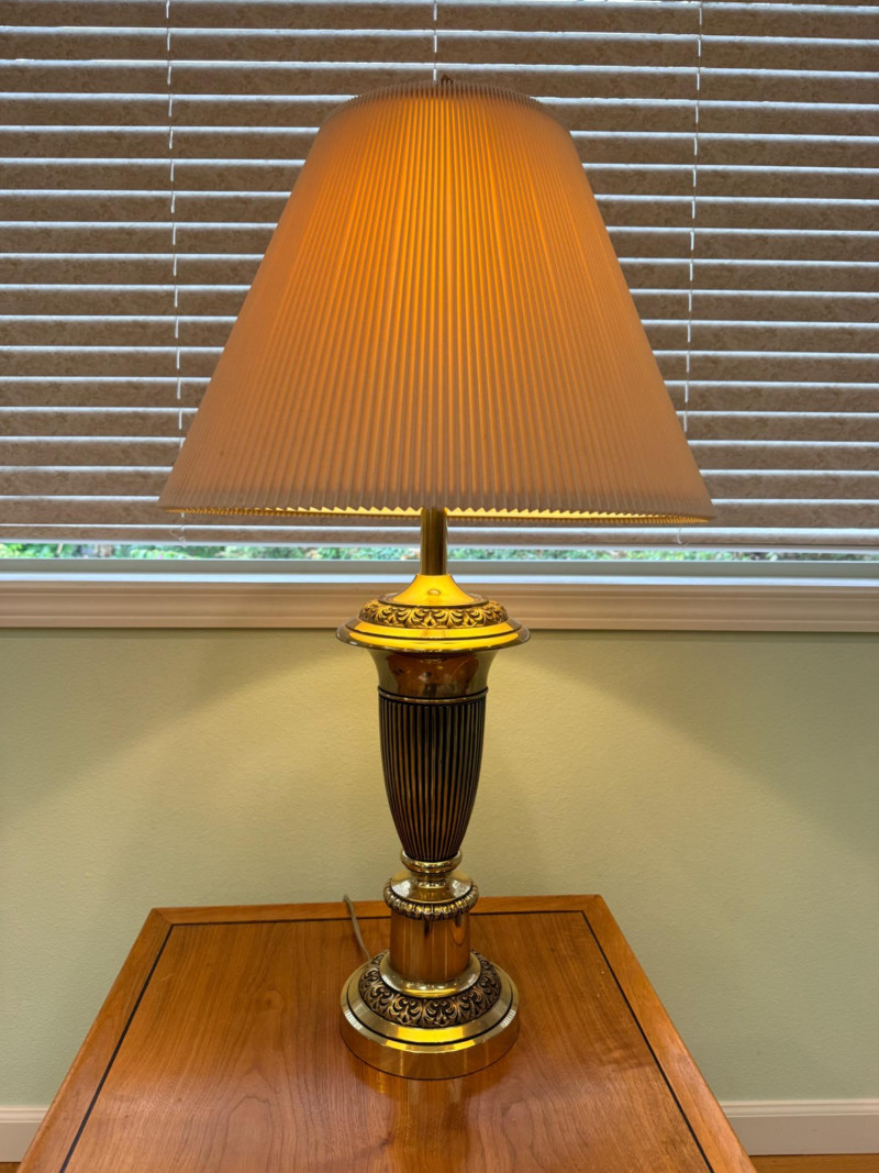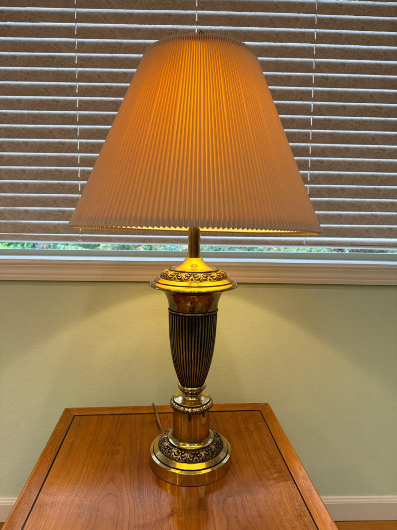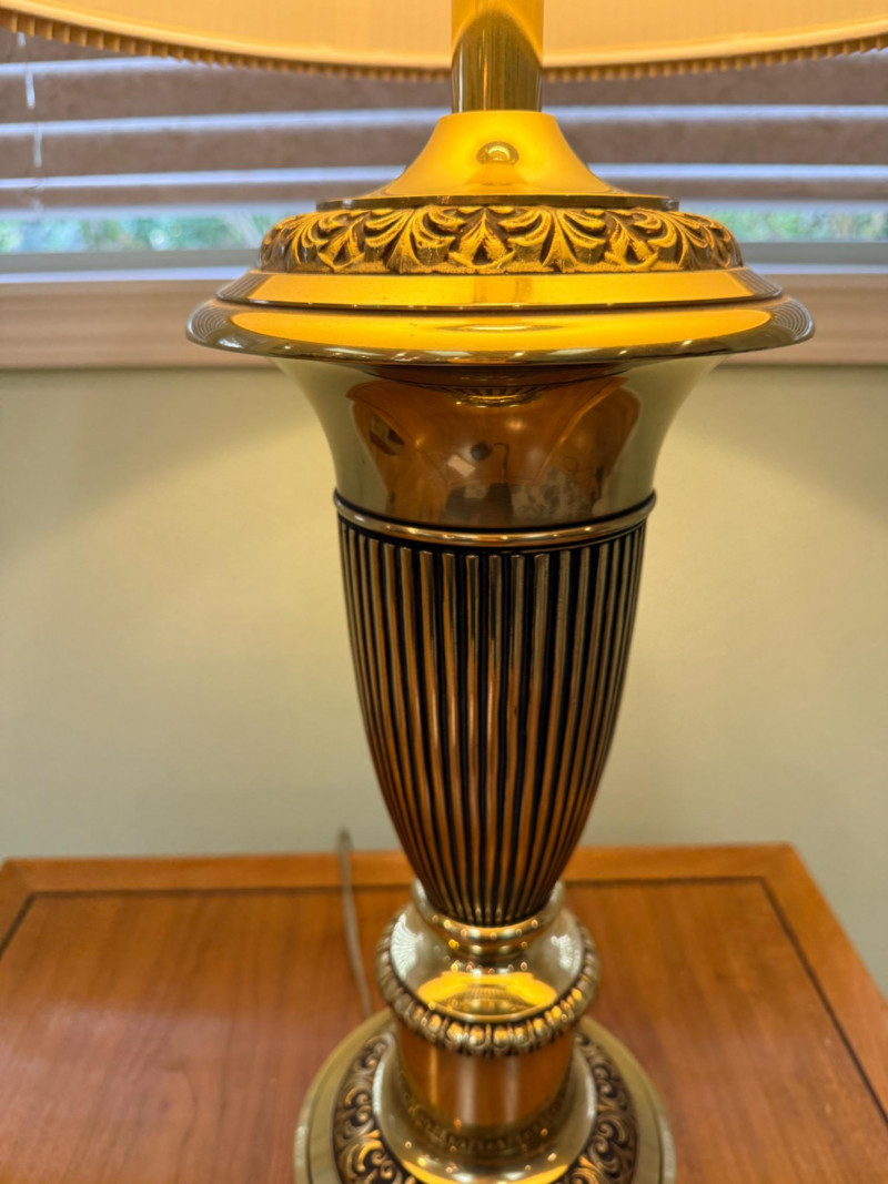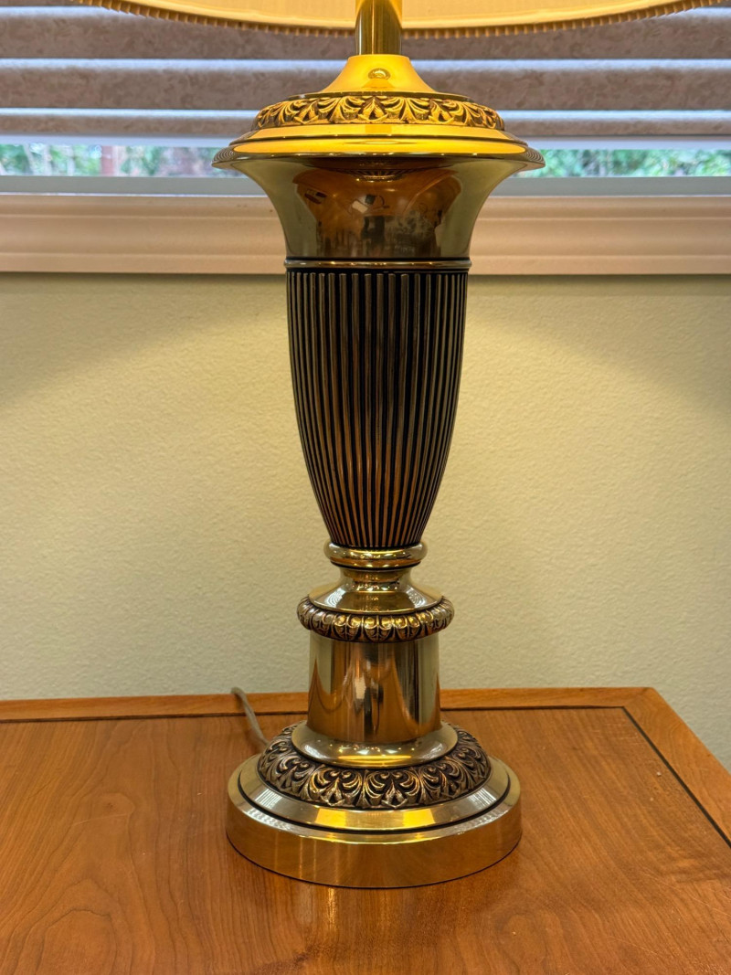 Stiffel 3-Way Brass Urn Table Lamp Vintage brass Stiffel, which is well-known for producing solid, high-quality brass lamps in this traditional or Hollywood Regency style. The lamp is made of polished brass, which develops a natural patina over time and gives it substantial weight. It features classic, ornate detailing on the base and stem, characteristic of traditional or vintage styling. The lamp is topped with a pleated paper or silk-blend shade, a common pairing that diffuses light for a warm, inviting glow. Twist knob on base, 7”x34”x19” shade. Beautiful and substantial brass lamp.