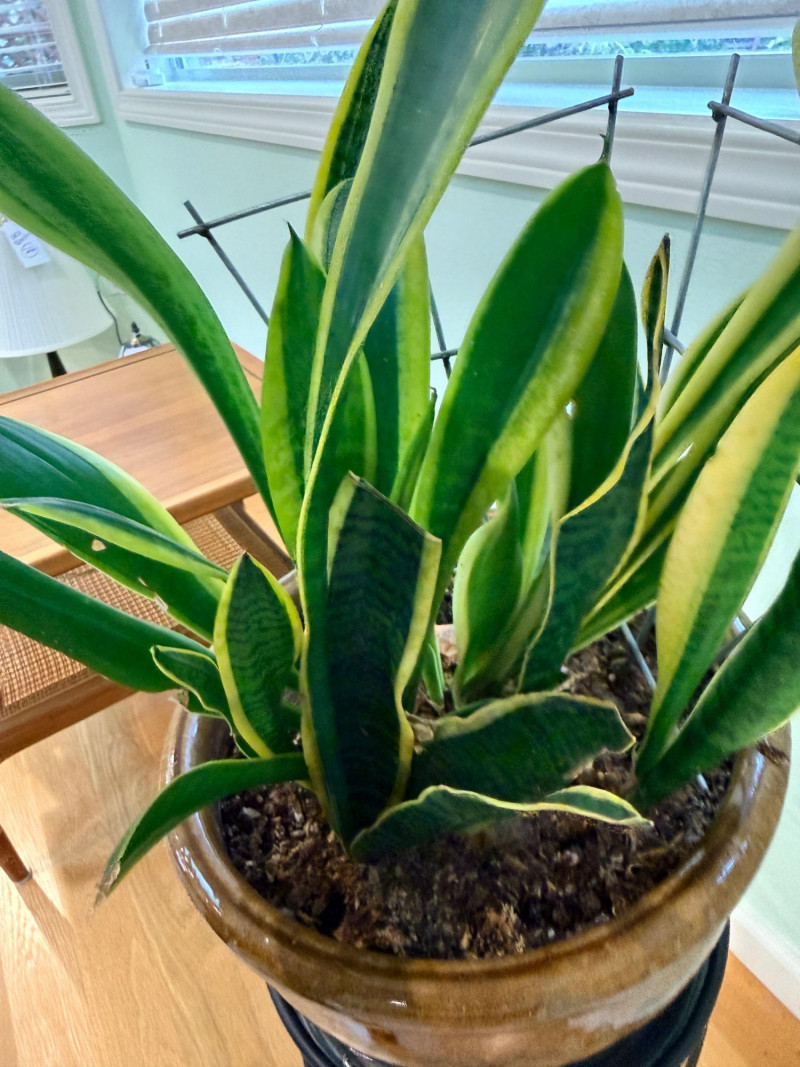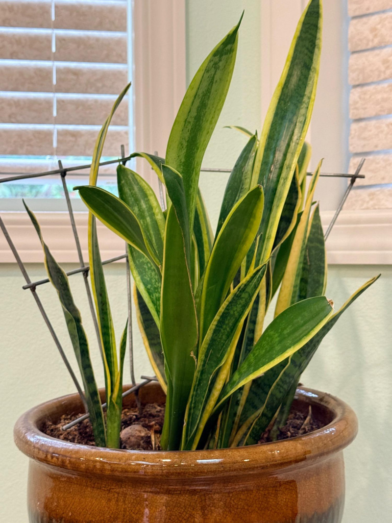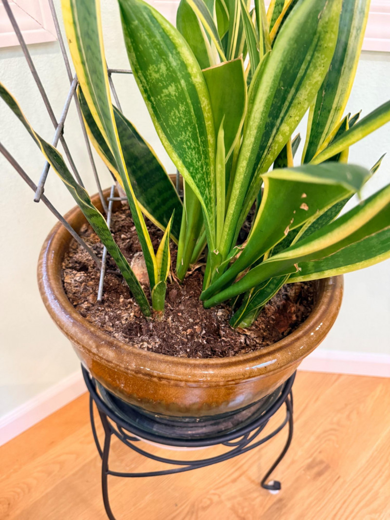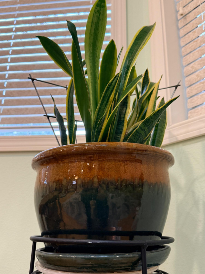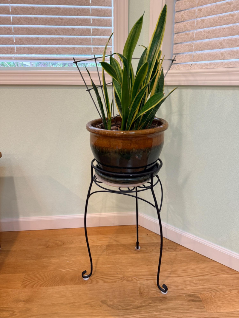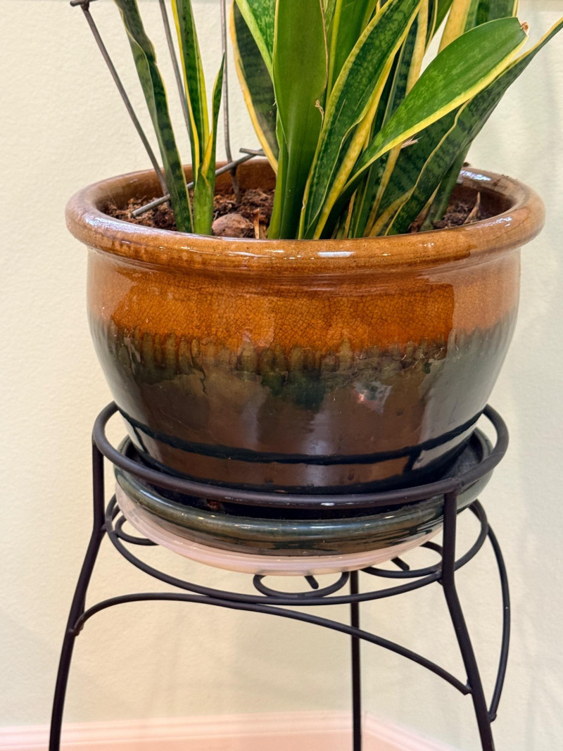 Happy Healthy Snake Plant in Ceramic Pot on Metal Stand 13” ceramic pot. 22” tall plant. Total height is 43”