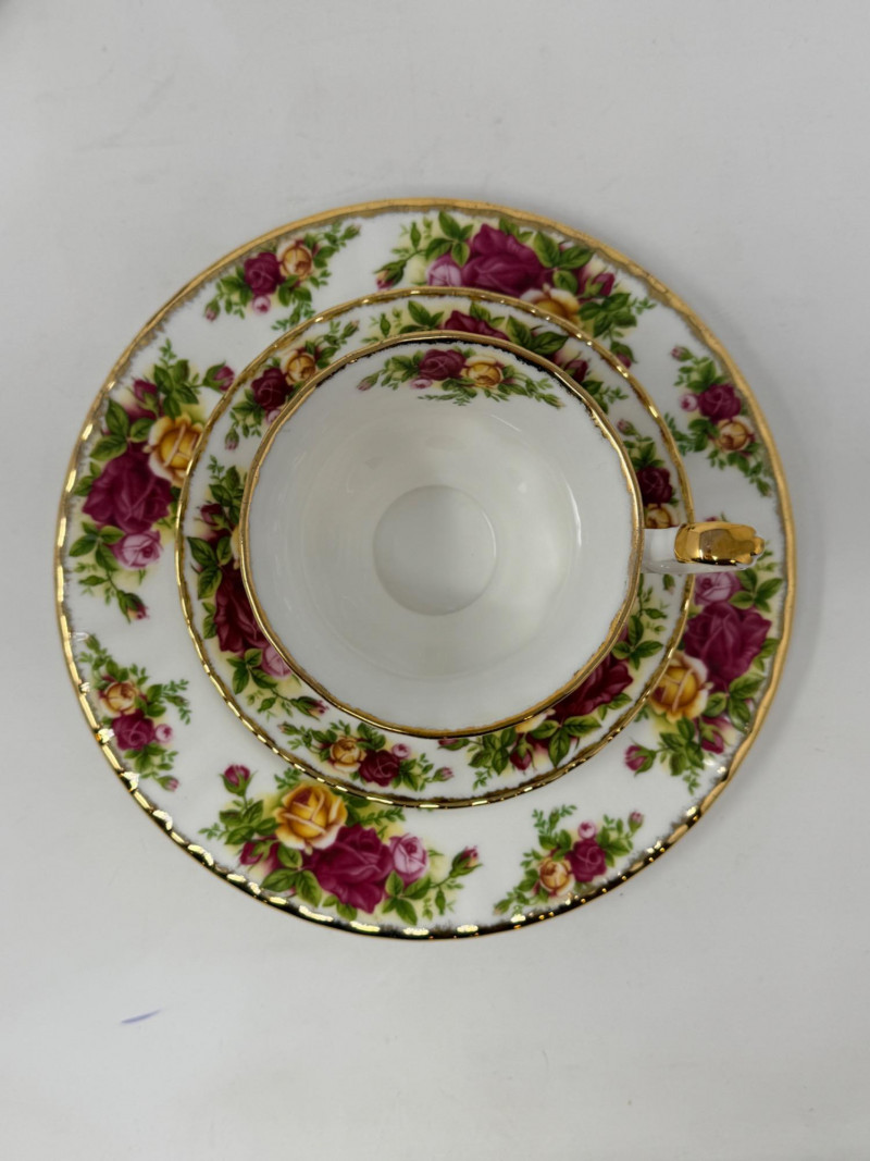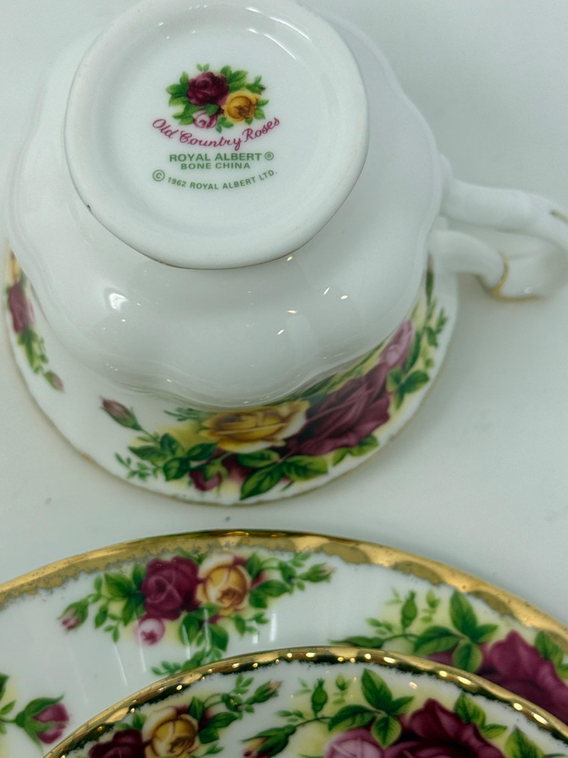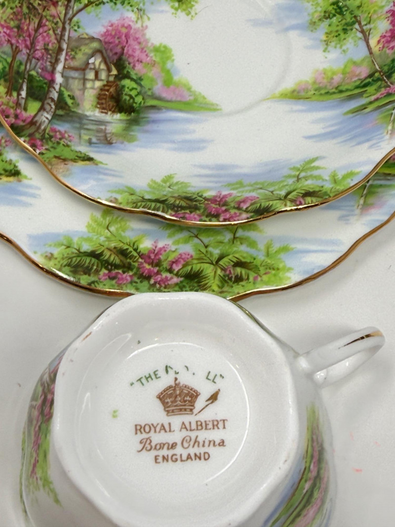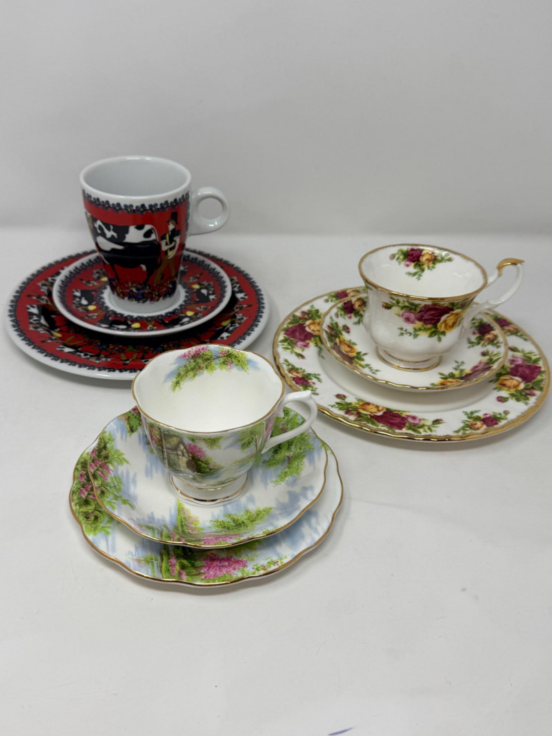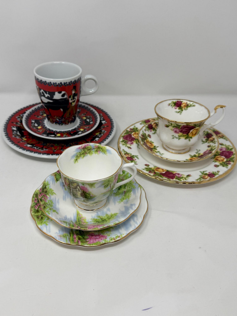 (3) Royal Albert and Suisse Tea Cup, Saucer and Plate Sets Royal Albert Old Country Roses 3 piece set Royal Albert The Old Mill 3 piece set Ishoni Langenthal Suisse 3 piece set