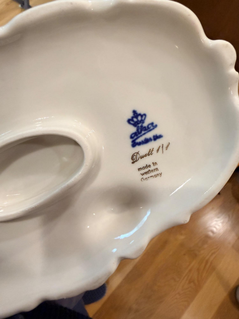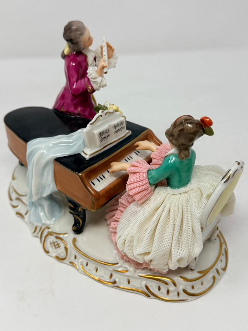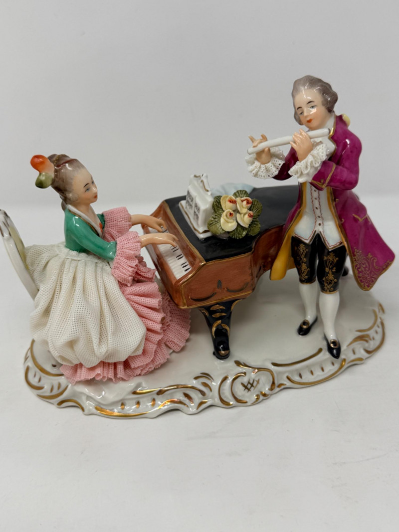 Vintage Alka Dresden Lace Porcelain Figure Musicians #127 The figurine depicts a couple, with a lady playing a piano and a gentleman standing and holding a musical score It is made from porcelain and features intricate porcelain lace detailing on the lady's dress. 4.75”x4.5”x5.5”