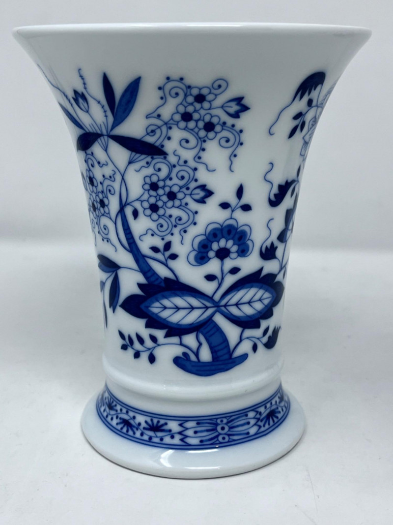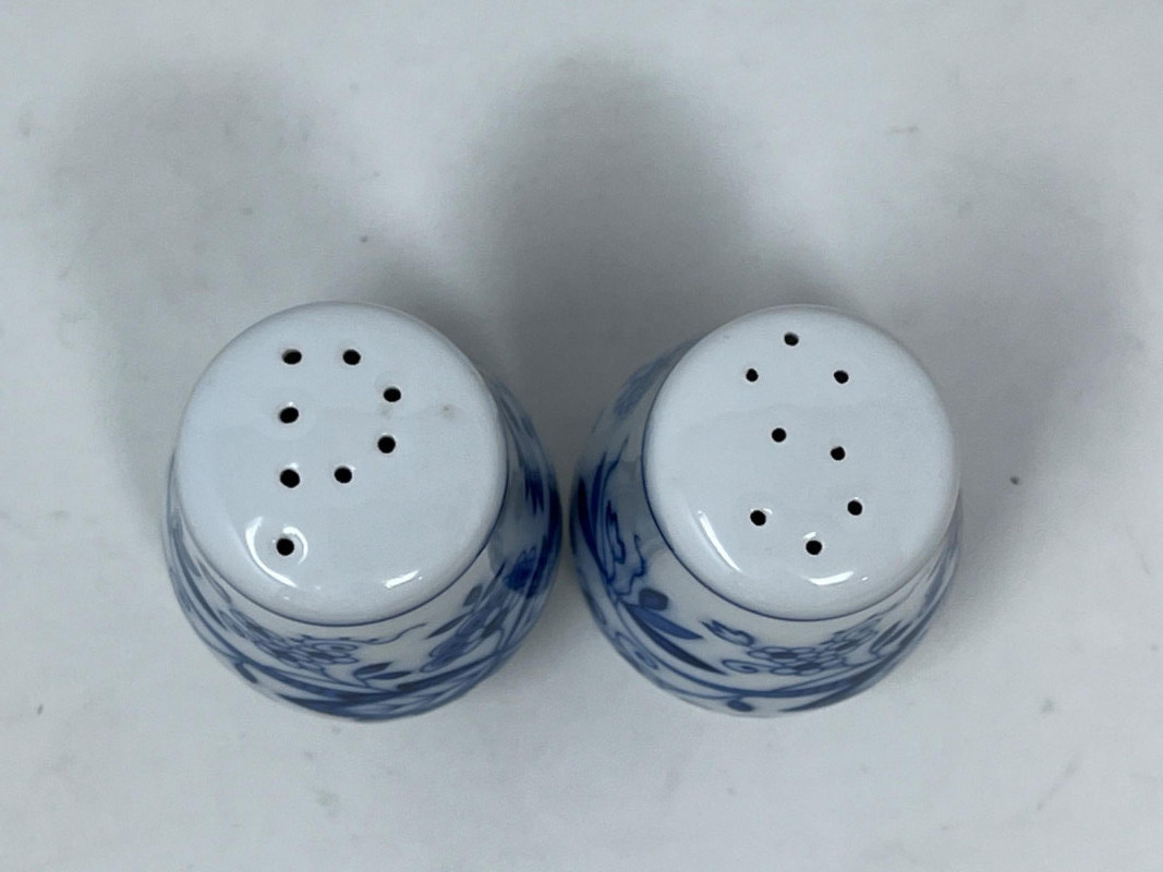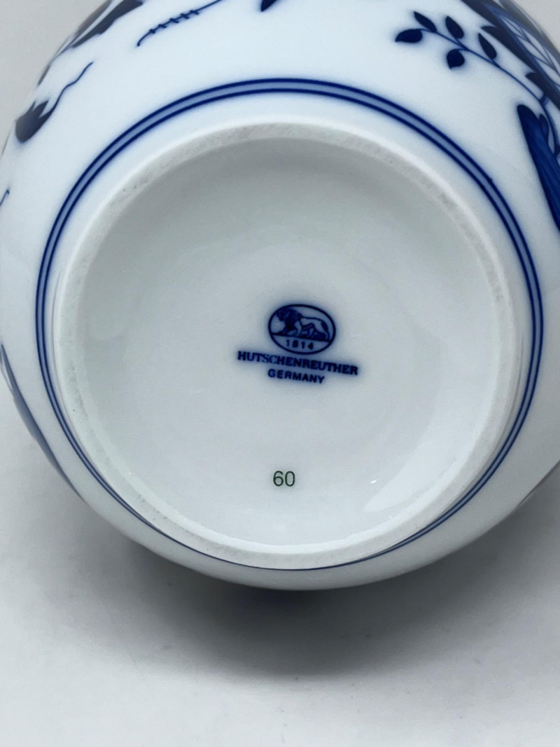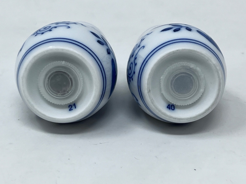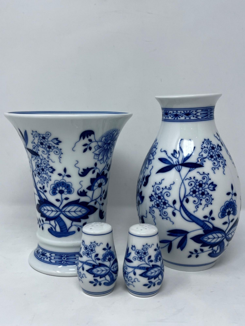 Hutschenreuther Porcelain Vases & Salt and Pepper Shakers These are Hutschenreuther porcelain vases and slay and pepper shakers in the classic "Blue Onion" (Zwiebelmuster) pattern. Features the traditional cobalt blue and white Chinoiserie-style pattern. Largest vase is 6.5”x4.5”. Salt and pepper shakers are 2 1/4”.